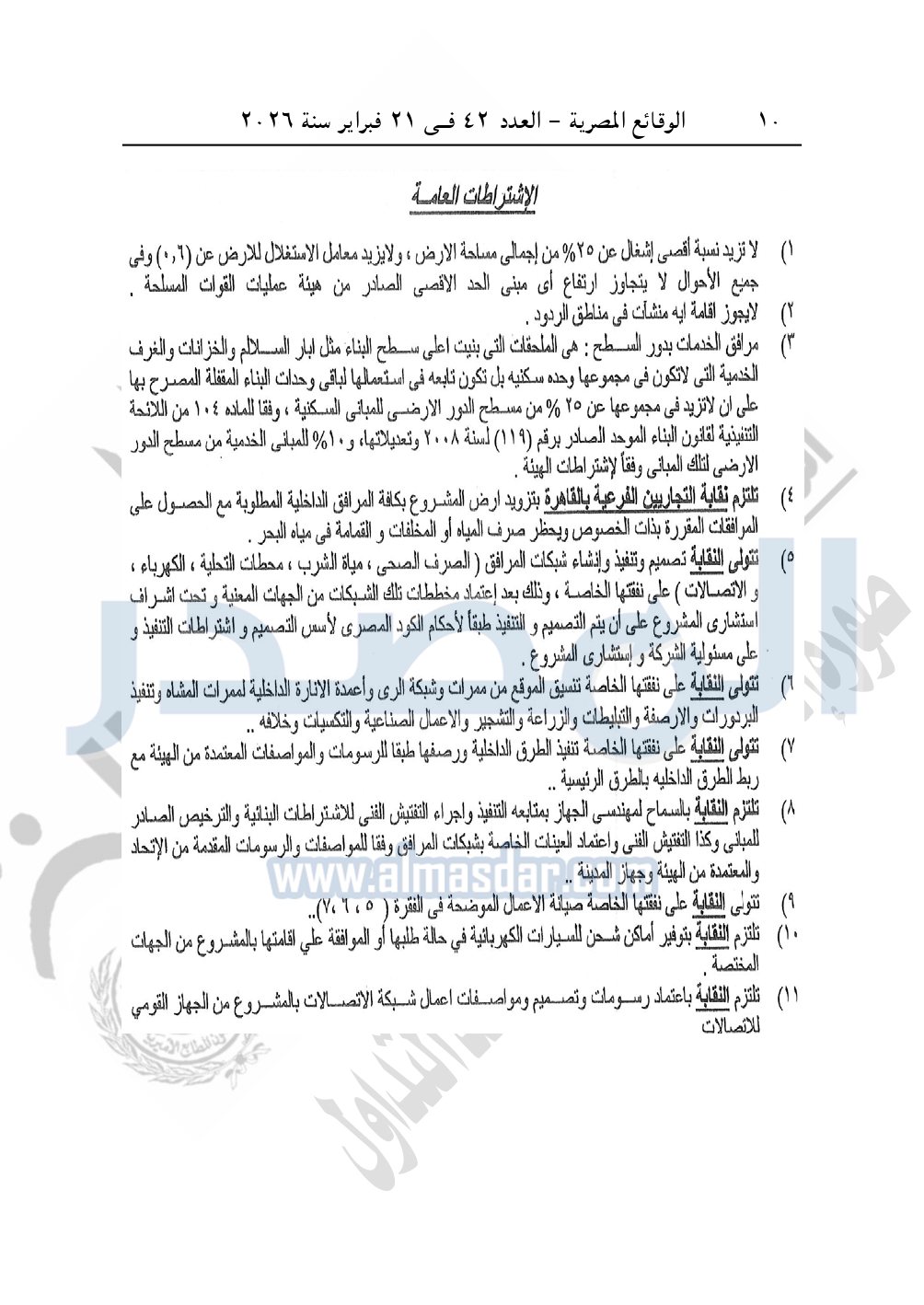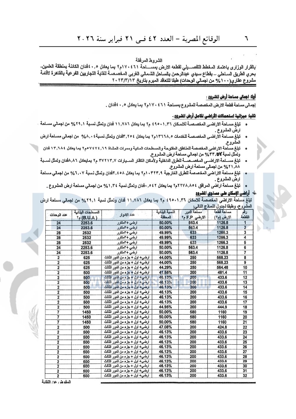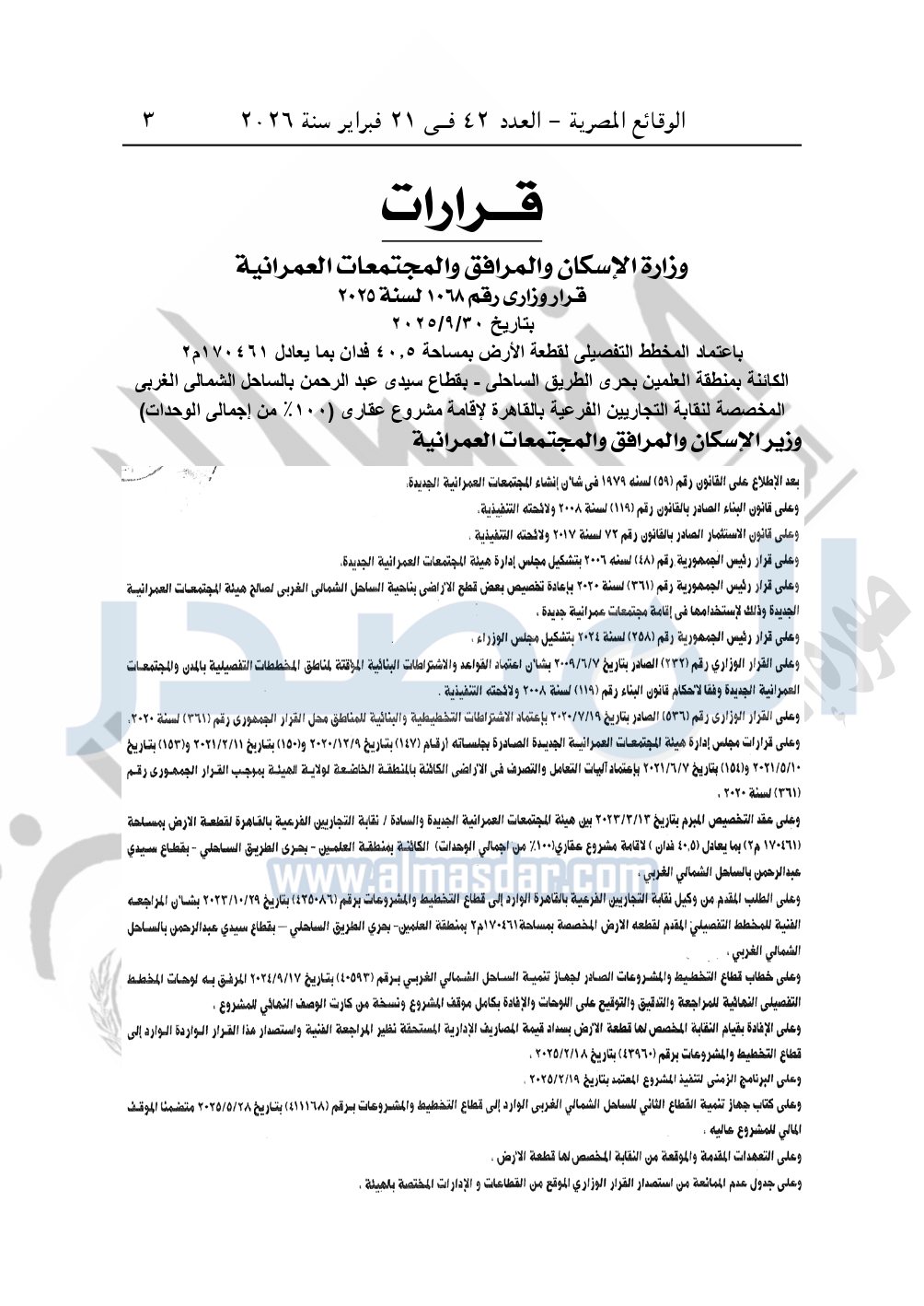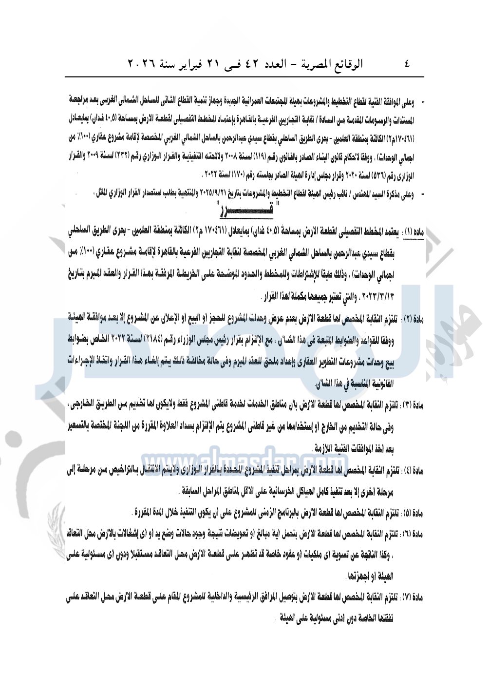 نشرت الوقائع المصرية، في العدد 42، الصادر في 21 فبراير سنة 2026، قرار وزارة الإسكان والمرافق والمجتمعات العمرانية، رقم 1068 لسنة 2025 بتاريخ 30-9-2025، بشأن اعتماد المخطط التفصيلى لقطعة الأرض بمساحة 40.5 فدان بما يعادل 170461م2 الكائنة بمنطقة العلمين بحرى الطريق الساحلى - بقطاع سيدى عبد الرحمن بالساحل الشمالي الغربي المخصصة لنقابة التجاريين الفرعية بالقاهرة لإقامة مشروع عقارى "100% من إجمالى الوحدات".