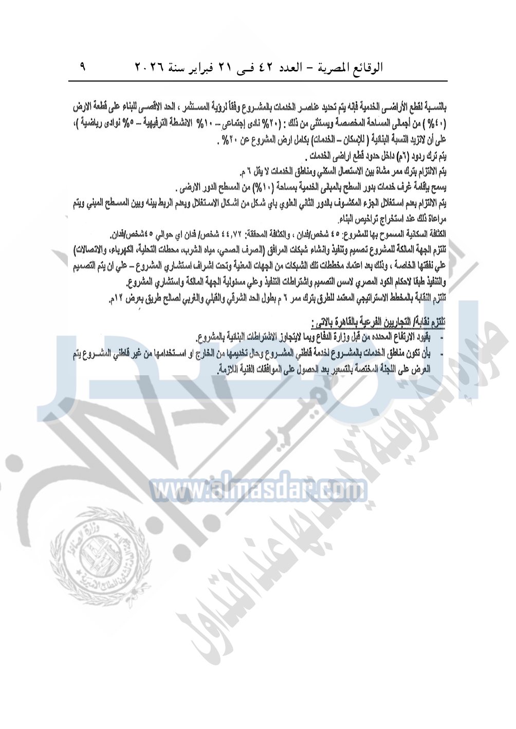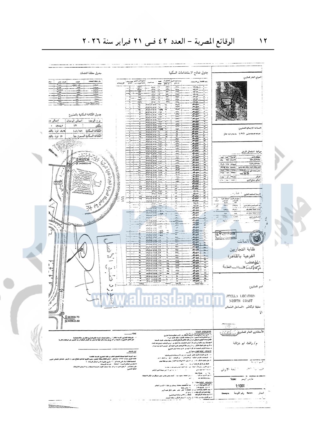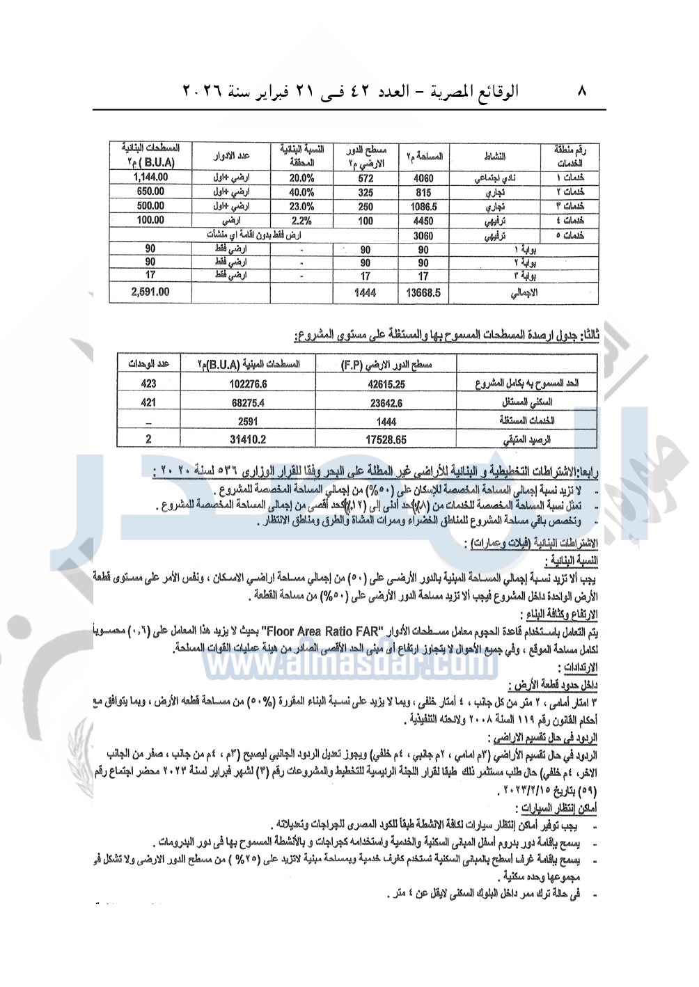 نشرت الوقائع المصرية، في العدد 42، الصادر في 21 فبراير سنة 2026، قرار وزارة الإسكان والمرافق والمجتمعات العمرانية، رقم 1068 لسنة 2025 بتاريخ 30-9-2025، بشأن اعتماد المخطط التفصيلى لقطعة الأرض بمساحة 40.5 فدان بما يعادل 170461م2 الكائنة بمنطقة العلمين بحرى الطريق الساحلى - بقطاع سيدى عبد الرحمن بالساحل الشمالي الغربي المخصصة لنقابة التجاريين الفرعية بالقاهرة لإقامة مشروع عقارى "100% من إجمالى الوحدات".