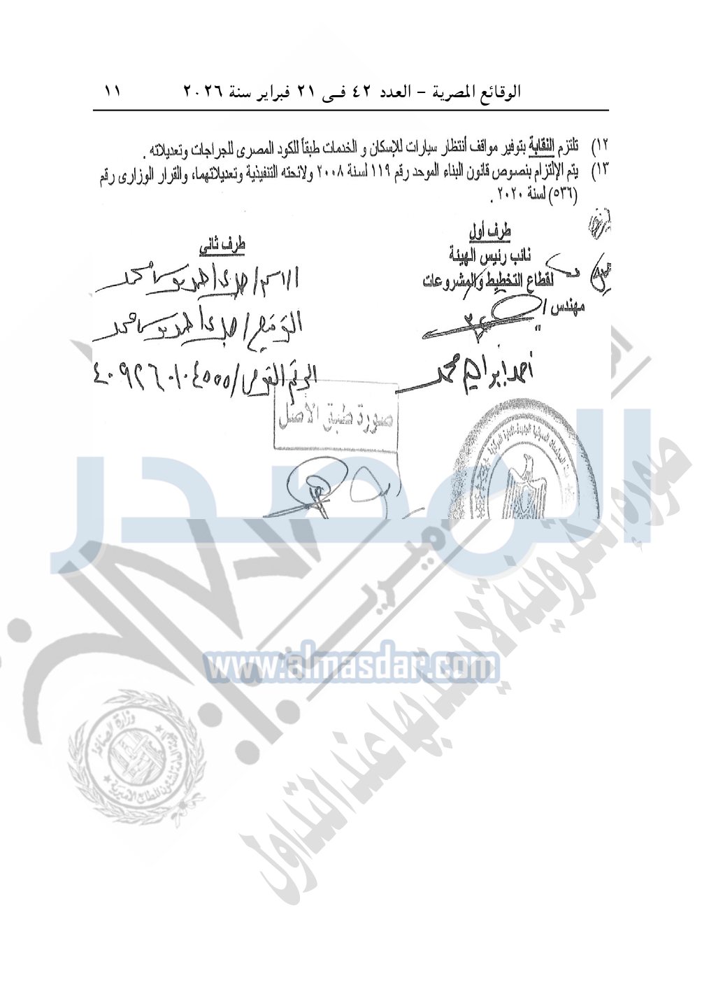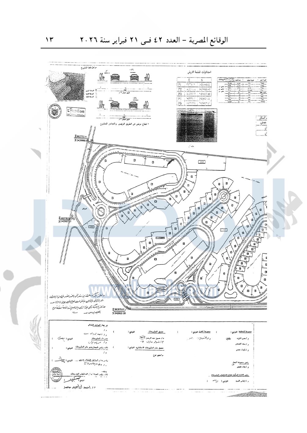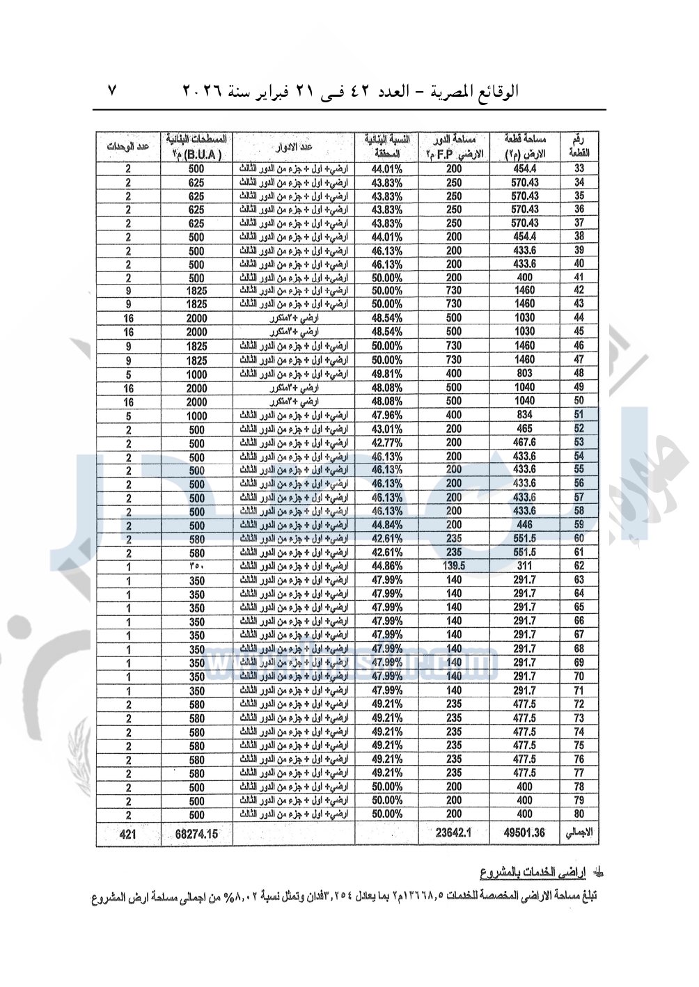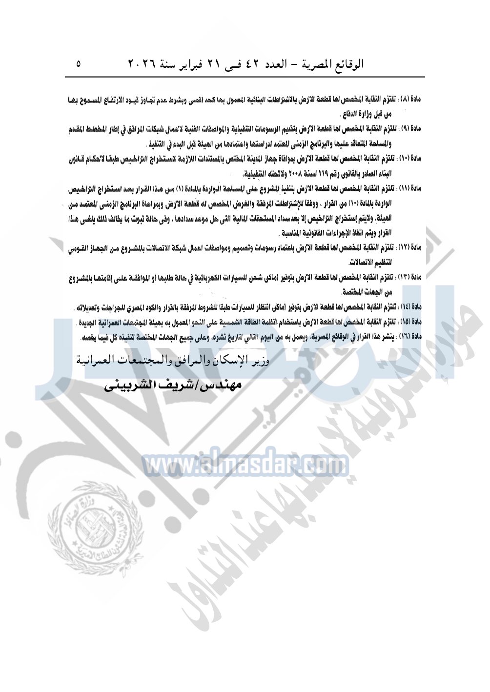 نشرت الوقائع المصرية، في العدد 42، الصادر في 21 فبراير سنة 2026، قرار وزارة الإسكان والمرافق والمجتمعات العمرانية، رقم 1068 لسنة 2025 بتاريخ 30-9-2025، بشأن اعتماد المخطط التفصيلى لقطعة الأرض بمساحة 40.5 فدان بما يعادل 170461م2 الكائنة بمنطقة العلمين بحرى الطريق الساحلى - بقطاع سيدى عبد الرحمن بالساحل الشمالي الغربي المخصصة لنقابة التجاريين الفرعية بالقاهرة لإقامة مشروع عقارى "100% من إجمالى الوحدات".