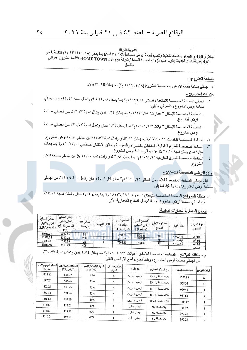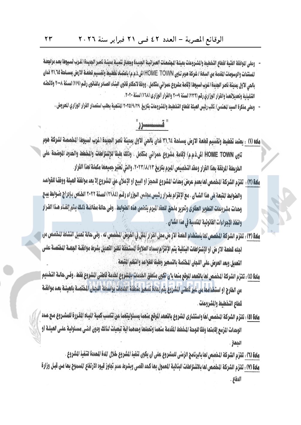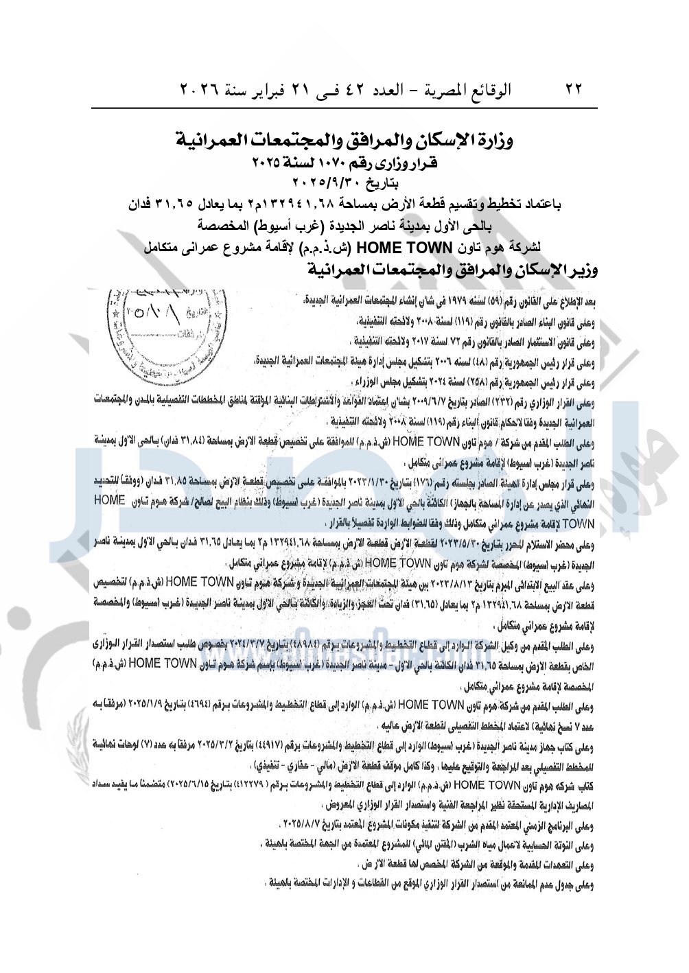 نشرت الوقائع المصرية، في العدد 42، الصادر في 21 فبراير سنة 2026، قرار وزارة الإسكان والمرافق والمجتمعات العمرانية، رقم 1070 لسنة 2025 بتاريخ 30-9-2025، بشأن اعتماد تخطيط وتقسيم قطعة الأرض بمساحة 132941.68م2 بما يعادل 31.65 فدان بالحي الأول بمدينة ناصر الجديدة "غرب أسيوط" المخصصة لشركة هوم تاون HOME TOWN "ش.ذ.م.م" لإقامة مشروع عمراني متكامل.