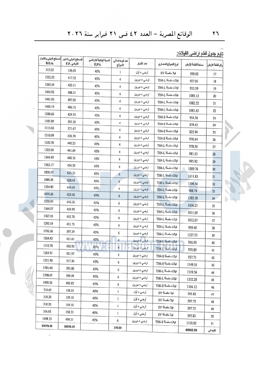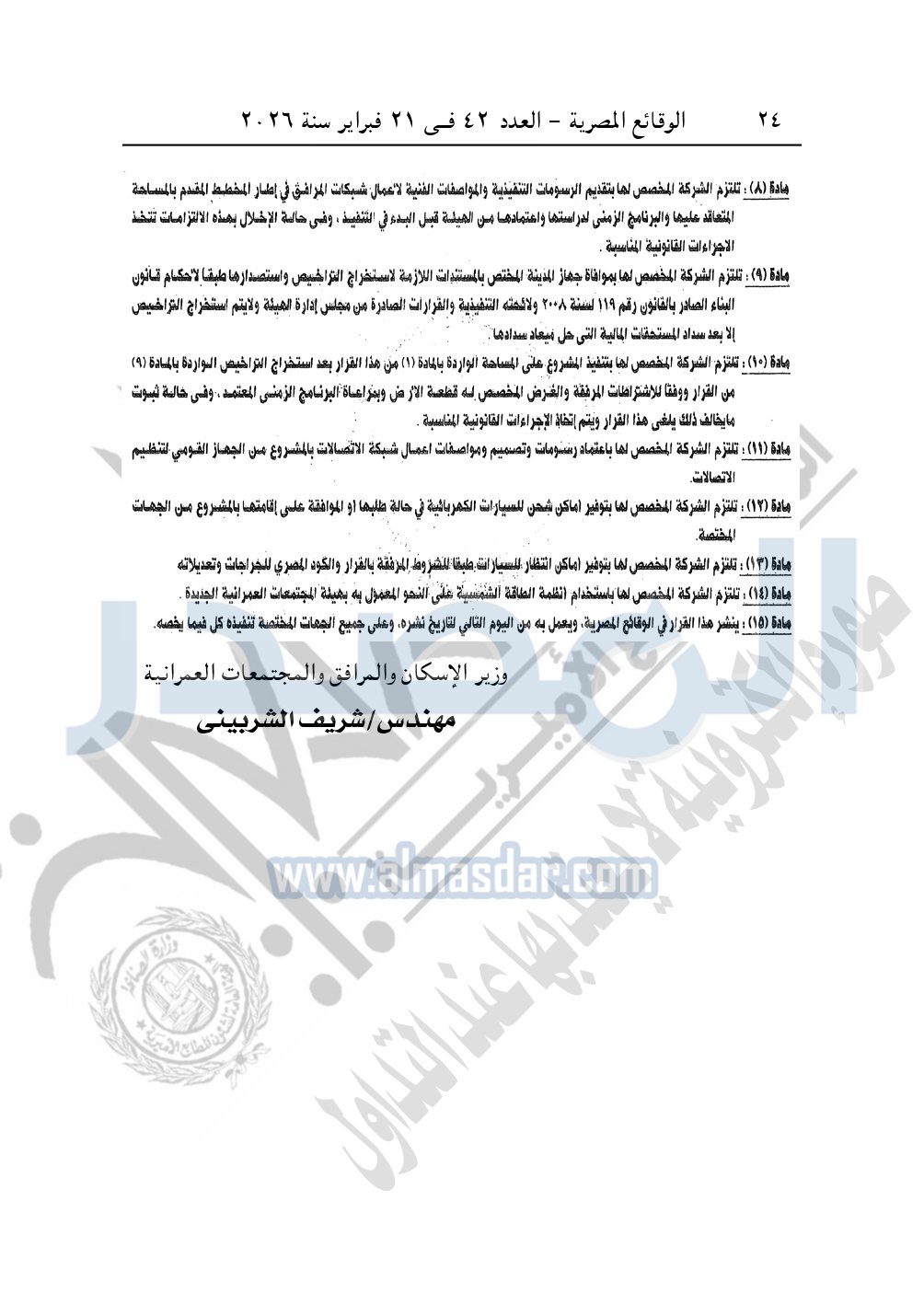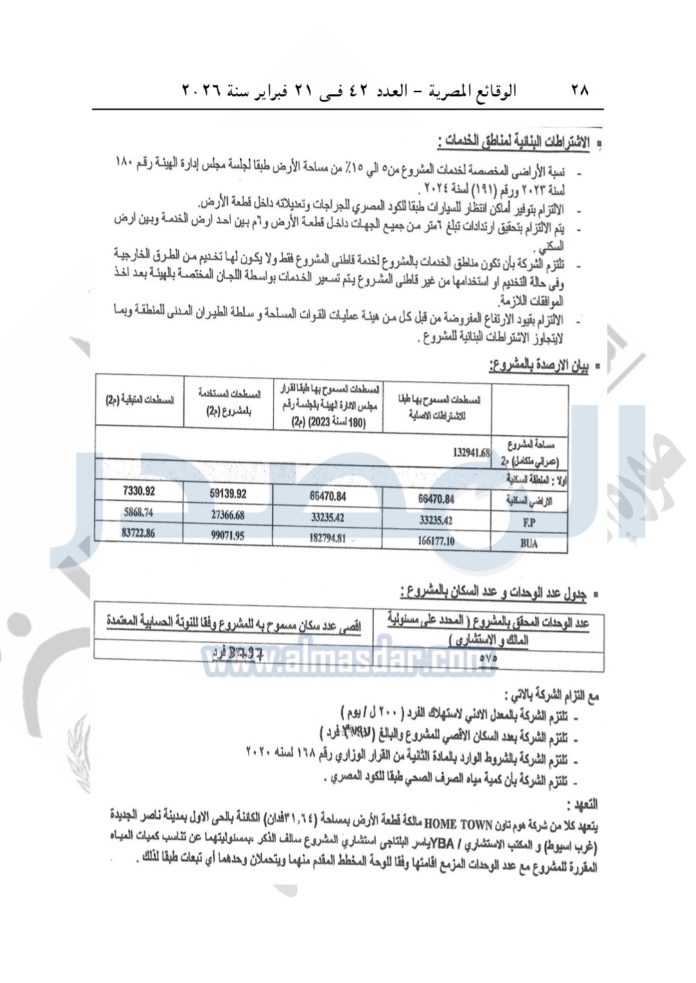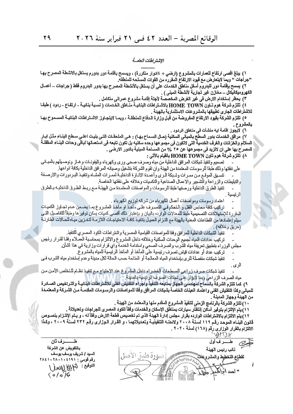 نشرت الوقائع المصرية، في العدد 42، الصادر في 21 فبراير سنة 2026، قرار وزارة الإسكان والمرافق والمجتمعات العمرانية، رقم 1070 لسنة 2025 بتاريخ 30-9-2025، بشأن اعتماد تخطيط وتقسيم قطعة الأرض بمساحة 132941.68م2 بما يعادل 31.65 فدان بالحي الأول بمدينة ناصر الجديدة "غرب أسيوط" المخصصة لشركة هوم تاون HOME TOWN "ش.ذ.م.م" لإقامة مشروع عمراني متكامل.