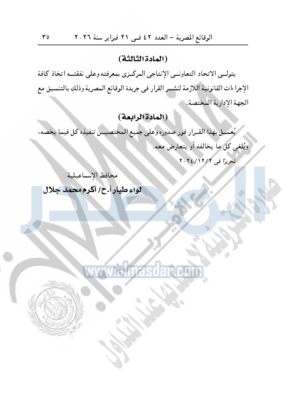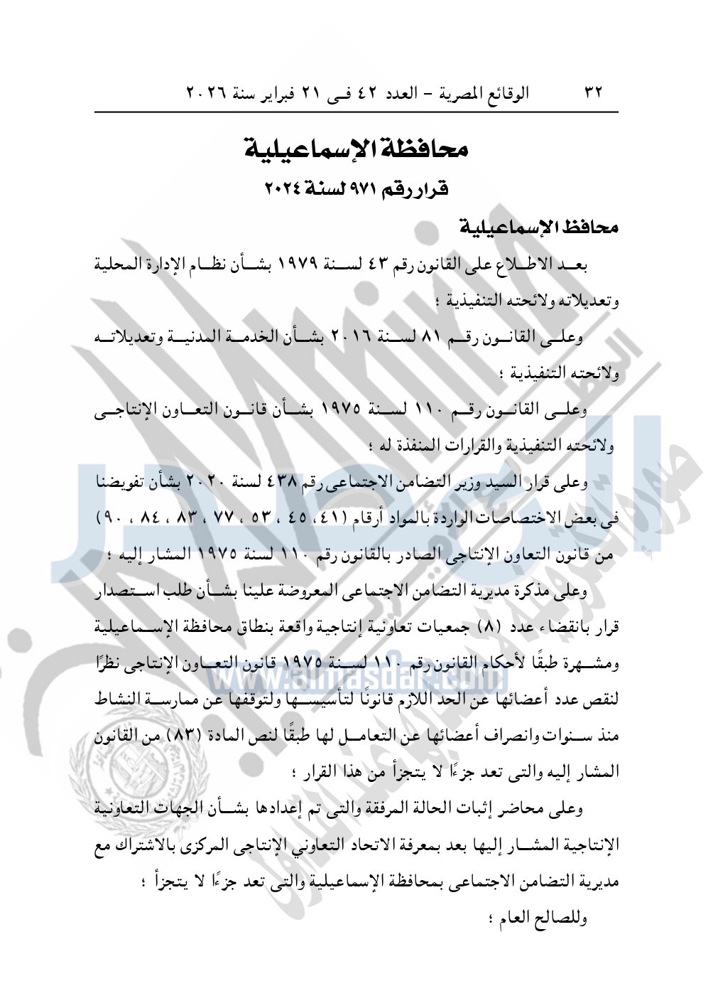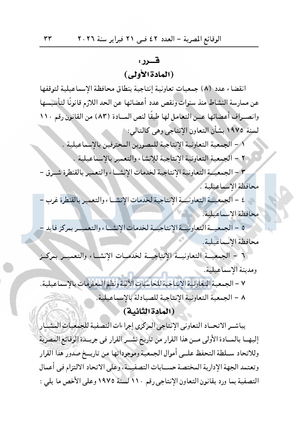 نشرت الوقائع المصرية، في العدد 42، الصادر في 21 فبراير سنة 2026، قرار محافظة الإسماعيلية، رقم 971 لسنة 2024، بشأن انقضاء 8 جمعيات تعاونية إنتاجية بمحافظة الإسماعيلية.