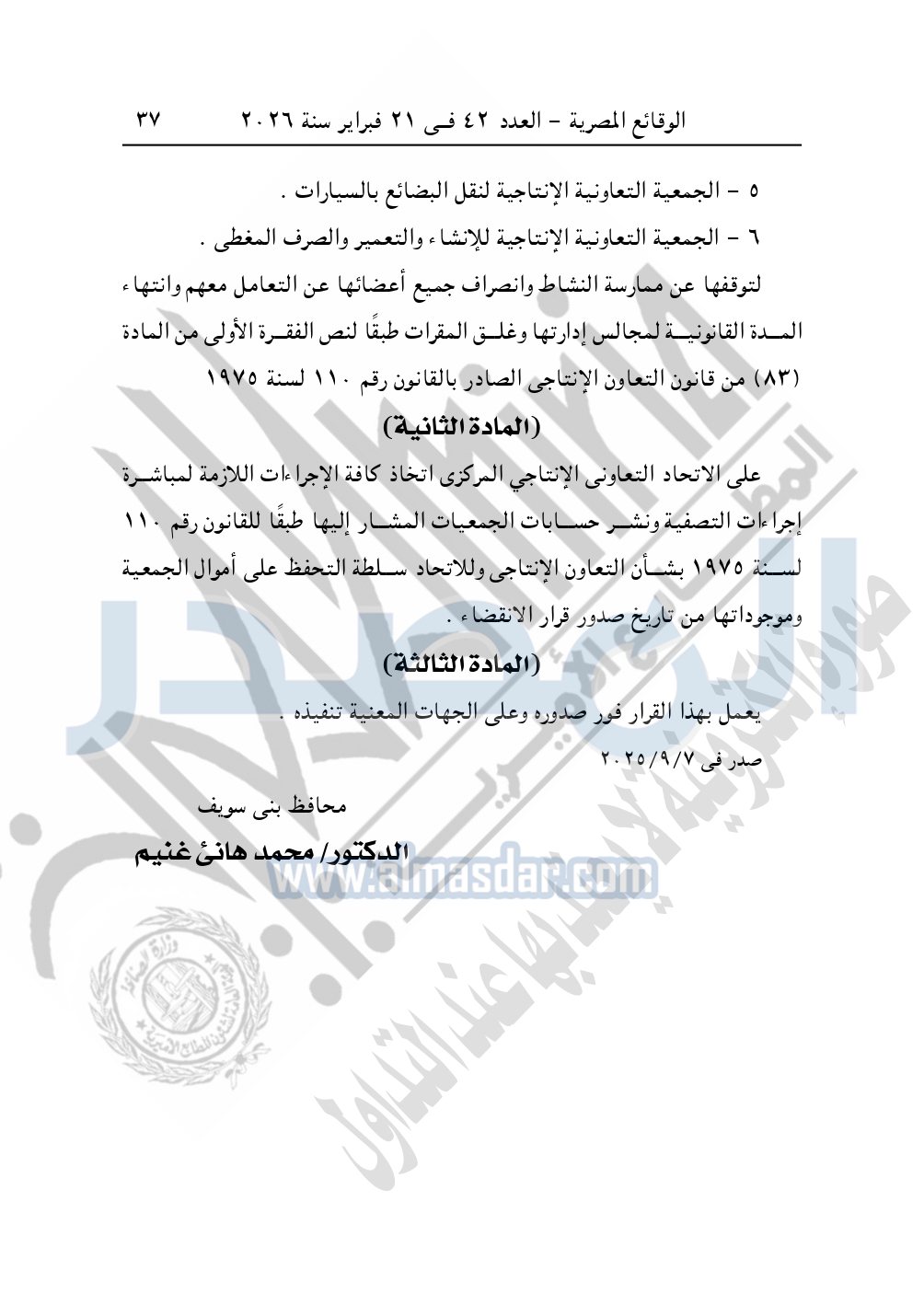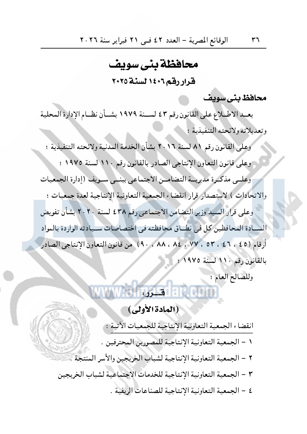 كما نشرت الوقائع المصرية، في العدد 42، الصادر في 21 فبراير سنة 2026، قرار محافظة بنى سويف، رقم 1406 لسنة 2025، بشأن انقضاء 6 جمعيات تعاونية إنتاجية بمحافظة بنى سويف.