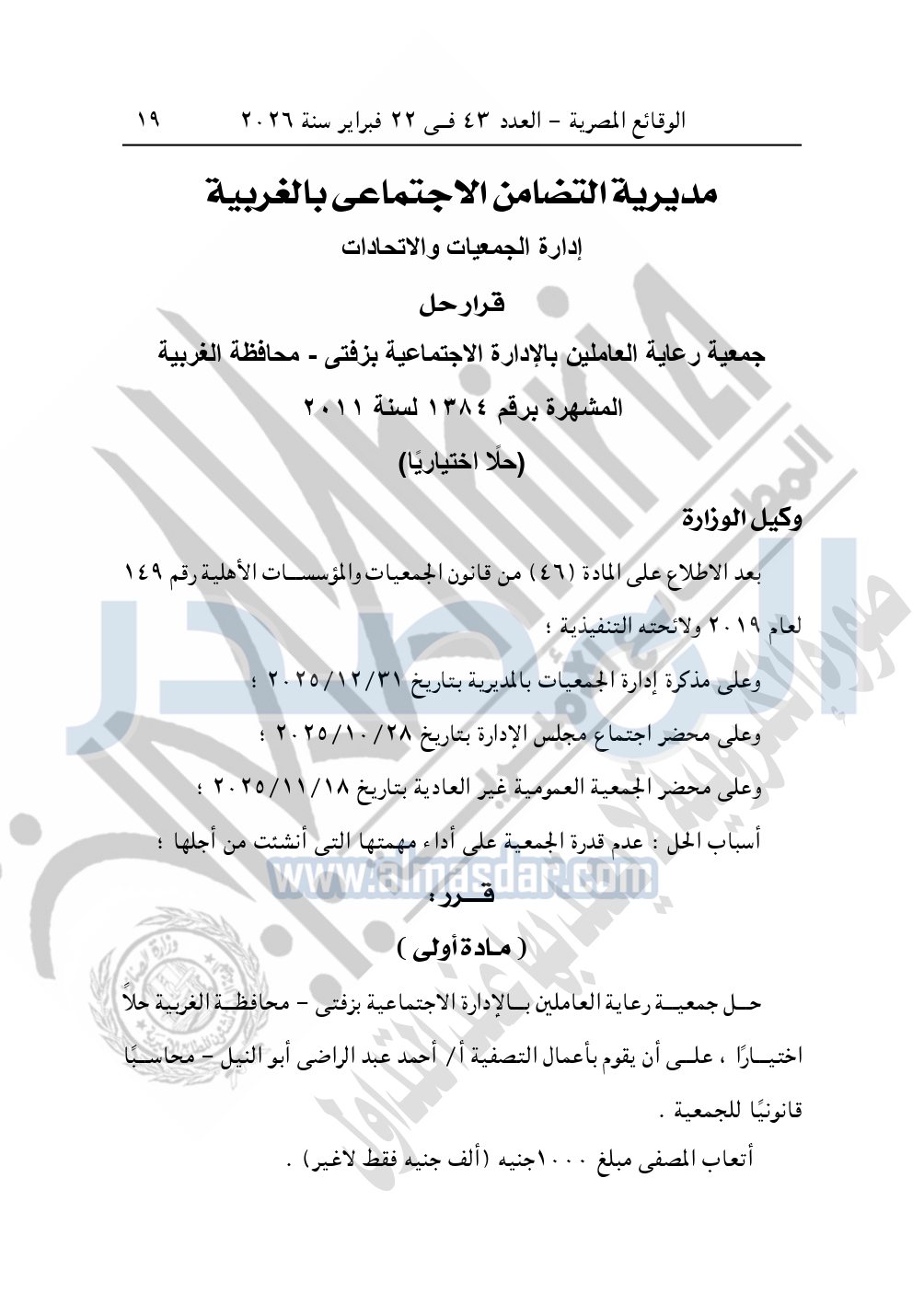 نشرت الوقائع المصرية في العدد 43، بتاريخ 22 نوفمبر 2026، قرار مديرية التضامن الاجتماعي بالغربية، الخاص بحل جمعية رعاية العاملين بالإدارة الاجتماعية بزفتي - محافظة الغربية، المشهرة برقم 1384 لسنة 2011 "حلا اختياريا".