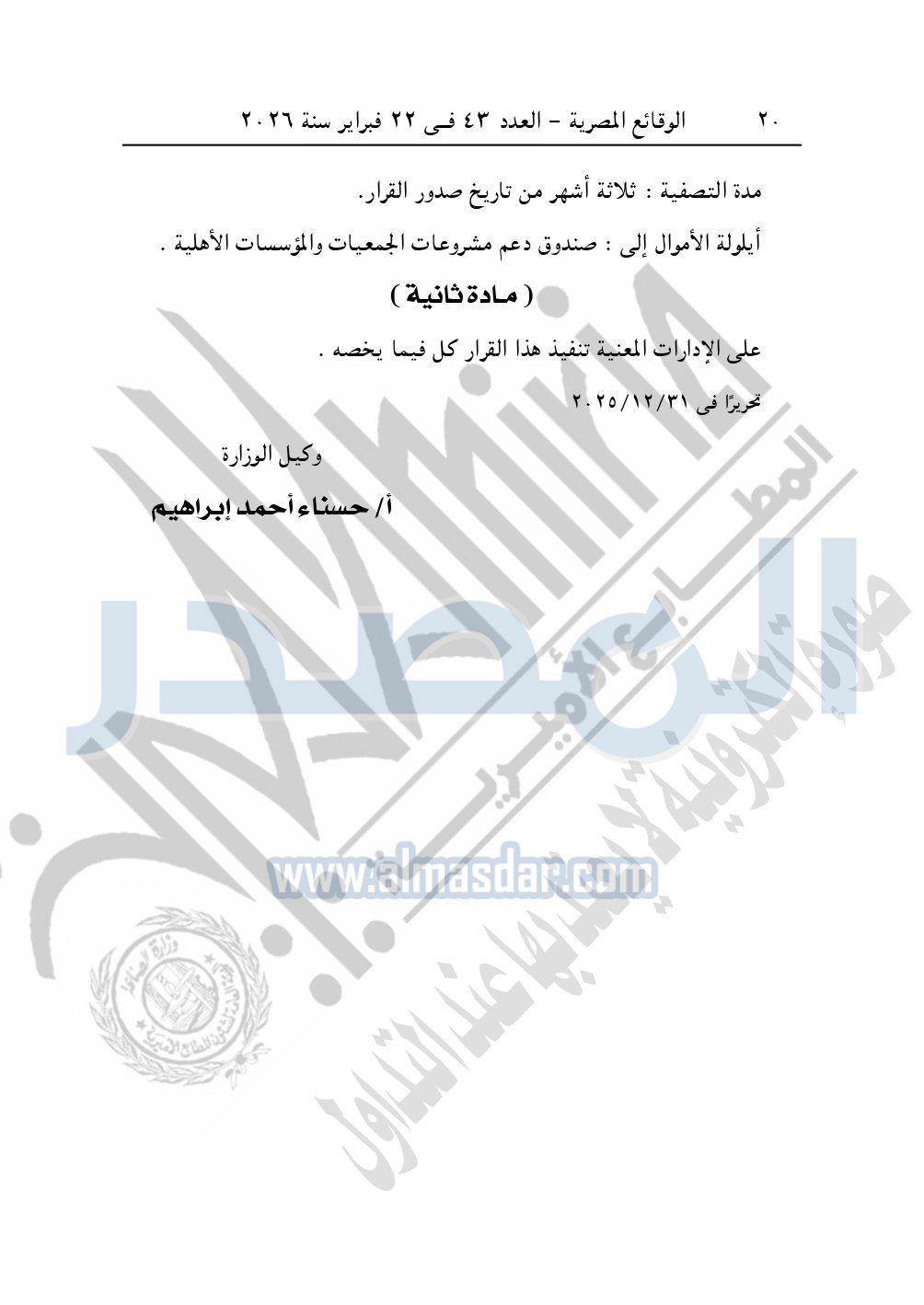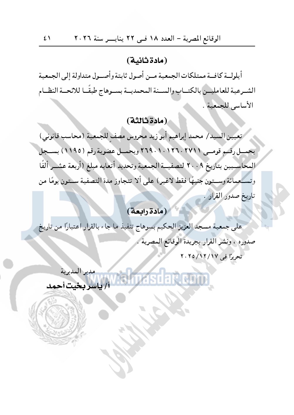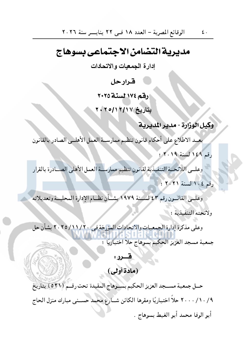 وأيضا نشرت الوقائع المصرية في العدد 18، بتاريخ 22 يناير 2026، قرار مديرية التضامن الاجتماعي بسوهاج، الخاص بحل جمعية مسجد العزيز الحكيم بسوهاج، المشهرة برقم 174 لسنة 2025، بتاريخ 17-12-2025.