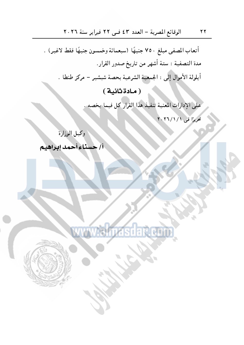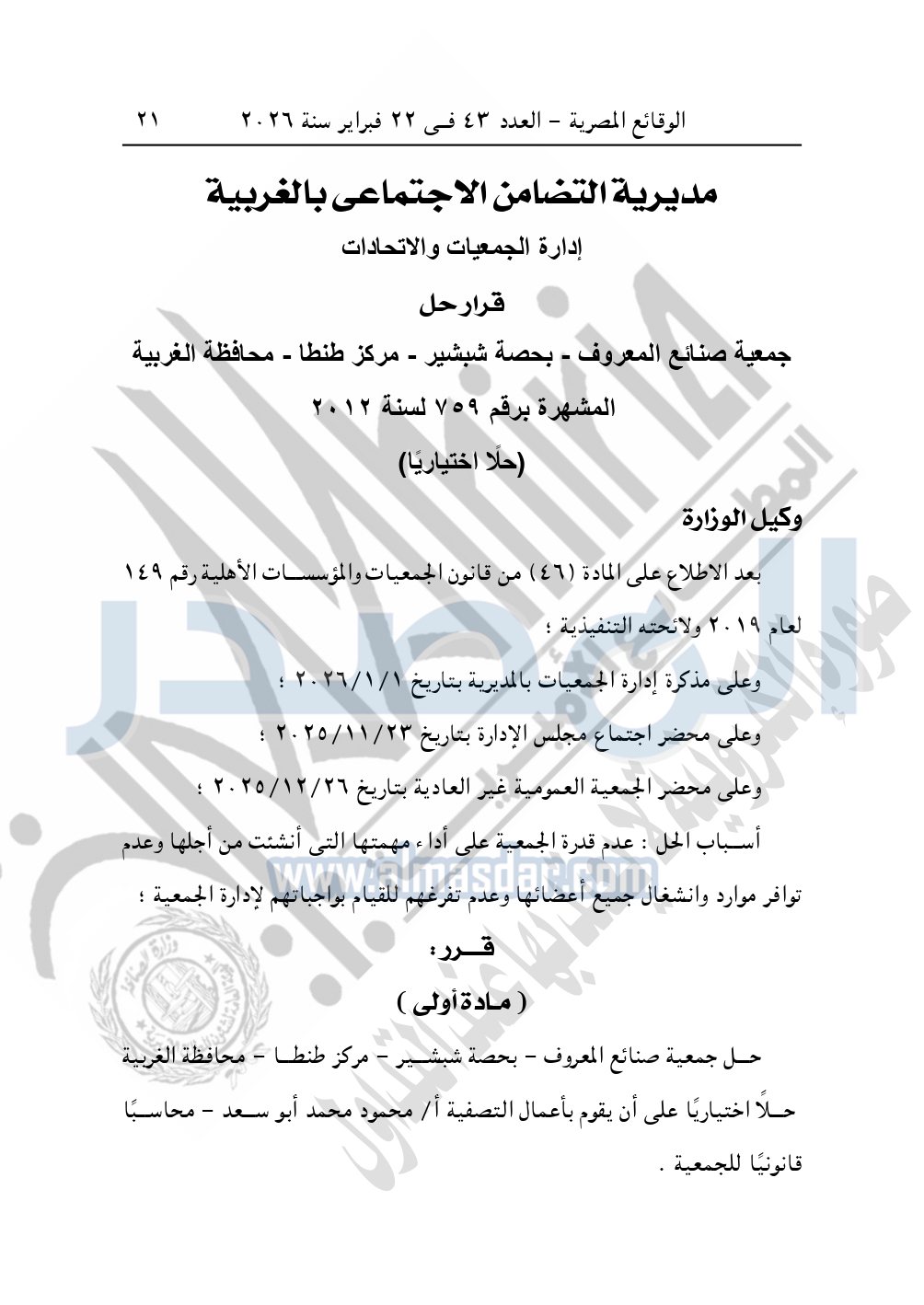 كما نشرت الوقائع المصرية في العدد 43، بتاريخ 22 نوفمبر 2026، قرار مديرية التضامن الاجتماعي بالغربية، الخاص بحل جمعية صنائع المعروف – بحصة شبشير – مركز طنطا - محافظة الغربية، المشهرة برقم 759 لسنة 2012 "حلا اختياريا".