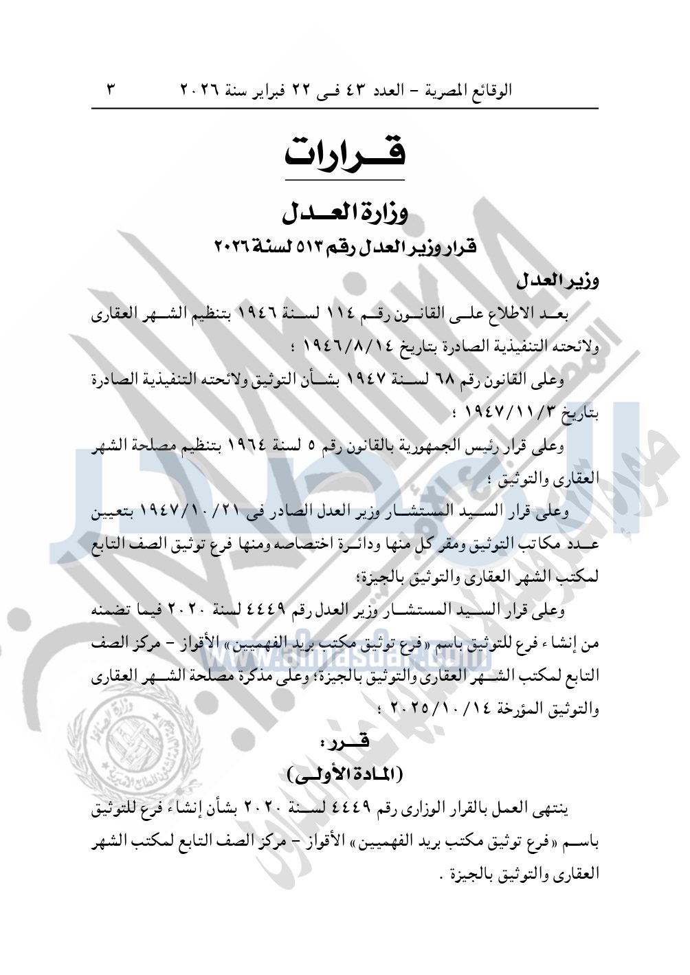 نشرت الوقائع المصرية، في العدد 43، بتاريخ 22 فبراير 2026، قرار وزارة العدل، رقم 513 لسنة 2026، بشأن إنشاء فرع للتوثيق باسم «فرع توثيق مكتب بريد الفهميين».
