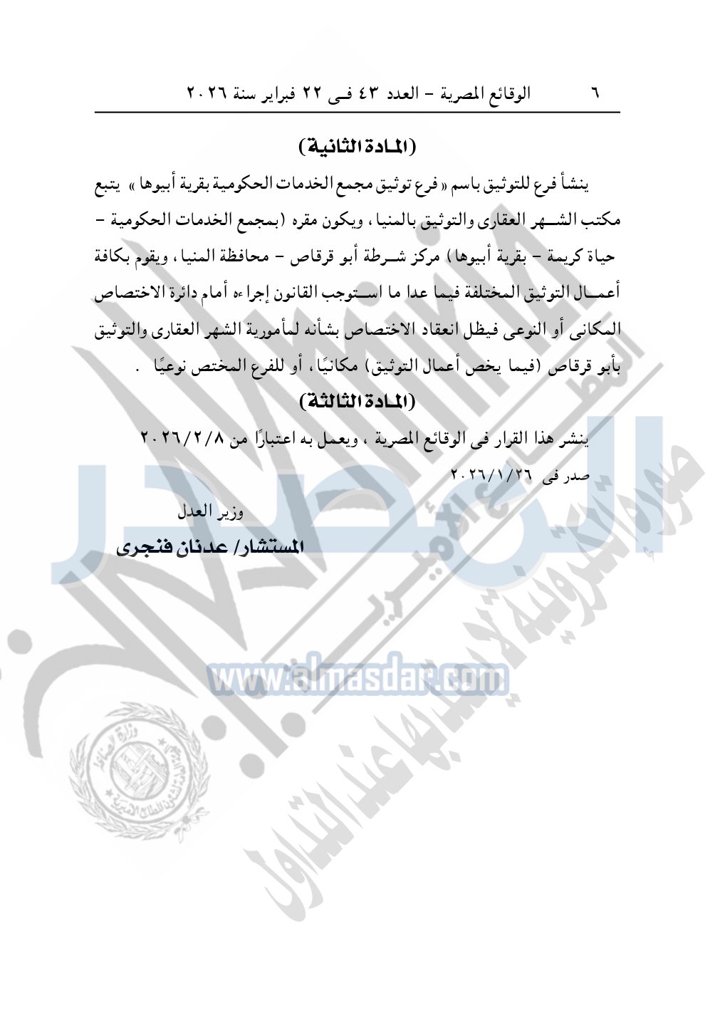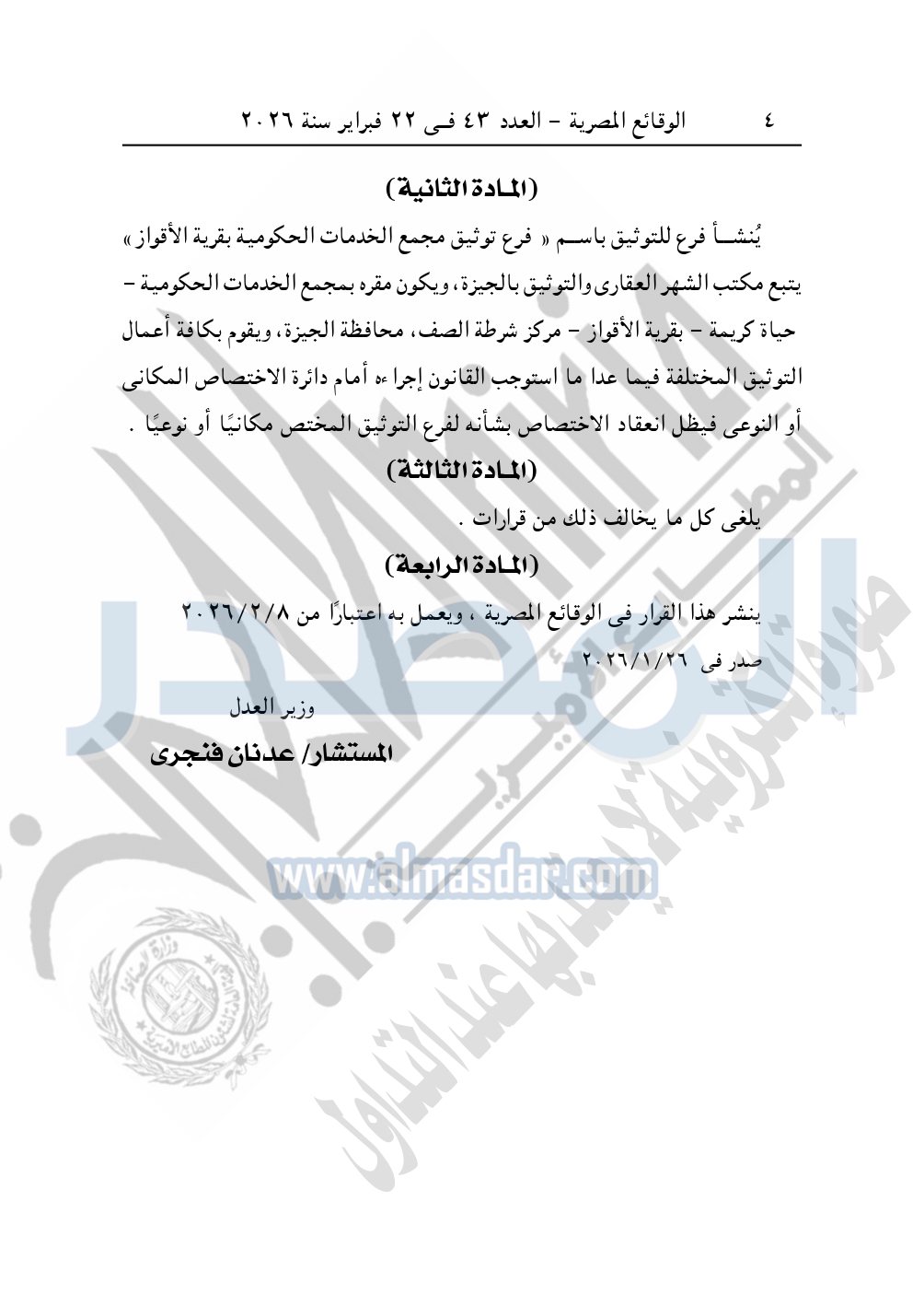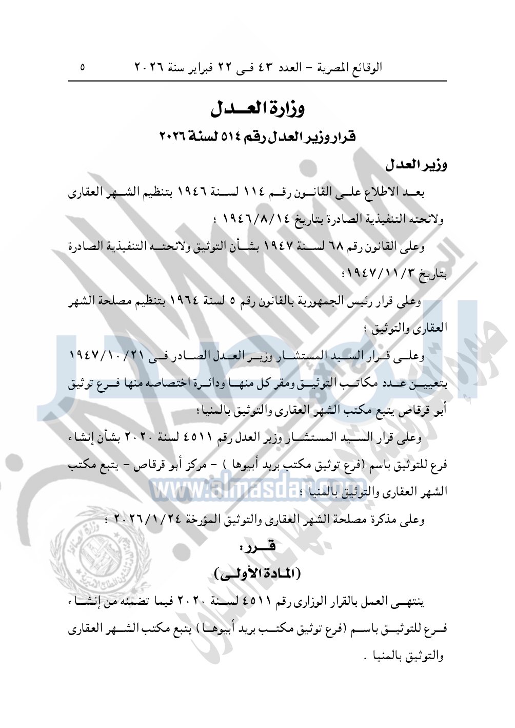 كما نشرت الوقائع المصرية، في العدد 43، بتاريخ 22 فبراير 2026، قرار وزارة العدل، رقم 514 لسنة 2026، بشأن إنشاء فرع للتوثيق باسم "فرع توثيق مكتب بريد أبيوها".