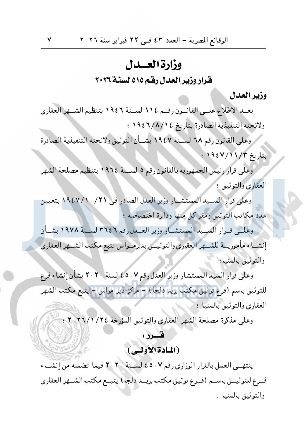وأيضا نشرت الوقائع المصرية، في العدد 43، بتاريخ 22 فبراير 2026، قرار وزارة العدل، رقم 515 لسنة 2026، بشأن إنشاء فرع للتوثيق باسم "فرع توثيق مكتب بريد دلجا".