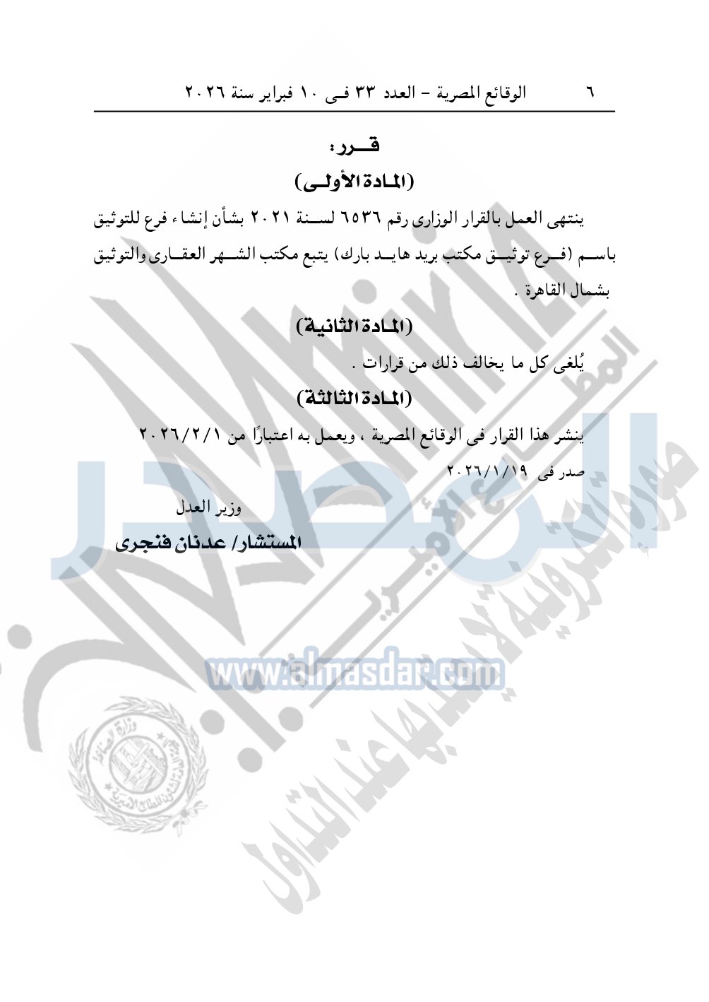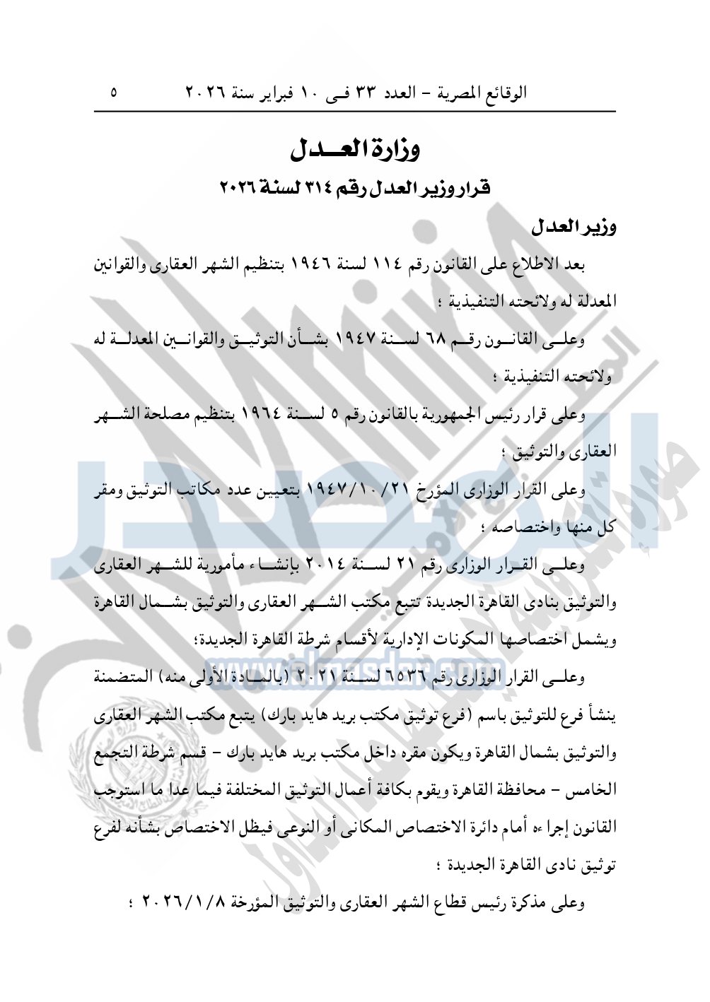 ونشرت الوقائع المصرية، في العدد 33، بتاريخ 10 فبراير 2026، قرار وزارة العدل، رقم 314 لسنة 2026، بشأن إنشاء فرع للتوثيق باسم "فرع توثیق مکتب برید هايد بارك".