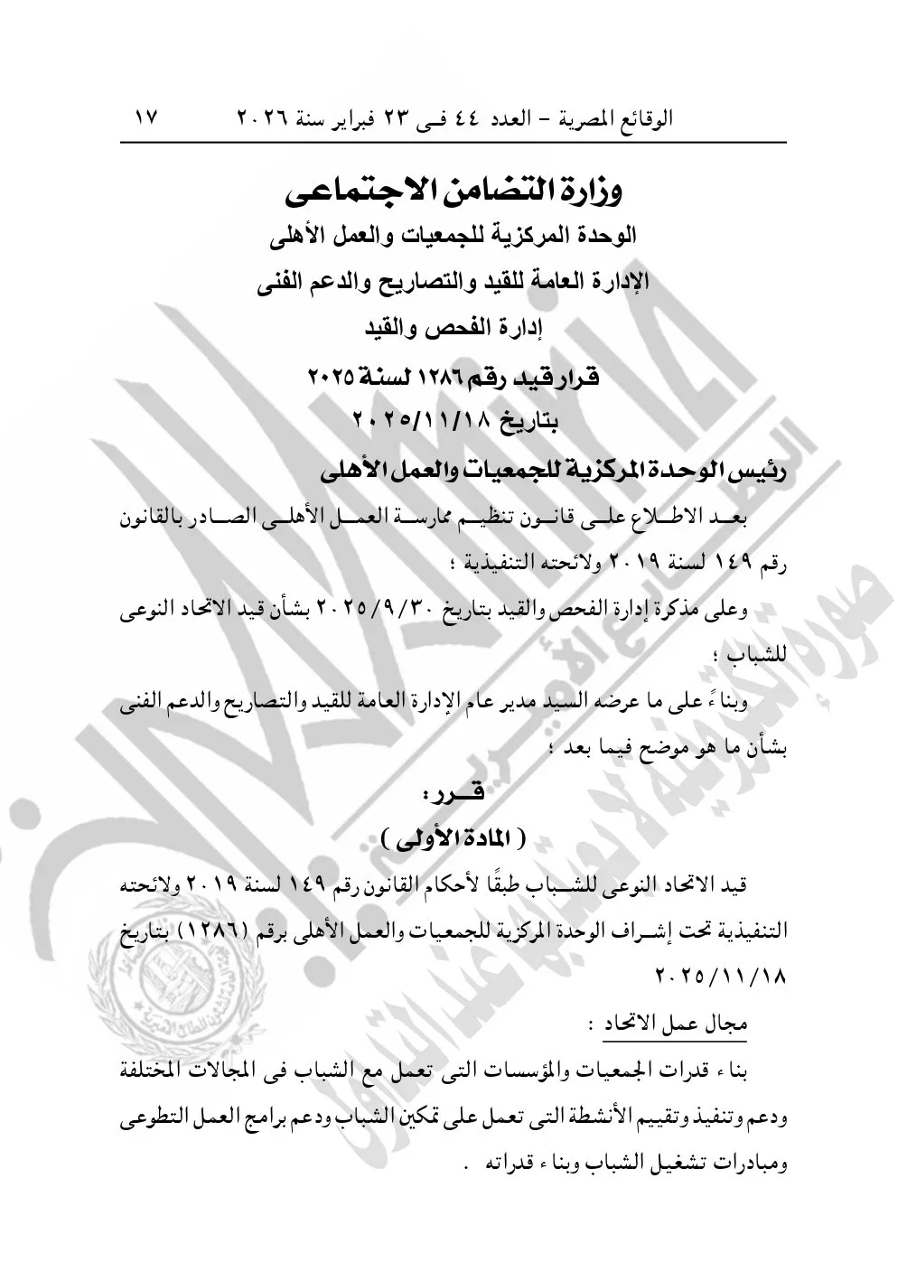 نشرت الوقائع المصرية، في العدد 44، بتاريخ 18 فبراير 2026، قرار وزارة التضامن الاجتماعي، قيد رقم 1286 لسنة 2025، بتاريخ 18-11-2025، بشأن قيد الأتحاد النوعي للشباب.