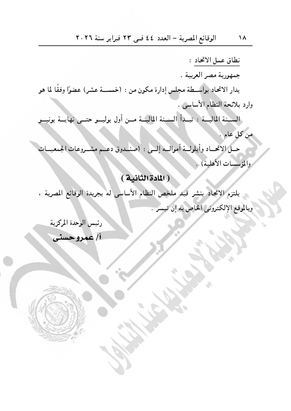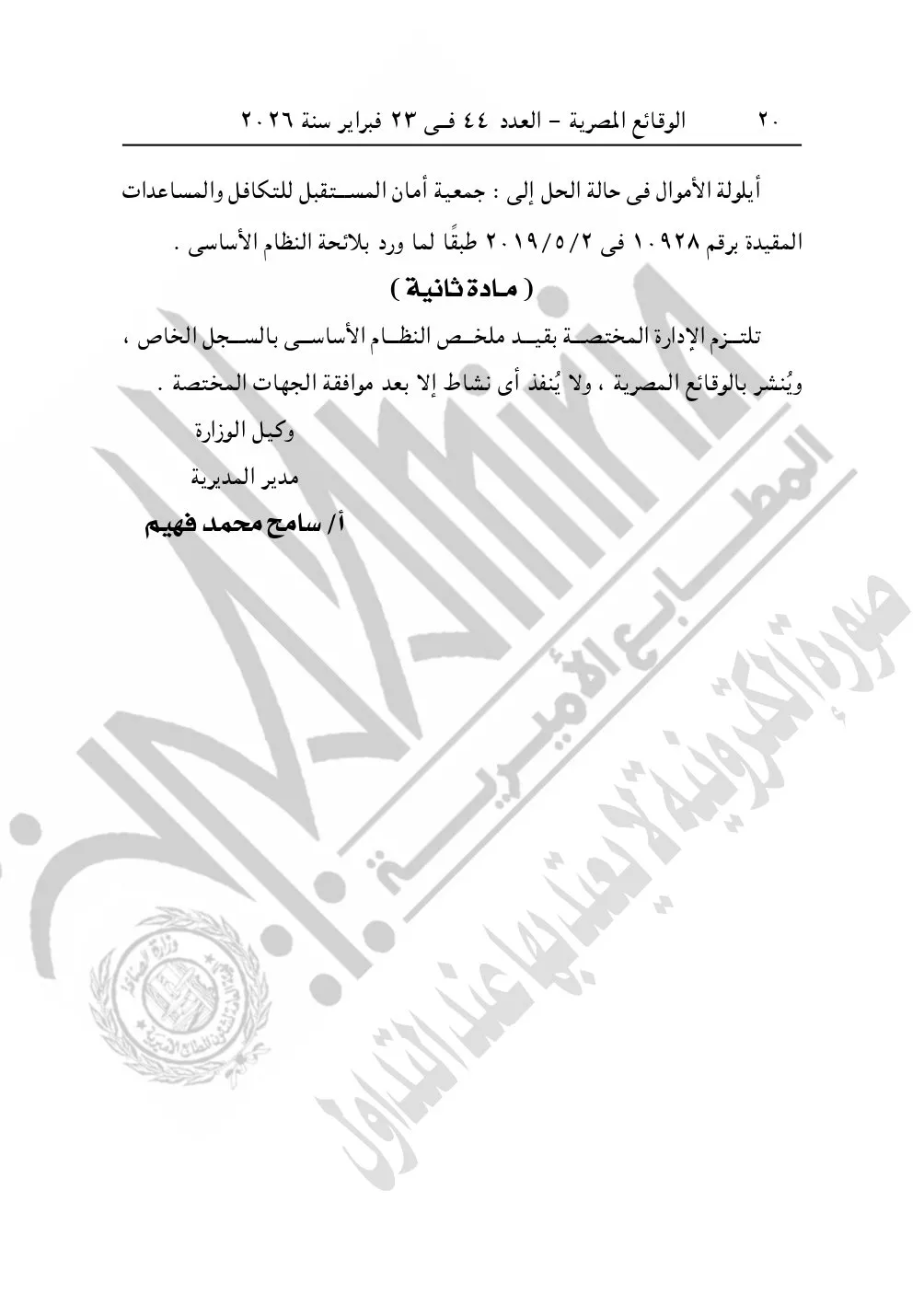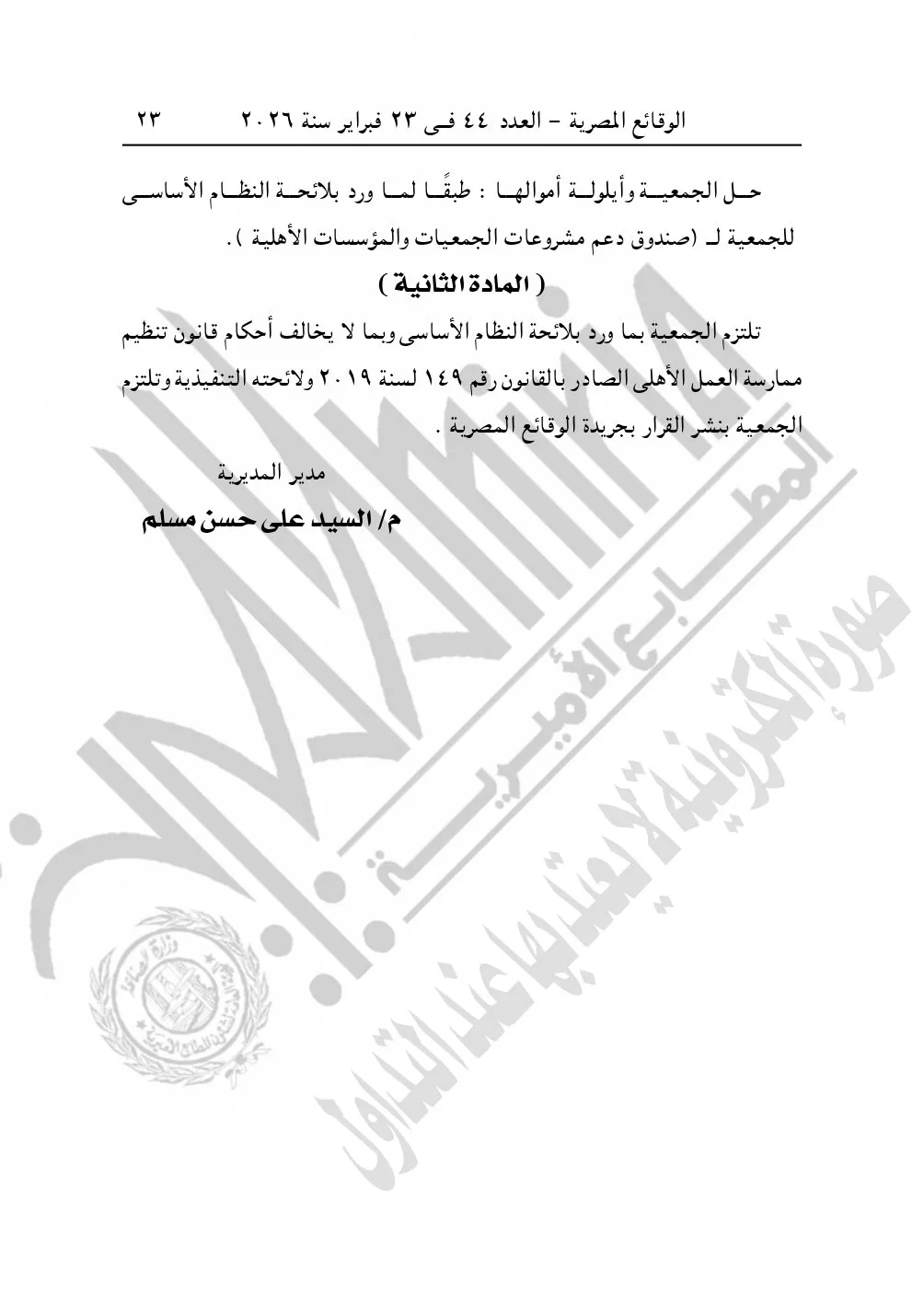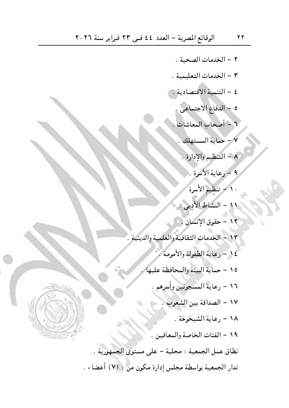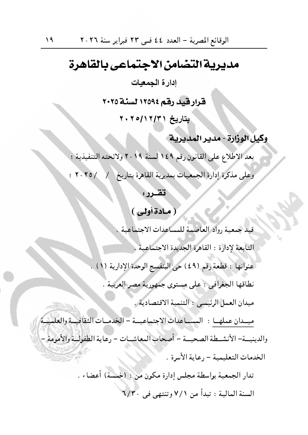 كما نشرت الوقائع المصرية، في العدد 44، بتاريخ 18 فبراير 2026، قرار مديرية التضامن الاجتماعي بالقاهرة، قيد رقم 12594 لسنة 2025، بتاريخ 31-12-2025، بشأن قيد جمعية رواد العاصمة للمساعدات الاجتماعية.