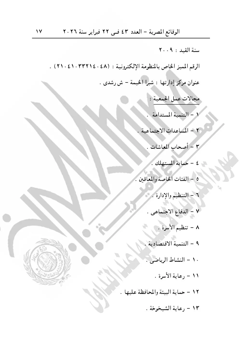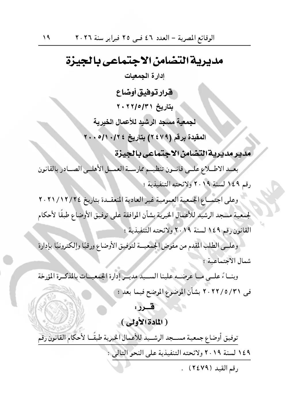 نشرت الوقائع المصرية في العدد 46، بتاريخ 25 فبراير 2026، قرار مديرية التضامن الاجتماعي بالجيزة، بشأن توفيق أوضاع جمعية مسجد الرشيد للأعمال الخيرية، المقيدة برقم "2479" بتاريخ 24-10-2005.