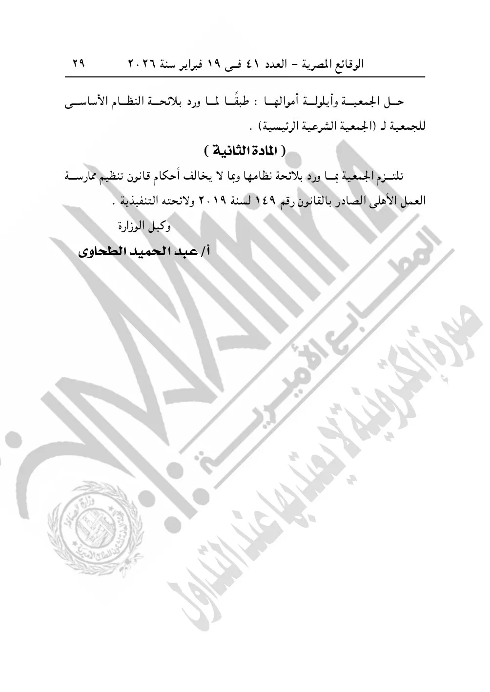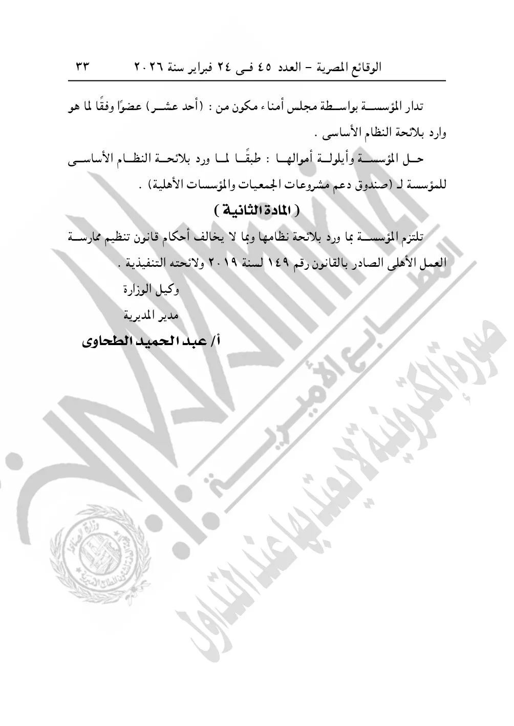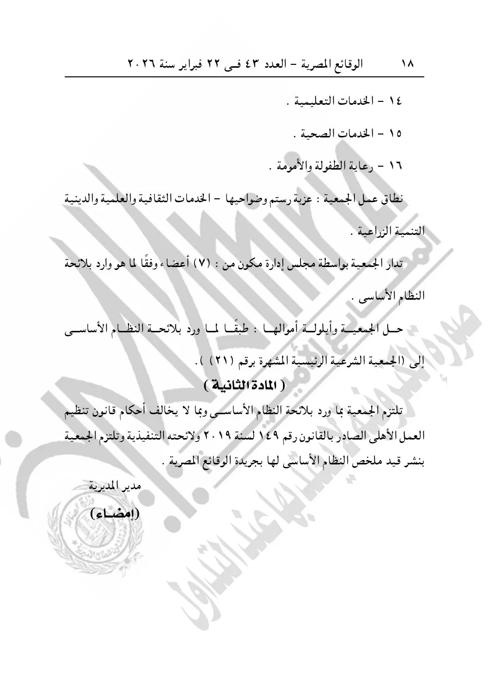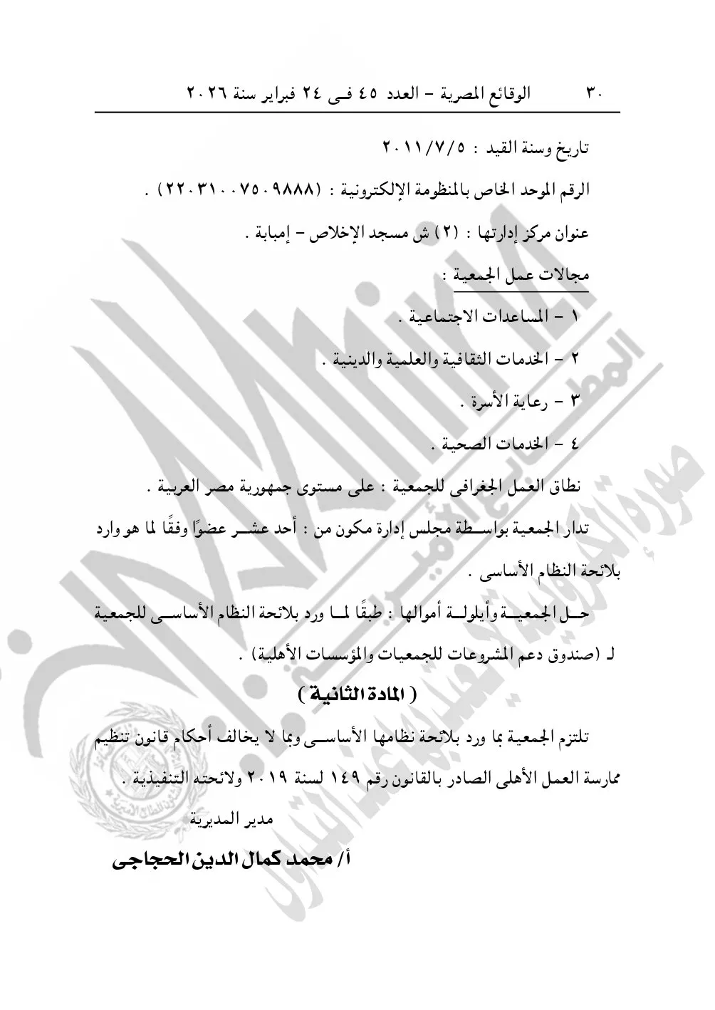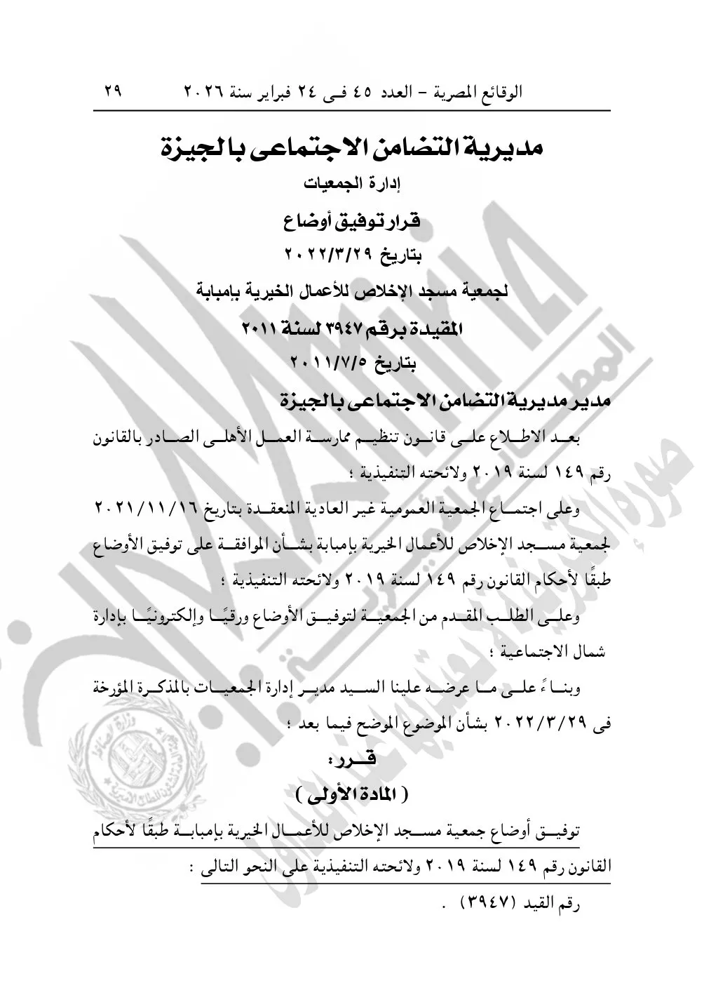 كما نشرت الوقائع المصرية في العدد 45، بتاريخ 24 فبراير 2026، قرار مديرية التضامن الاجتماعي بالجيزة، بشأن توفيق أوضاع جمعية مسجد الإخلاص للأعمال الخيرية بإمبابة، المقيدة برقم "3947" لسنة 2011، بتاريخ 5-7-2011.
