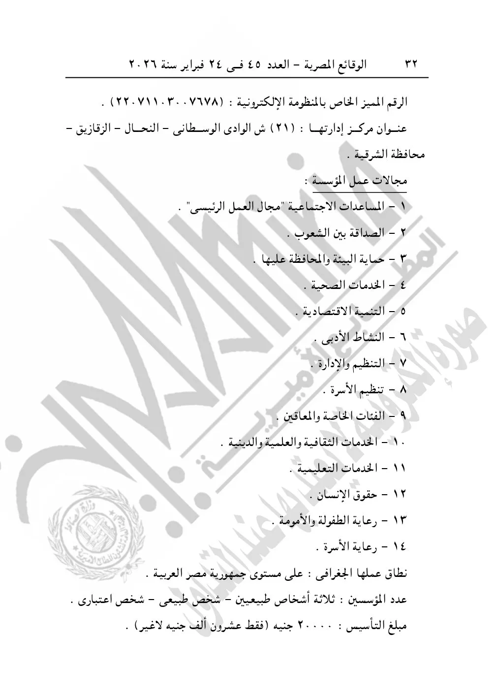 وأيضا نشرت الوقائع المصرية في العدد 45، بتاريخ 24 فبراير 2026، قرار مديرية التضامن الاجتماعي بالشرقية، بشأن توفيق أوضاع مؤسسة النورس لذوي الاحتياجات الخاصة والتعليم التطبيقي، المقيدة برقم "3293"، بتاريخ 15-1-2015.