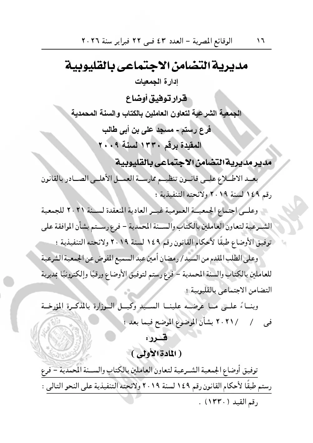 كما نشرت الوقائع المصرية في العدد 43، بتاريخ 22 فبراير 2026، قرار مديرية التضامن الاجتماعي بالقليوبية، بشأن توفيق أوضاع الجمعية الشرعية لتعاون العاملين بالكتاب والسنة المحمدية فرع رستم – مسجد على بن أبي طالب، المقيدة برقم "1330" لسنة 2009.