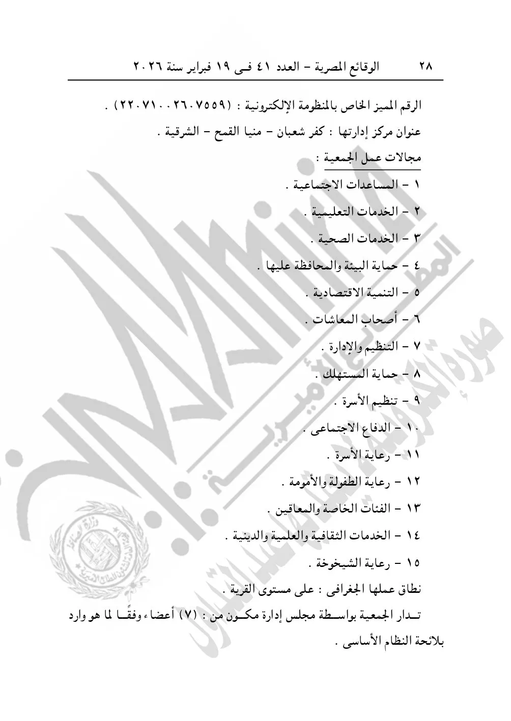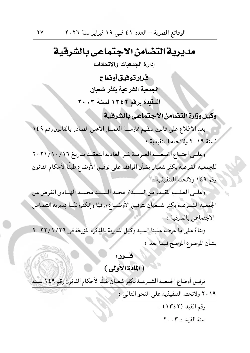 ونشرت الوقائع المصرية في العدد 41، بتاريخ 19 فبراير 2026، قرار مديرية التضامن الاجتماعي بالشرقية، بشأن توفيق أوضاع الجمعية الشرعية بكفر شعبان، المقيدة برقم "1342" لسنة 2003.