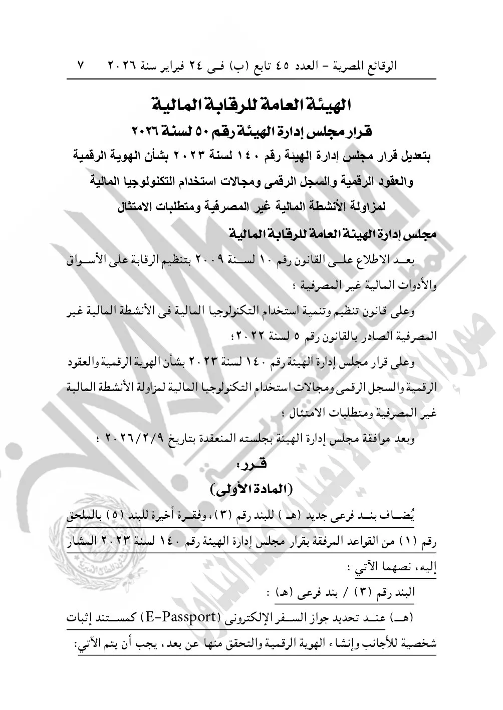 نشرت الوقائع المصرية في العدد 45 تابع "ب"، الصادر في 24 فبراير سنة 2026، قرار الهيئة العامة للرقابة المالية، رقم 50 لسنة 2026، بتعديل قرار مجلس إدارة الهيئة رقم 140 لسنة 2023، بشأن الهوية الرقمية والعقود الرقمية والسجل الرقمى ومجالات استخدام التكنولوجياالمالية لمزاولة الأنشطة المالية غير المصرفية ومتطلبات الامتثال.