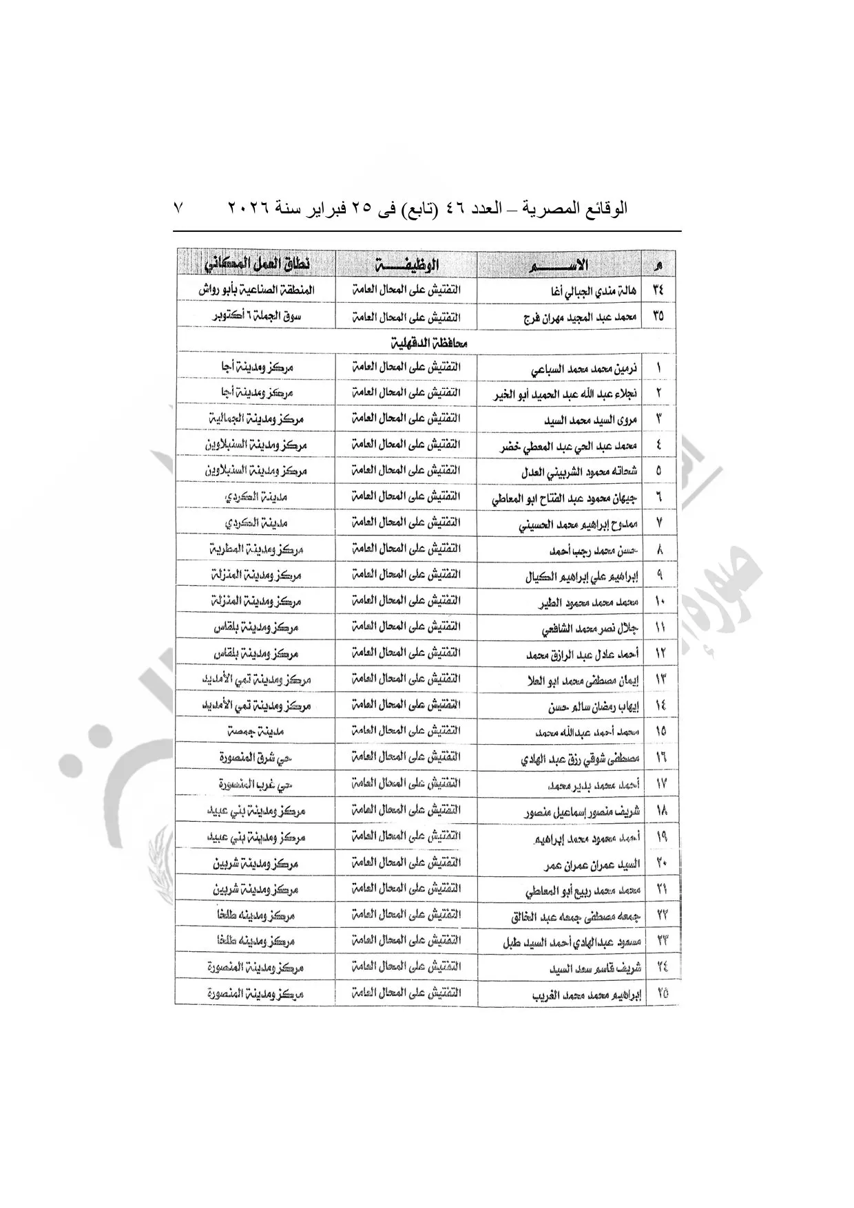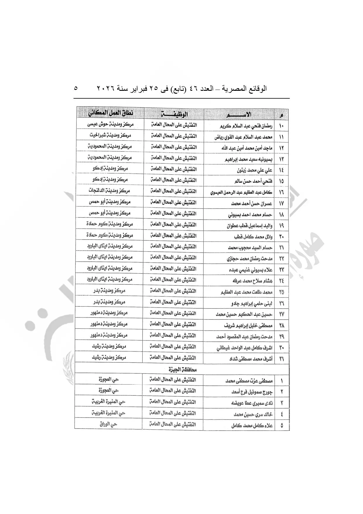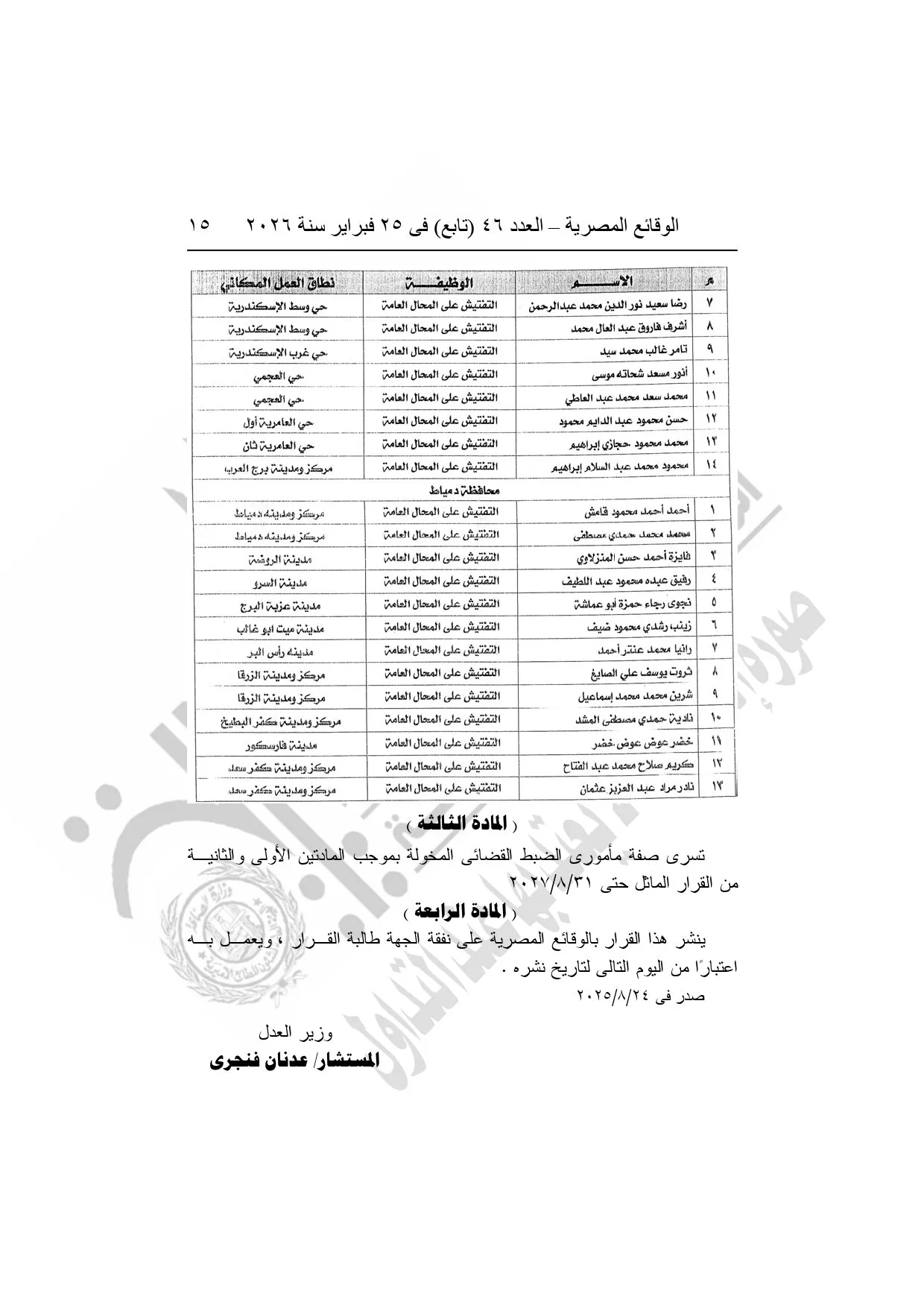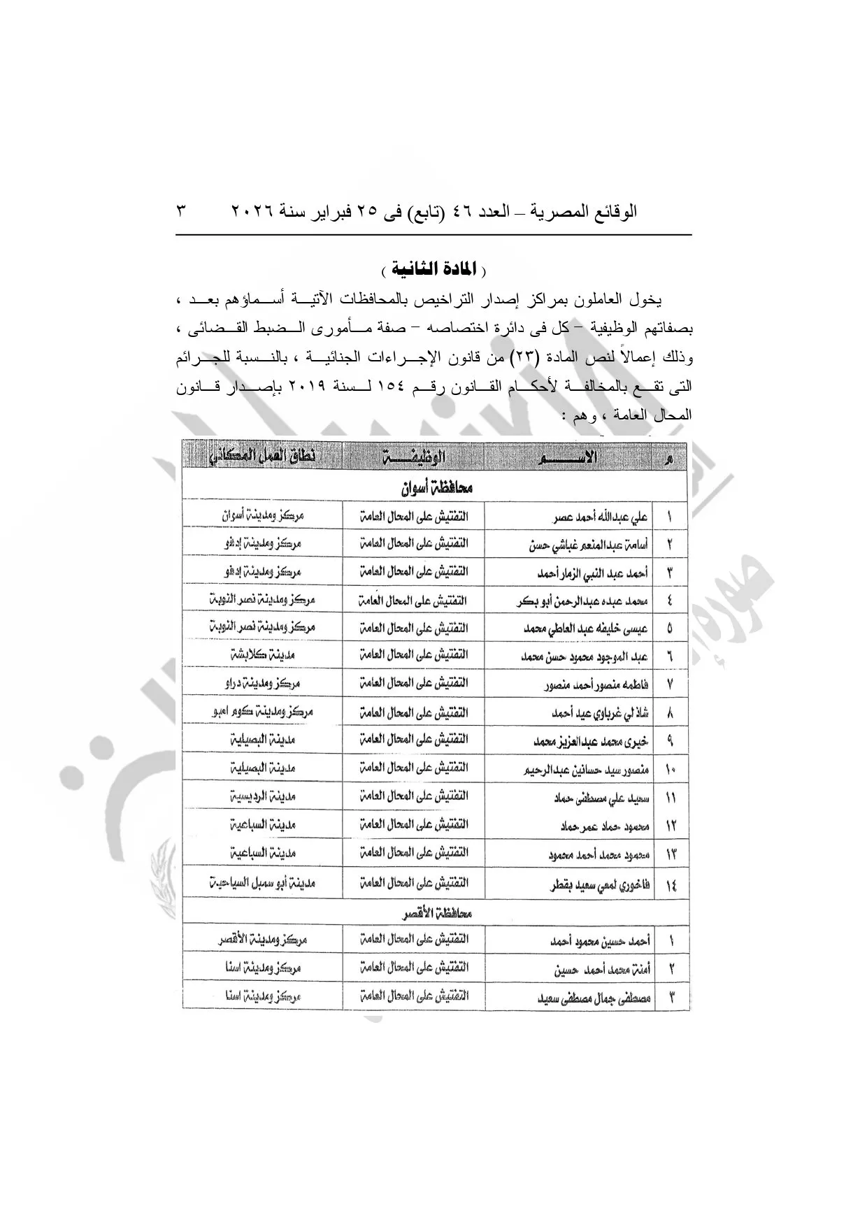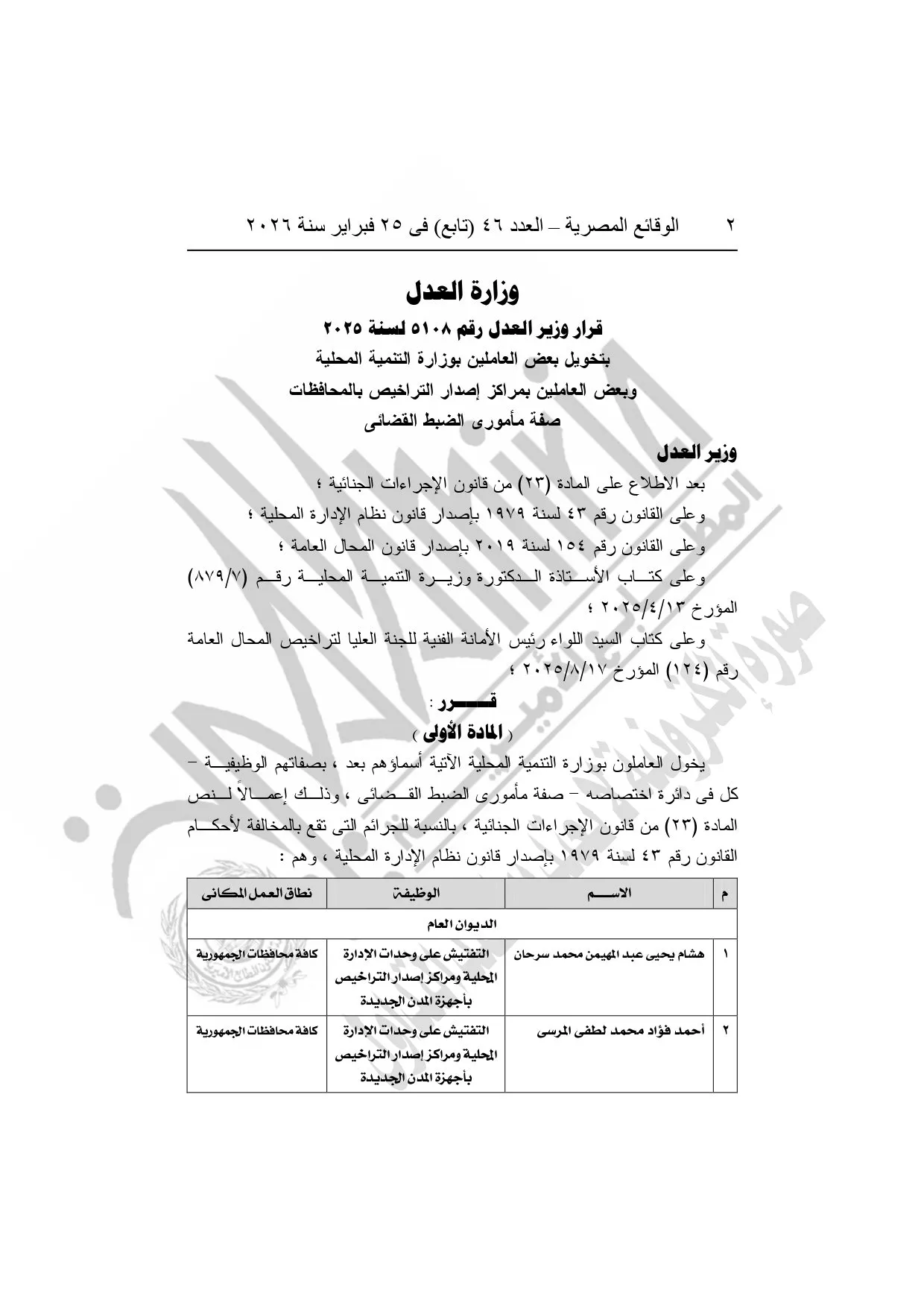 نشرت الوقائع المصرية، في العدد 46 "تابع"، الصادر في 25 فبراير سنة 2026، قرار وزارة العدل، رقم 5108 لسنة 2025، بشأن منح بعض العاملين بوزارة التنمية المحلية وبعض العاملين بمراكز إصدار التراخيص بالمحافظات صفة مأمورى الضبط القضائي.
