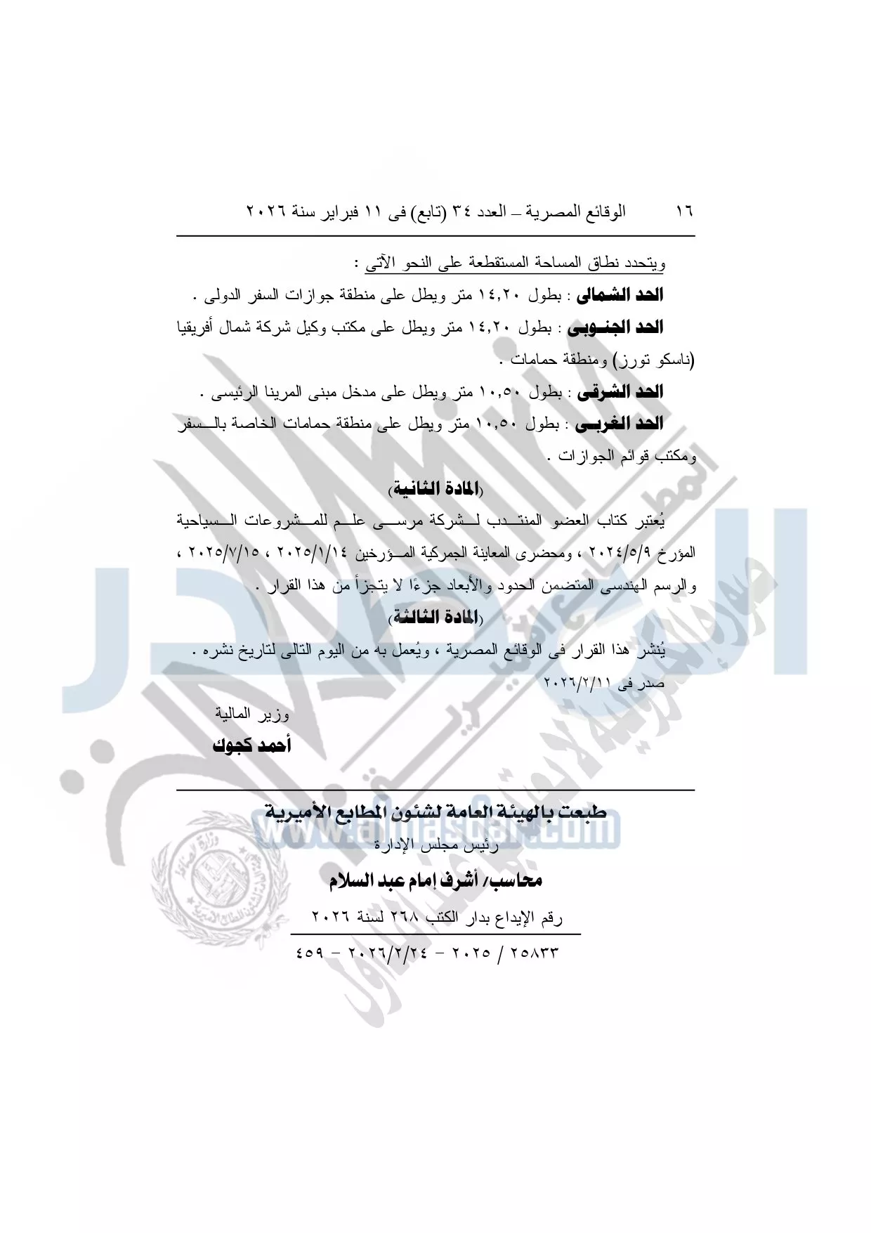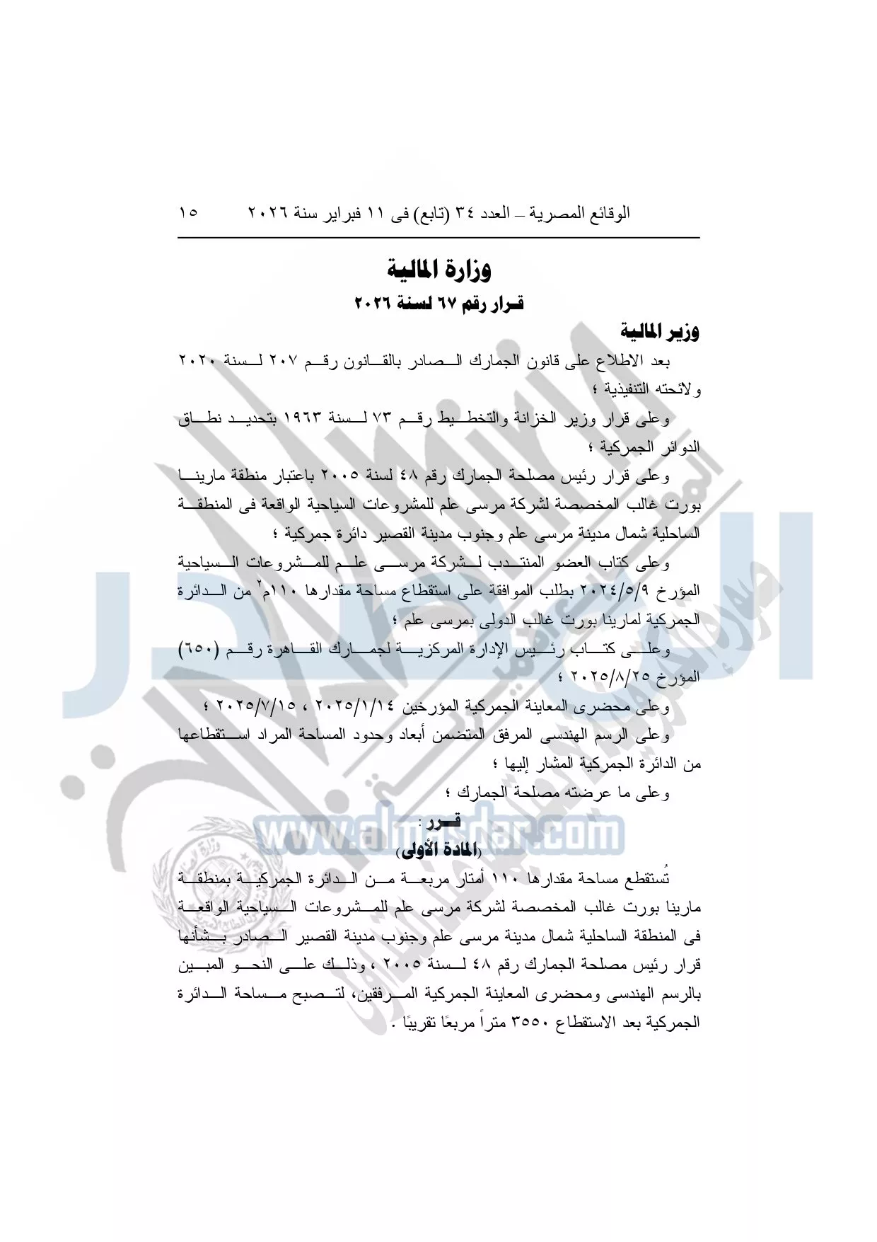 نشرت الوقائع المصرية، في العدد 34 "تابع"، الصادر في 11 فبراير سنة 2026، قرار وزارة المالية، رقم 67 لسنة 2026، بشأن تعديل مساحة الدائرة الجمركية في مارينا بورت بمرسى علم.