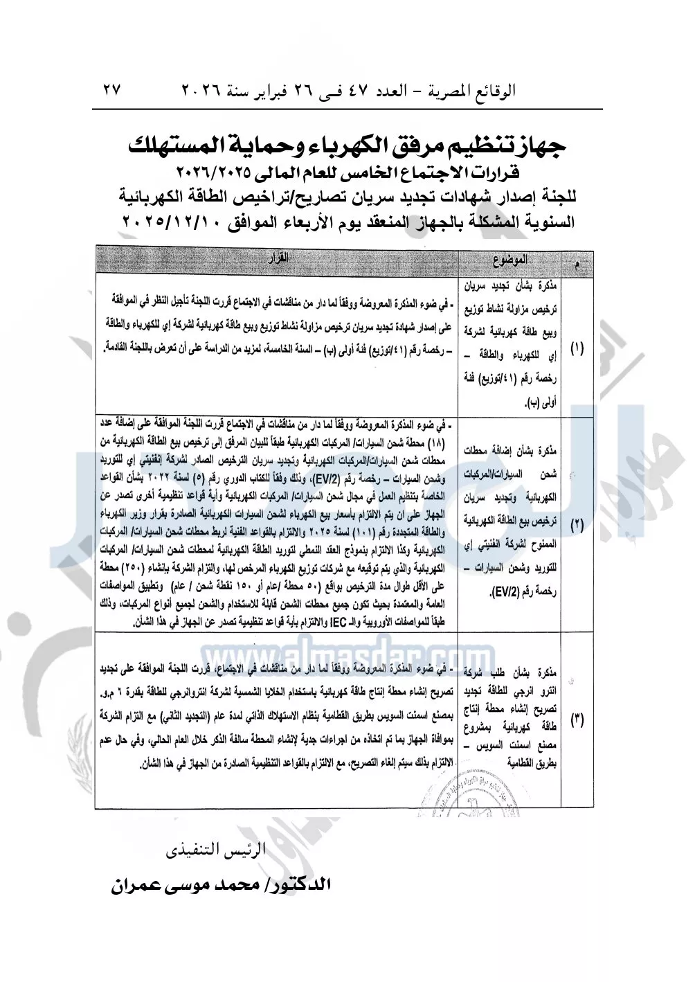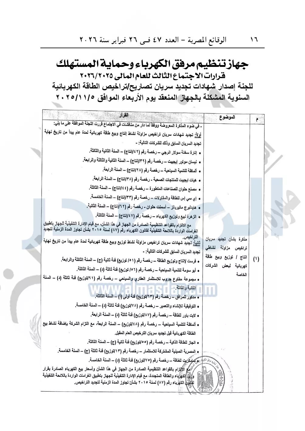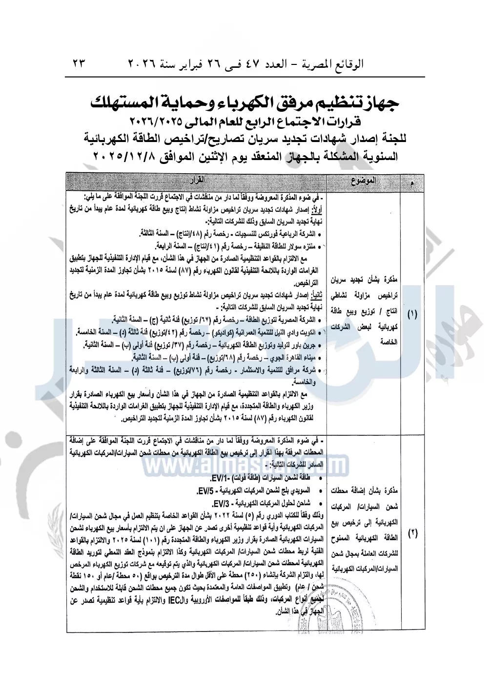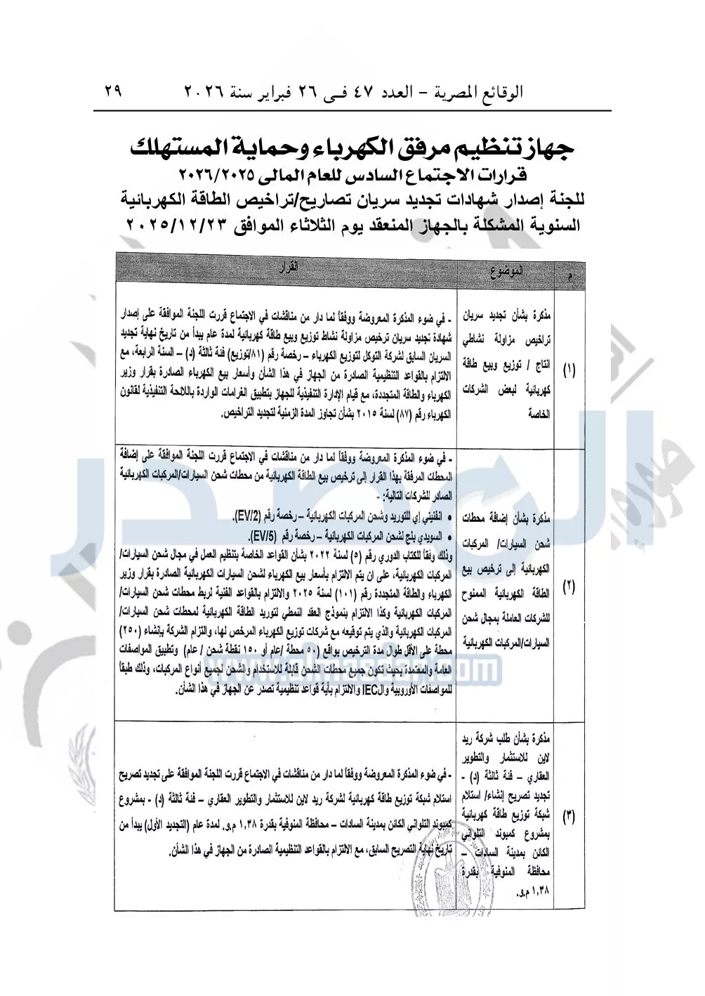 وايضا نشرت الوقائع المصرية، في العدد 47، الصادر في 26 فبراير سنة 2026، قرار جهاز تنظيم مرفق الكهرباء وحماية المستهلك، قرارات الاجتماع الرابع للعام المالي 2025-2026، للجنة إصدار شهادات تجديد سريان تصاريح - تراخيص الطاقة الكهربائية السنوية المشكلة بالجهاز المنعقد يوم الأربعاء الموافق 10-12-2025.