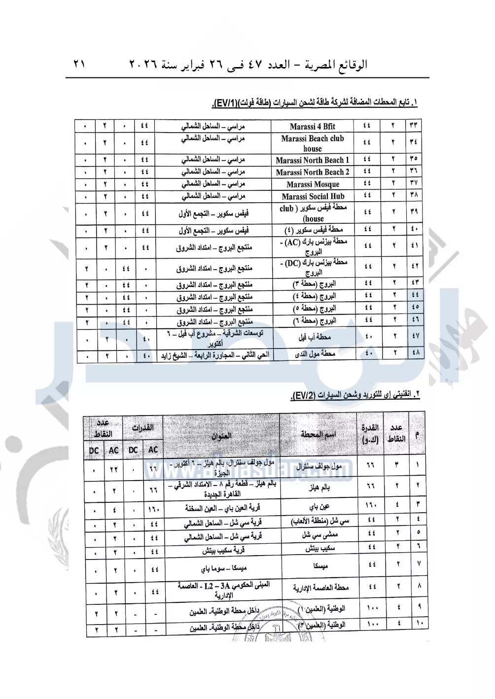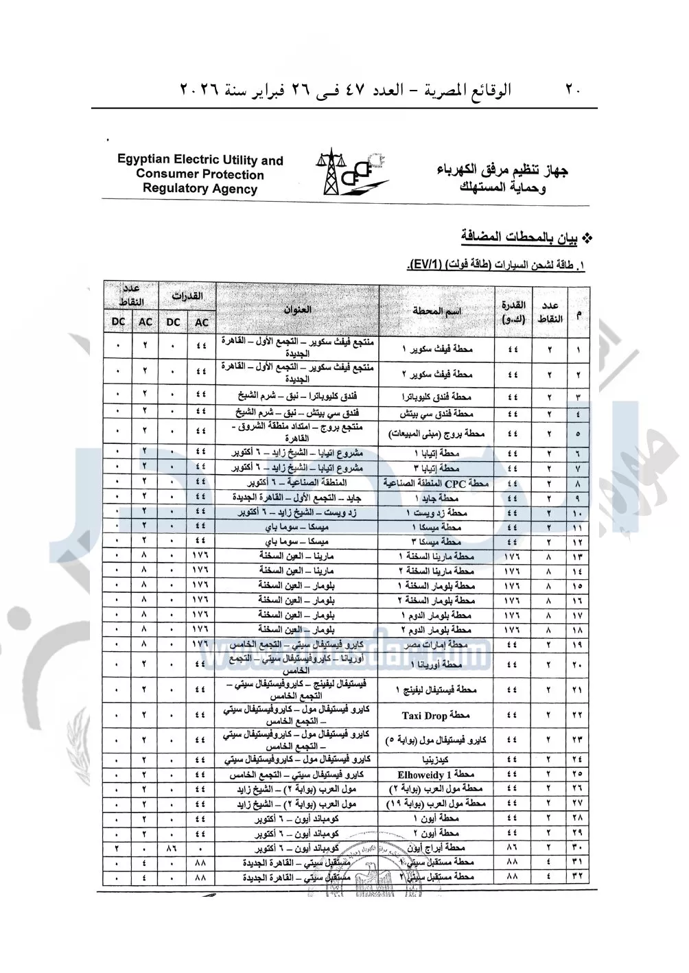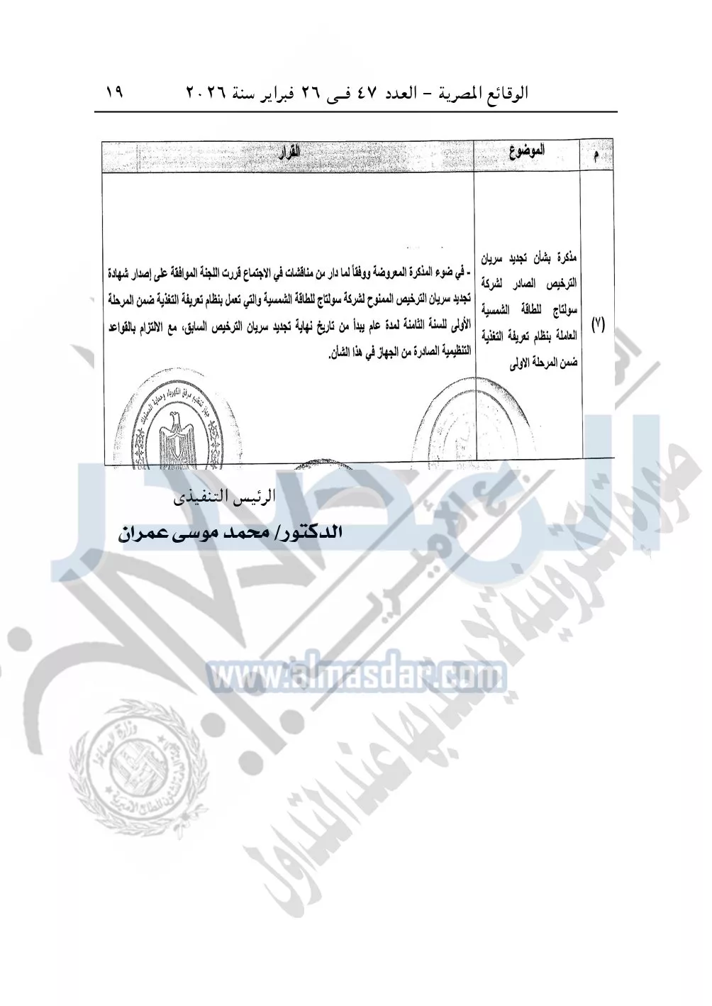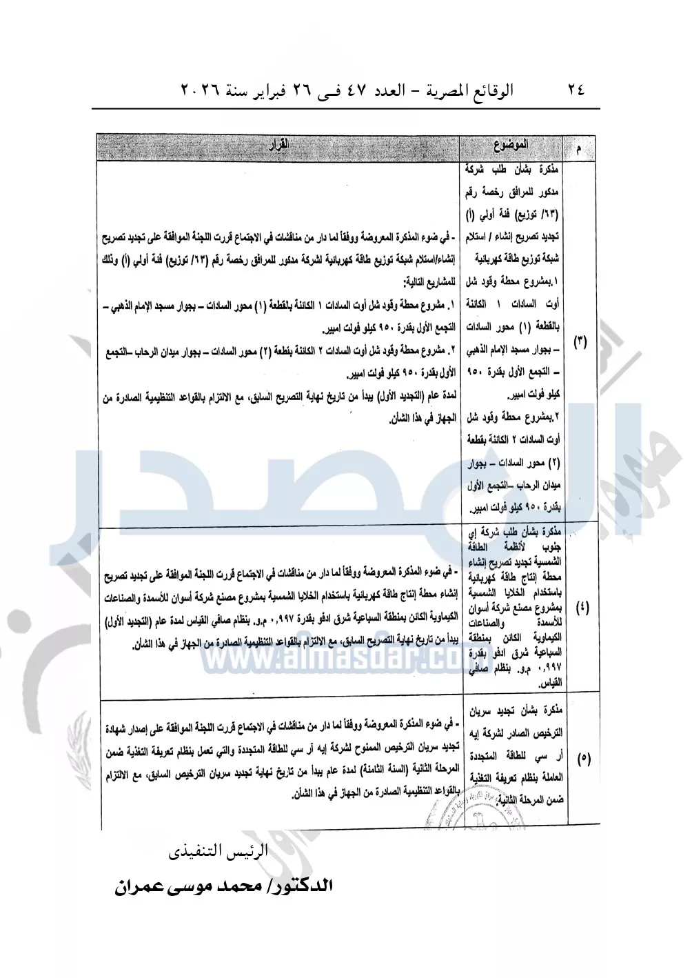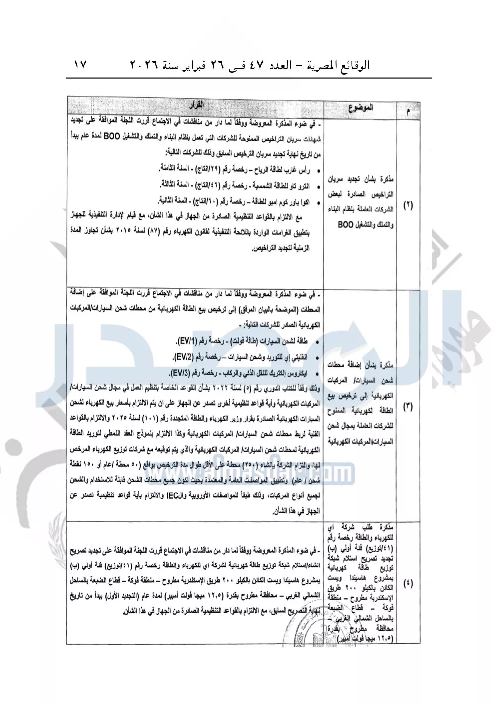 وايضا نشرت الوقائع المصرية، في العدد 47، الصادر في 26 فبراير سنة 2026، قرار جهاز تنظيم مرفق الكهرباء وحماية المستهلك، قرارات الاجتماع الرابع للعام المالي 2025-2026، للجنة إصدار شهادات تجديد سريان تصاريح - تراخيص الطاقة الكهربائية السنوية المشكلة بالجهاز المنعقد يوم الأربعاء الموافق 10-12-2025.