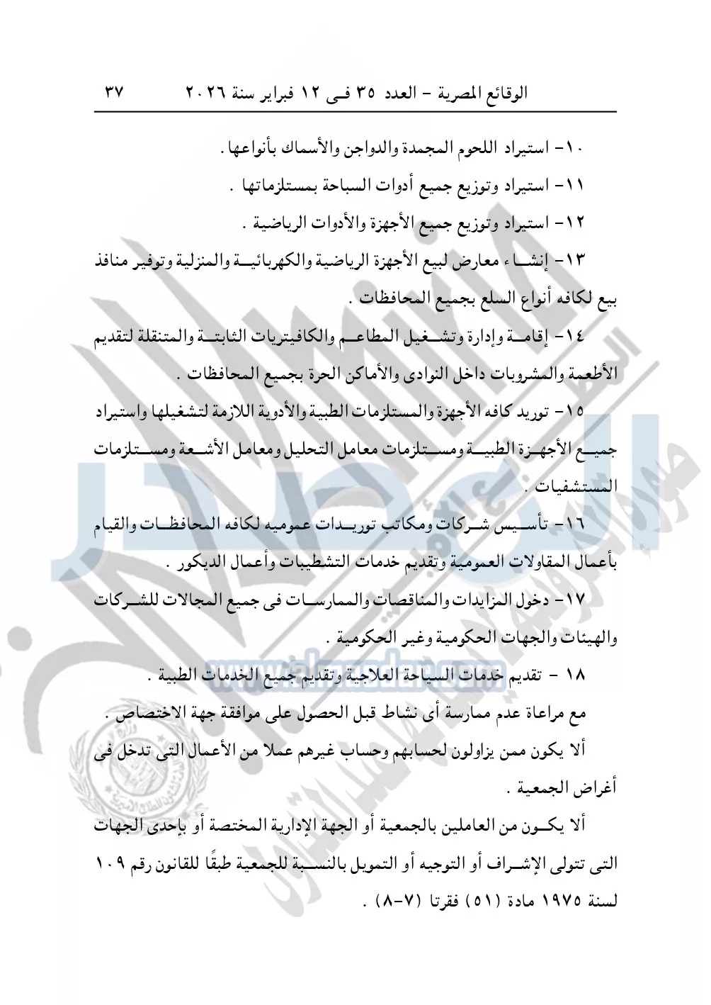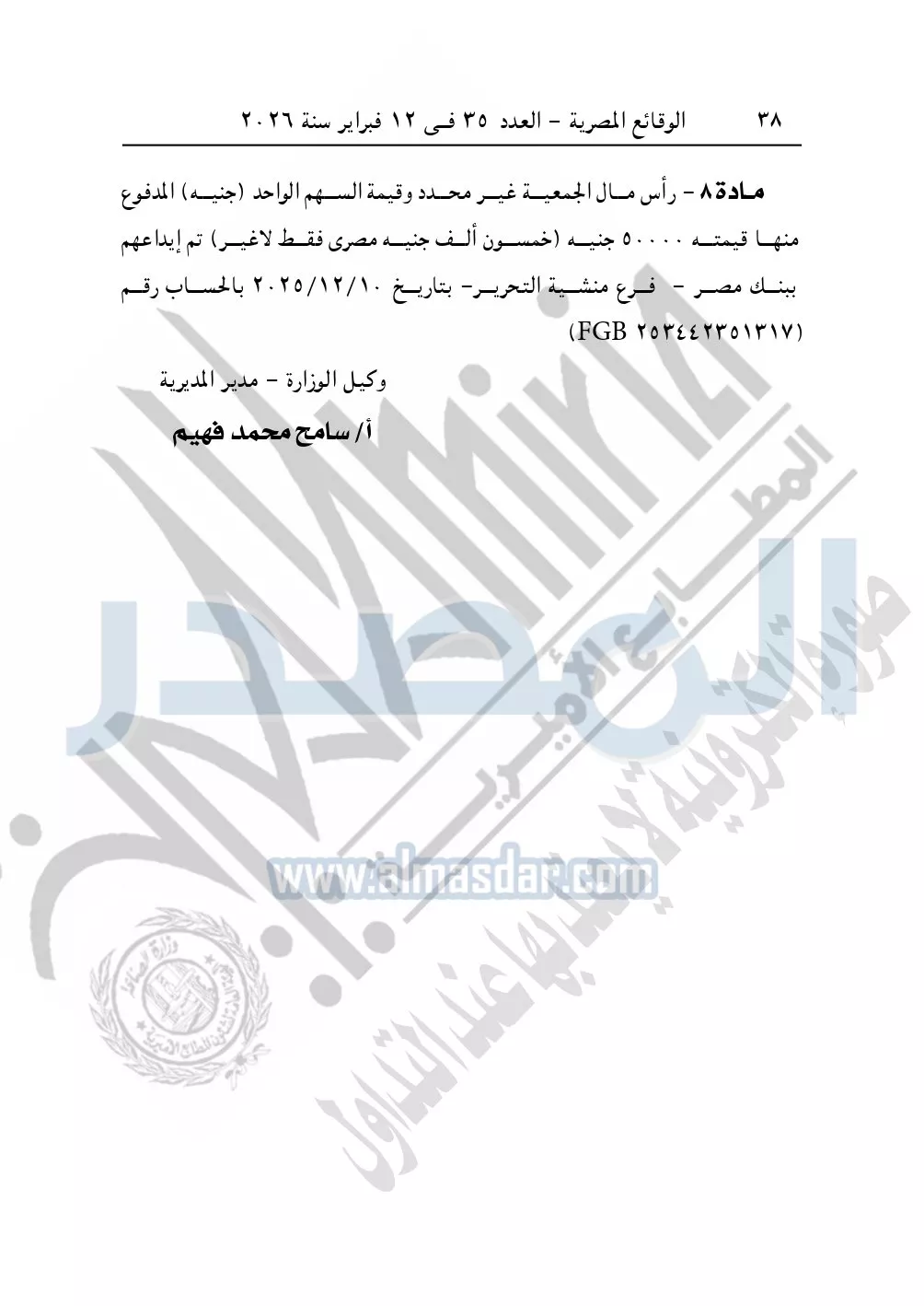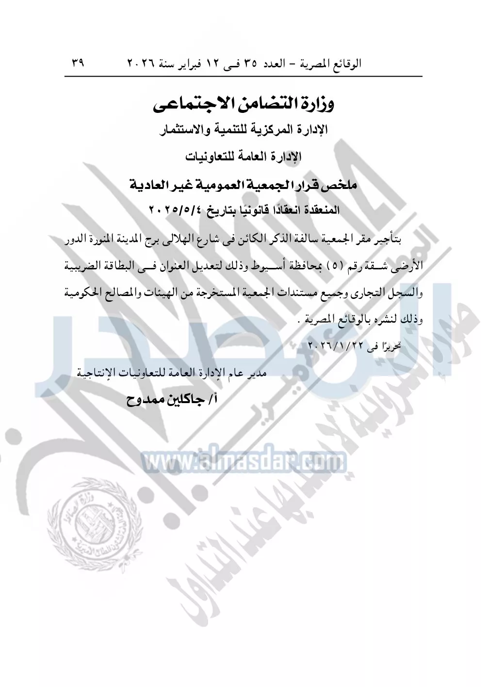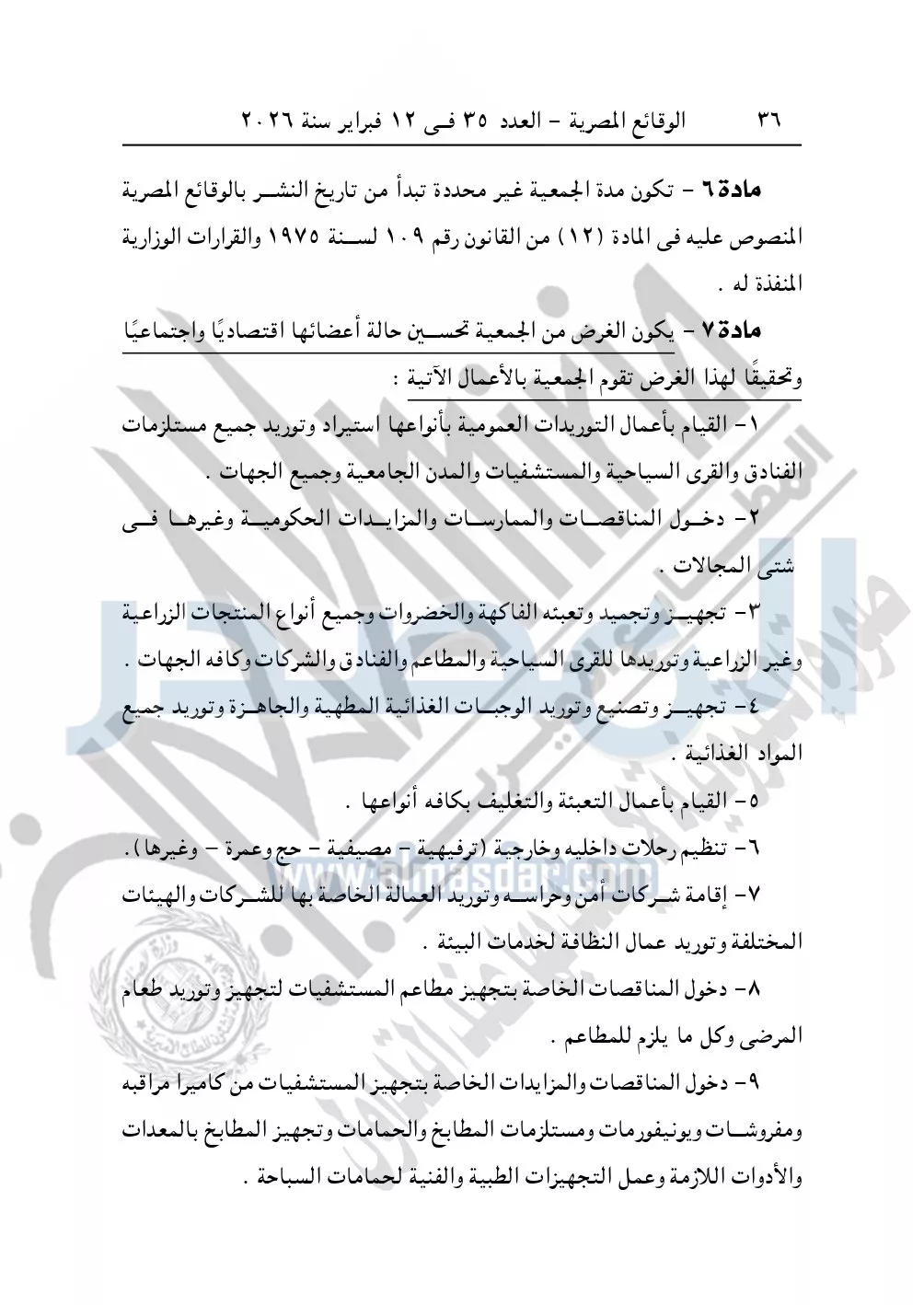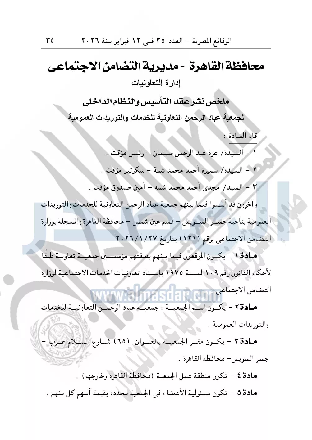 كما نشرت الوقائع المصرية في العدد 35 الصادر في 12 فبراير سنة 2026، محافظة القاهرة – مديرية التضامن الاجتماعي إدارة التعاونيات، ملخص نشر عقد التأسيس والنظام الداخلي لجمعية عباد الرحمن التعاونية للخدمات والتوريدات العمومية.