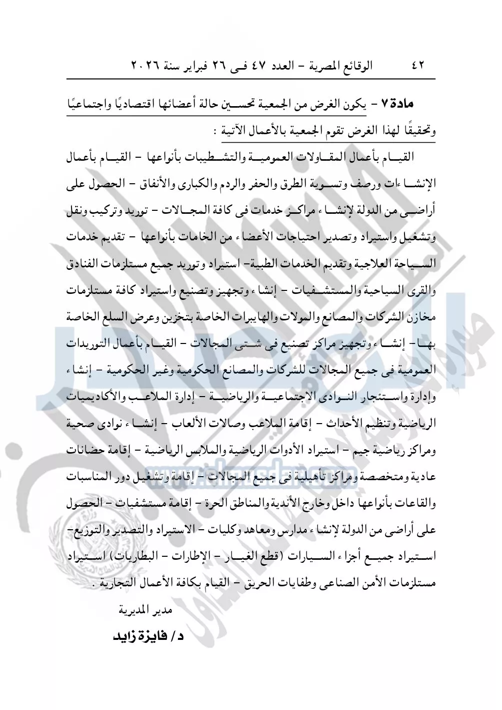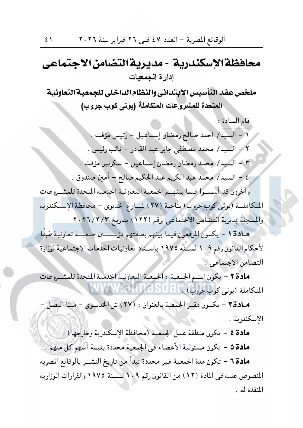 نشرت الوقائع المصرية في العدد 47 الصادر في 26 فبراير سنة 2026، محافظة الإسكندرية مديرية التضامن الاجتماعي، إدارة الجمعيات، ملخص عقد التأسيس الابتدائي والنظام الداخلي للجمعية التعاونية المتحدة للمشروعات المتكاملة "يوني كوب جروب".