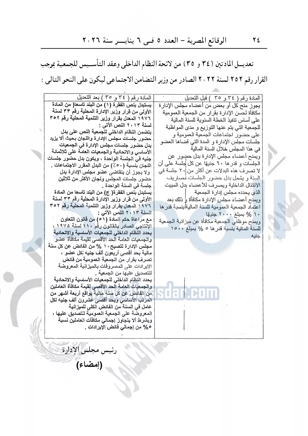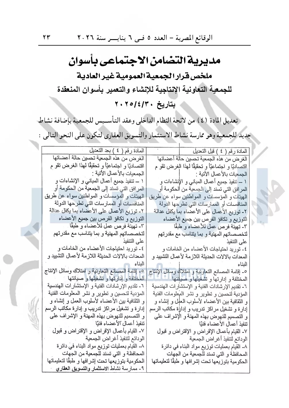 كما نشرت الوقائع المصرية في العدد ٥ فى ٦ يناير سنة 2026، مديرية التضامن الاجتماعى بأسوان، ملخص قرار الجمعية العمومية غير العادية للجمعية التعاونية الإنتاجية للإنشاء والتعمير بأسوان المنعقدة بتاريخ 30-4-2025.