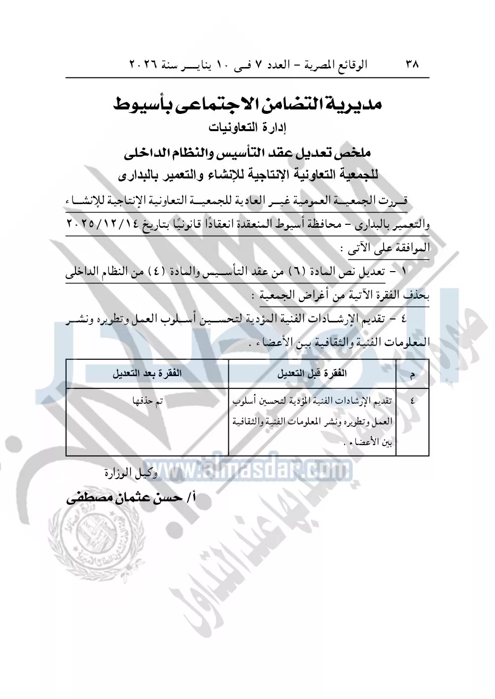 ونشرت الوقائع المصرية في العدد 7 الصادر في 10 يناير سنة 2026، مديرية التضامن الاجتماعي بأسيوط، إدارة التعاونيات، ملخص تعديل عقد التأسيس والنظام الداخلي للجمعية التعاونية الإنتاجية للإنشاء والتعمير بالبداري.