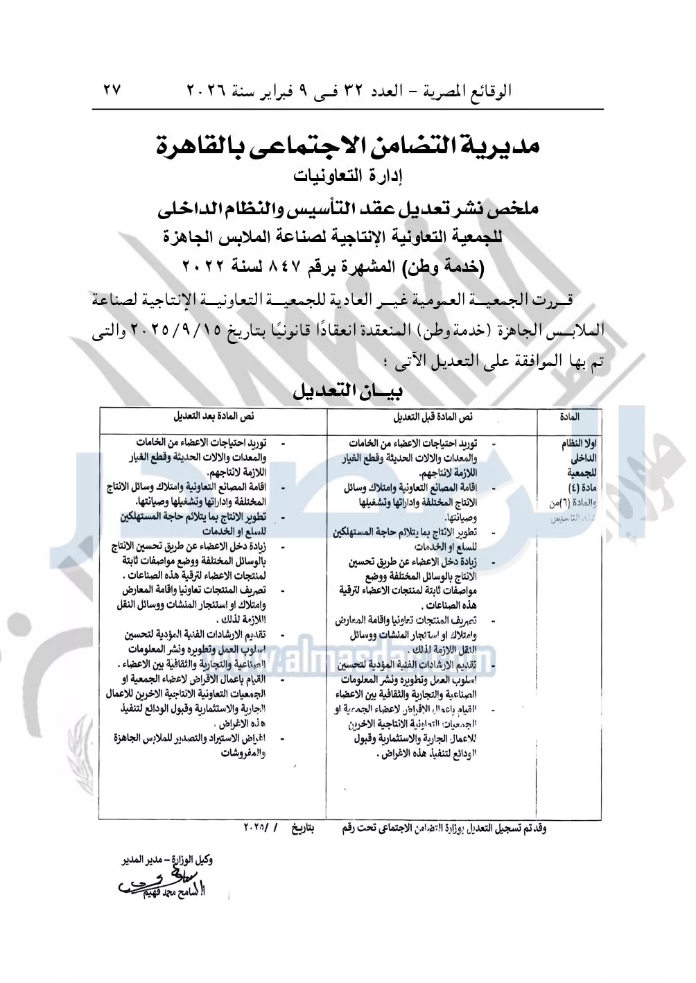 كما نشرت الوقائع المصرية في العدد 32 الصادر في 9 فبراير سنة 2026، مديرية التضامن الاجتماعي بالقاهرة إدارة التعاونيات، ملخص نشر تعديل عقد التأسيس والنظام الداخلي للجمعية التعاونية الإنتاجية لصناعة الملابس الجاهزة "خدمة وطن" المشهرة برقم 847 لسنة 2022.