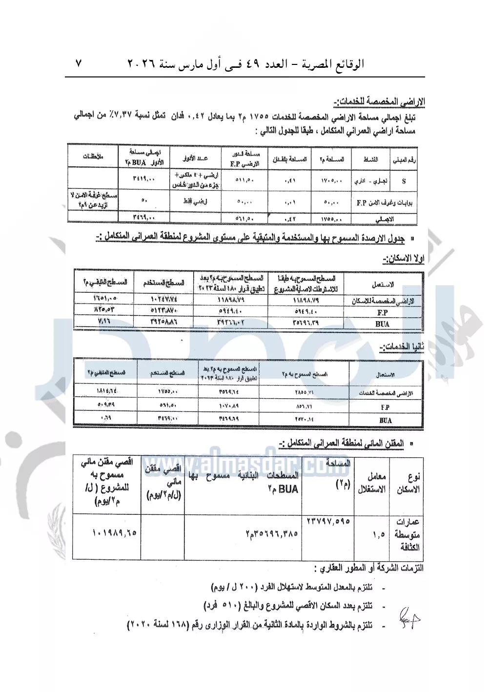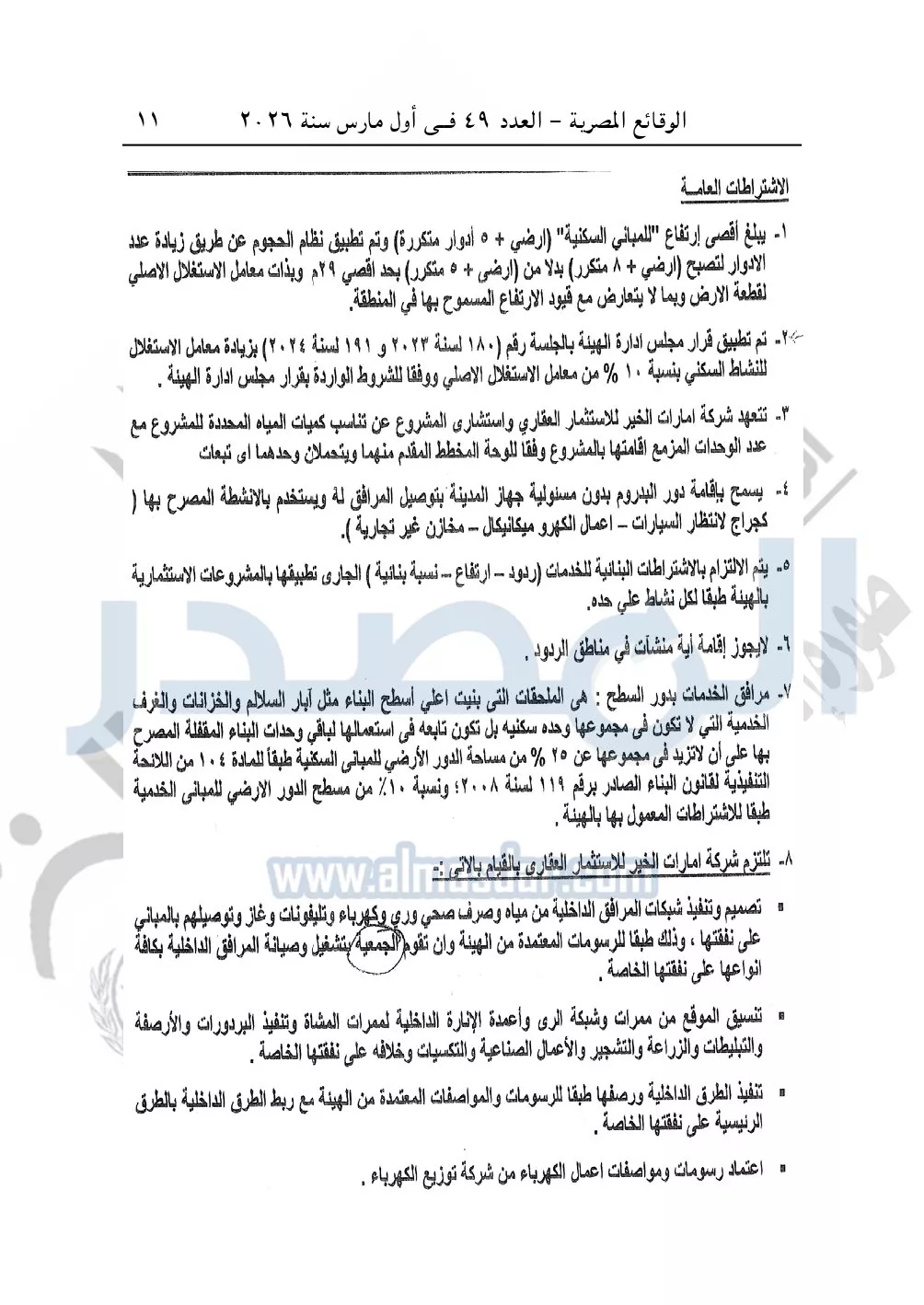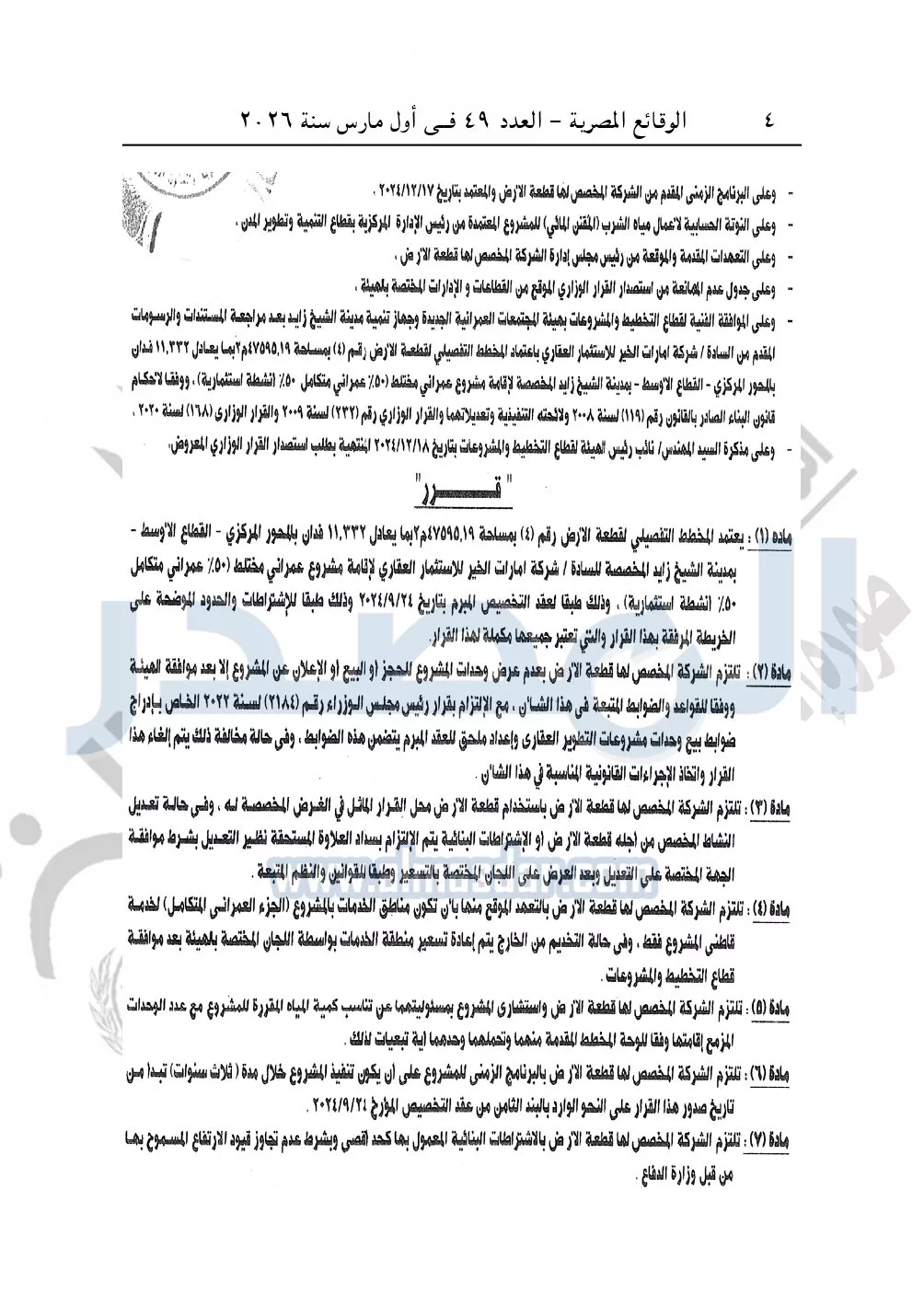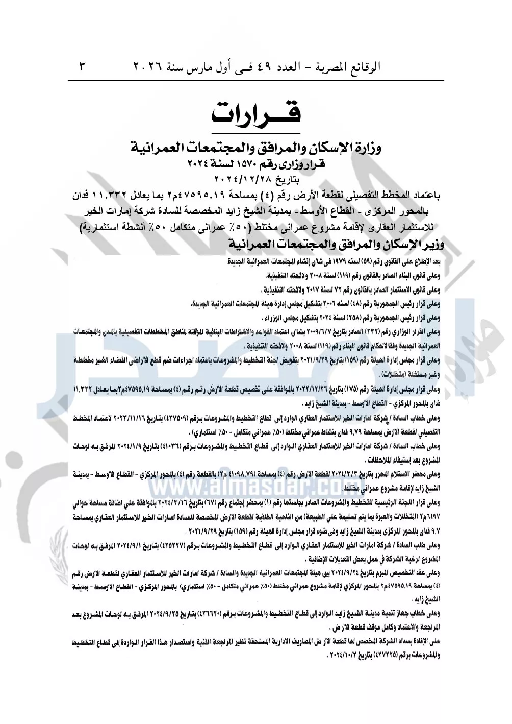 نشرت الوقائع المصرية، في العدد 49، الصادر في أول مارس سنة 2026، قرار وزارة الإسكان والمرافق والمجتمعات العمرانية، رقم 1570 لسنة 2024، بتاريخ 28-12-2024، بشأن اعتماد المخطط التفصيلي لقطعة الأرض رقم "4" بمساحة 47595.19م2 بما يعادل 11.332 فدان بالمحور المركزى - القطاع الأوسط بمدينة الشيخ زايد المخصصة لشركة إمارات الخير للاستثمار العقارى لإقامة مشروع عمراني مختلط "50% عمرانی متكامل 50% أنشطة استثمارية".