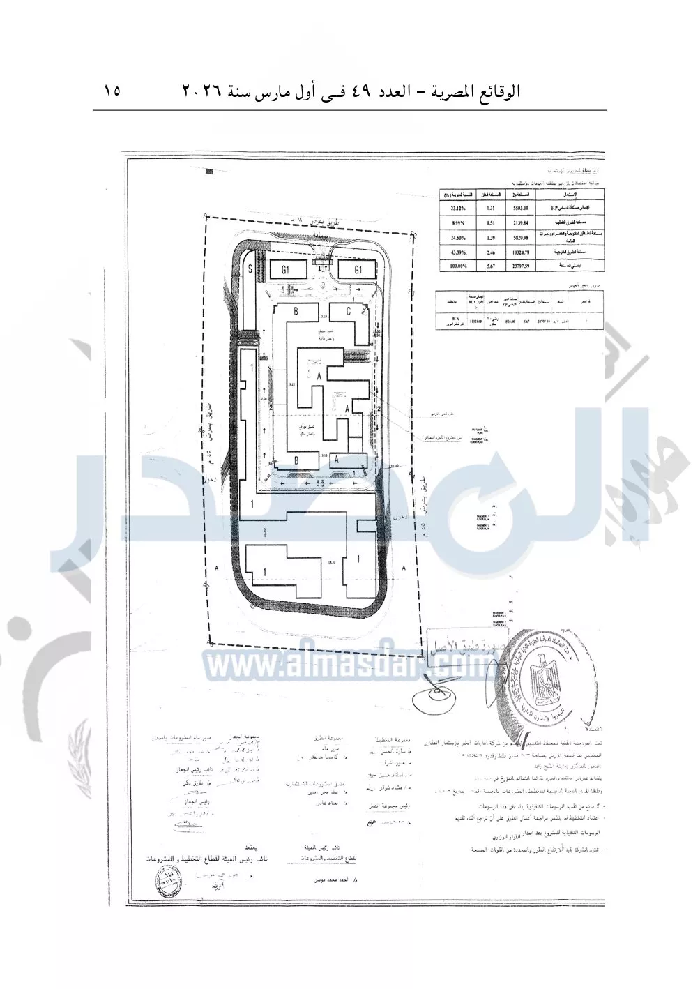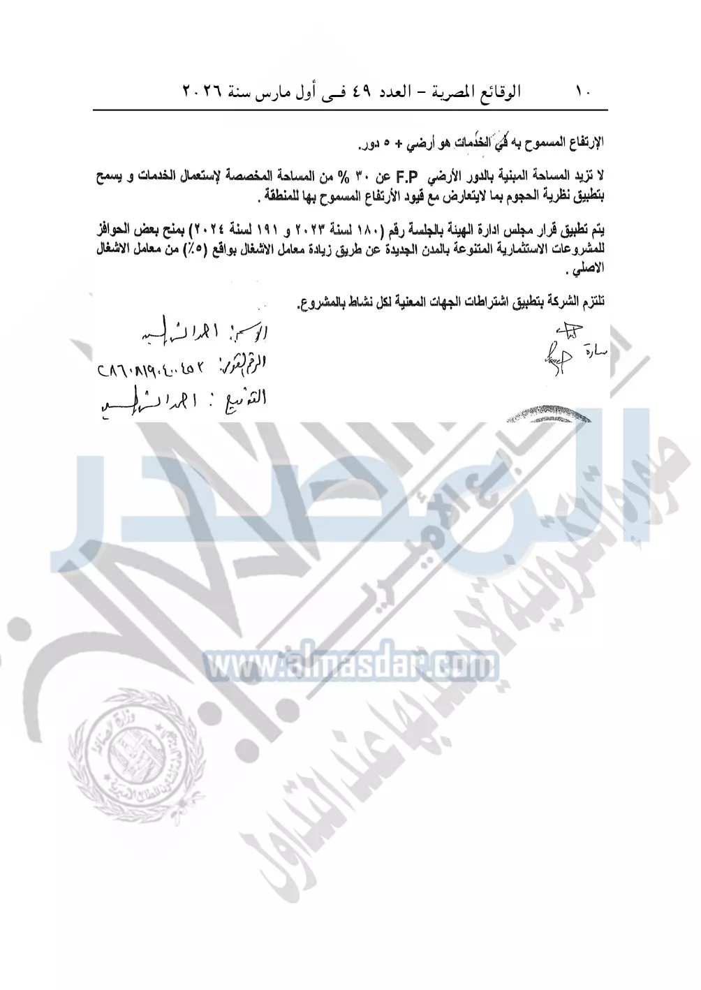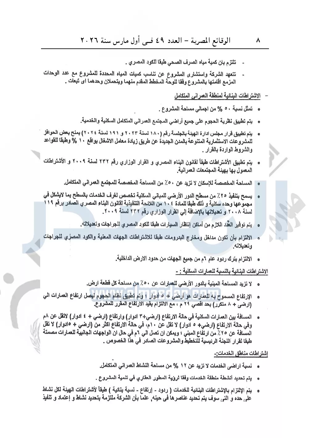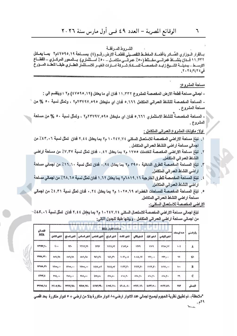 نشرت الوقائع المصرية، في العدد 49، الصادر في أول مارس سنة 2026، قرار وزارة الإسكان والمرافق والمجتمعات العمرانية، رقم 1570 لسنة 2024، بتاريخ 28-12-2024، بشأن اعتماد المخطط التفصيلي لقطعة الأرض رقم "4" بمساحة 47595.19م2 بما يعادل 11.332 فدان بالمحور المركزى - القطاع الأوسط بمدينة الشيخ زايد المخصصة لشركة إمارات الخير للاستثمار العقارى لإقامة مشروع عمراني مختلط "50% عمرانی متكامل 50% أنشطة استثمارية".
