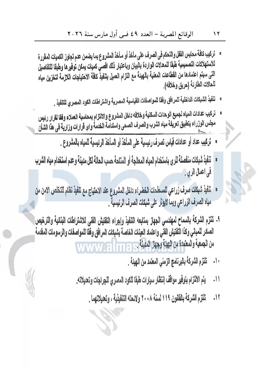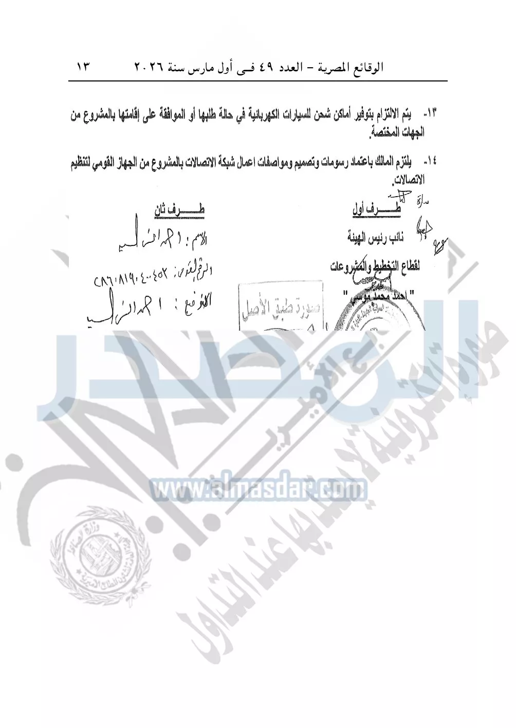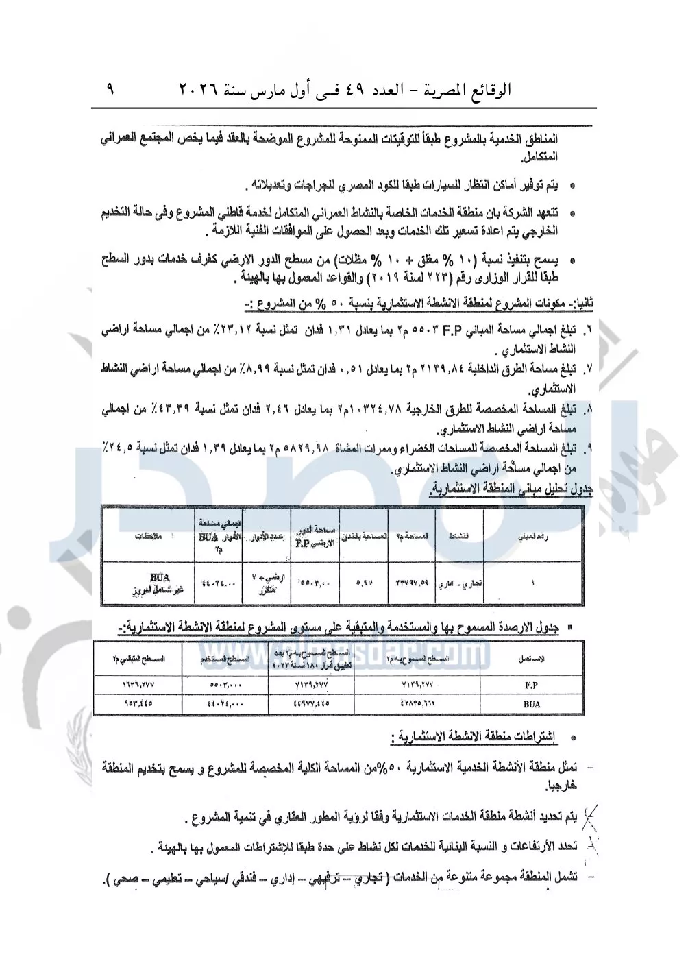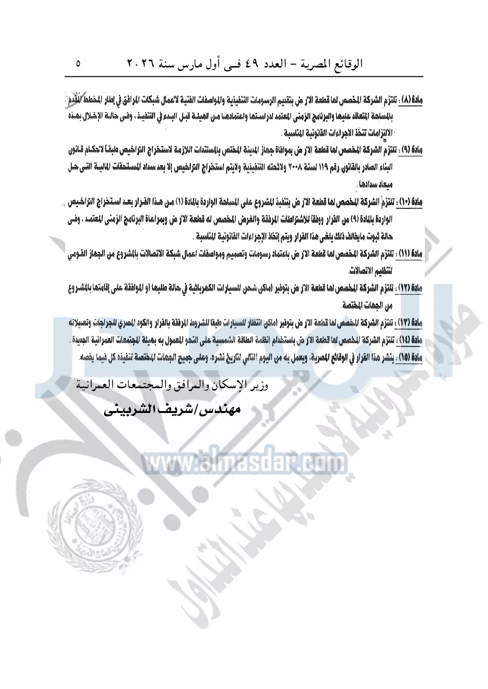 نشرت الوقائع المصرية، في العدد 49، الصادر في أول مارس سنة 2026، قرار وزارة الإسكان والمرافق والمجتمعات العمرانية، رقم 1570 لسنة 2024، بتاريخ 28-12-2024، بشأن اعتماد المخطط التفصيلي لقطعة الأرض رقم "4" بمساحة 47595.19م2 بما يعادل 11.332 فدان بالمحور المركزى - القطاع الأوسط بمدينة الشيخ زايد المخصصة لشركة إمارات الخير للاستثمار العقارى لإقامة مشروع عمراني مختلط "50% عمرانی متكامل 50% أنشطة استثمارية".