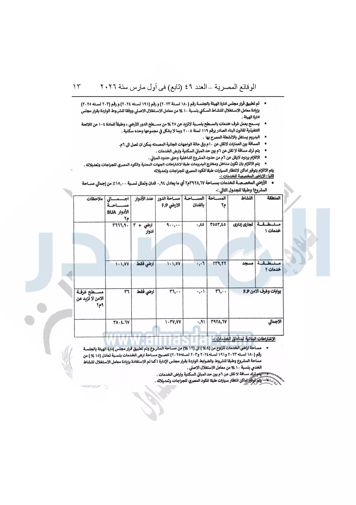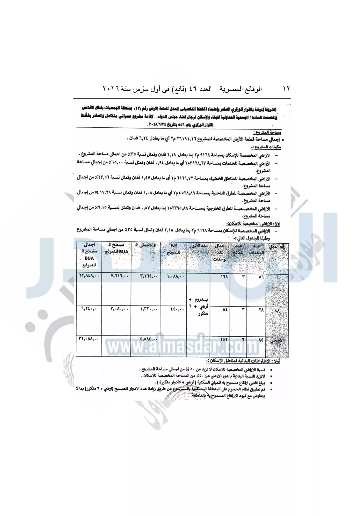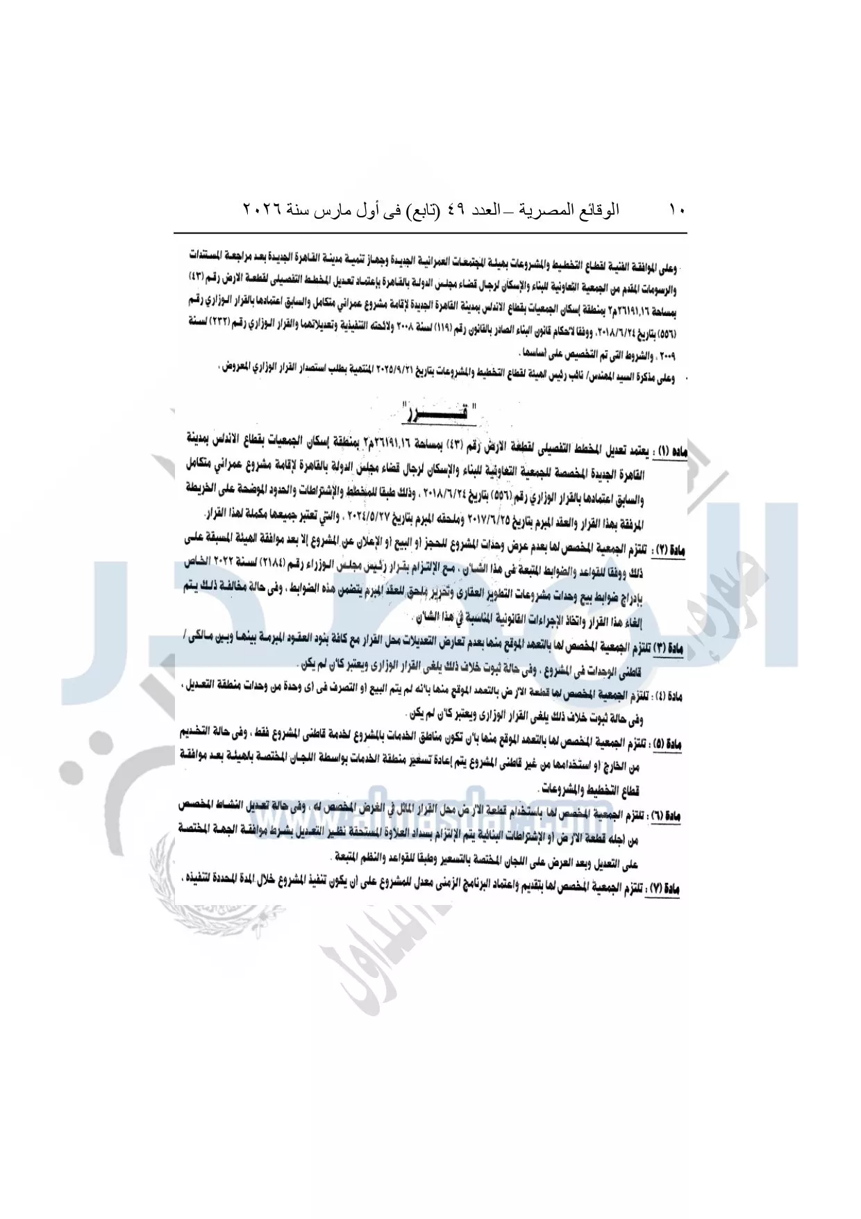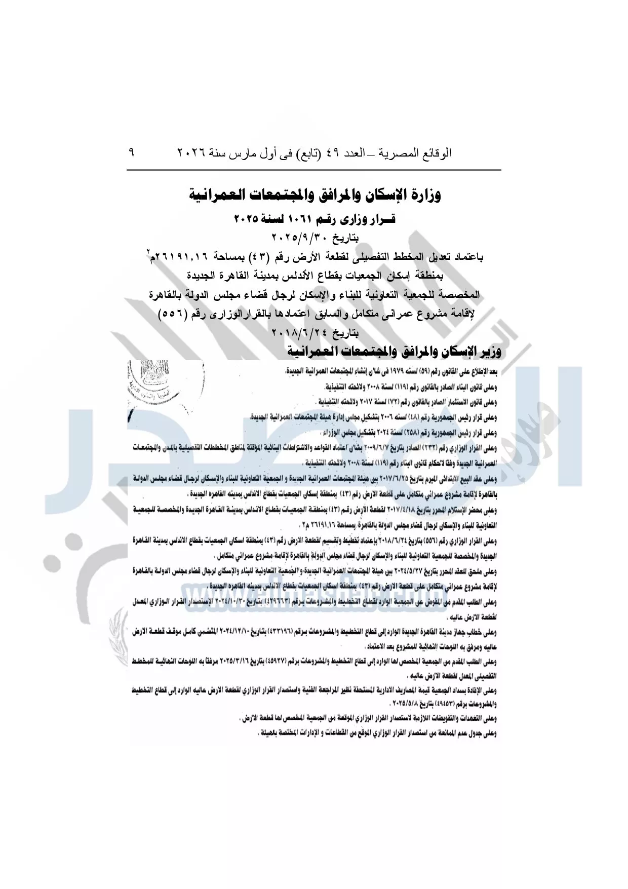 نشرت الوقائع المصرية، في العدد 49 "تابع"، الصادر في أول مارس سنة 2026، قرار وزارة الإسكان والمرافق والمجتمعات العمرانية، رقم 1061 لسنة 2025، بتاريخ 30-9-2025، بشأن اعتماد تعديل المخطط التفصيلى لقطعة الأرض رقم "43" بمساحة 26191.16م2 بمنطقة إسكان الجمعيات بقطاع الأندلس بمدينة القاهرة الجديدة المخصصة للجمعية التعاونية للبناء والإسكان لرجال قضاء مجلس الدولة بالقاهرة لإقامة مشروع عمرانى متكامل والسابق اعتمادها بالقرار الوزارى رقم "556" بتاريخ 24-6-2018.