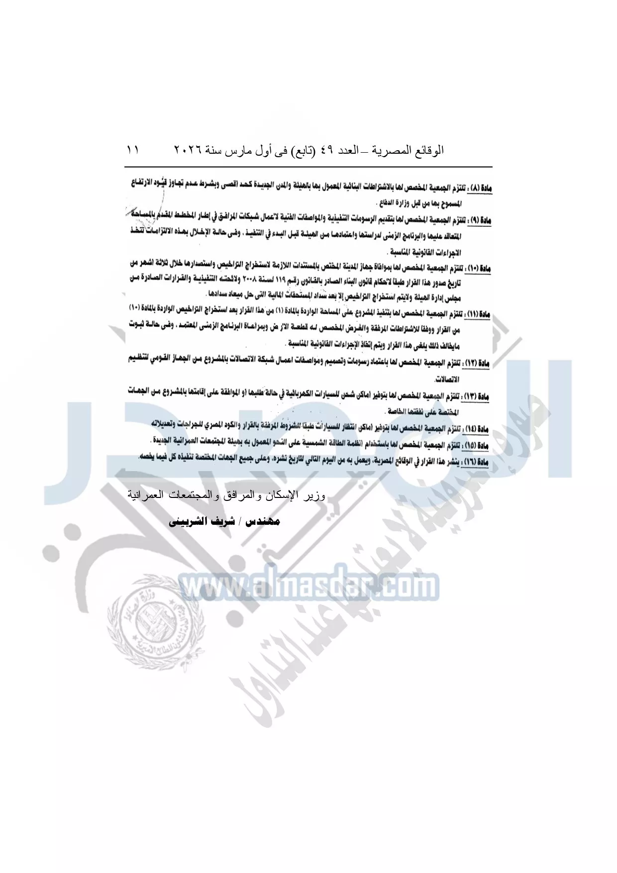 تلتزم الجمعية المخصص لها بالتعهد الموقع منها بعدم تعارض التعديلات محل القرار مع كافة بنود العقود المبرمة بينها وبين مالكي - قاطني الوجدات فى المشروع، وفى حالة ثبوت خلاف ذلك يلغى القرار الوزارى ويعتبر كان لم يكن.