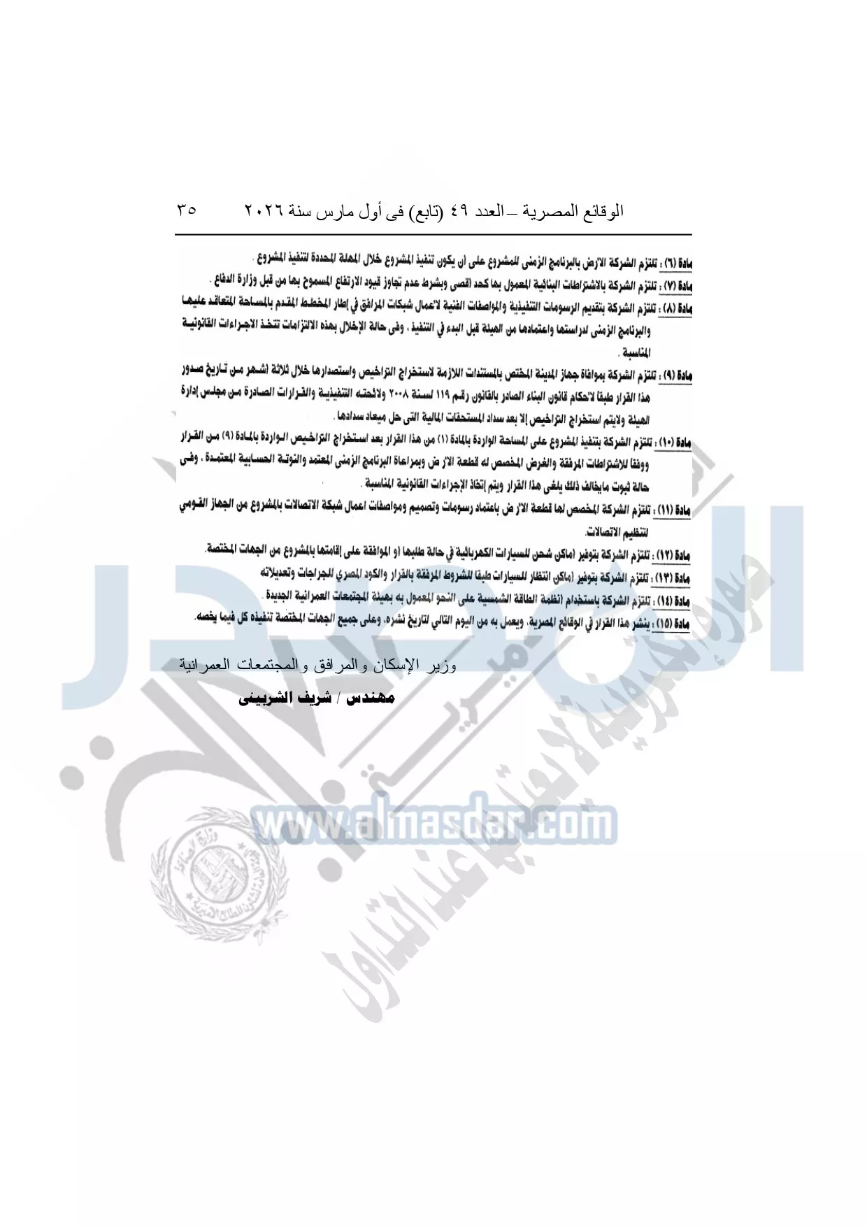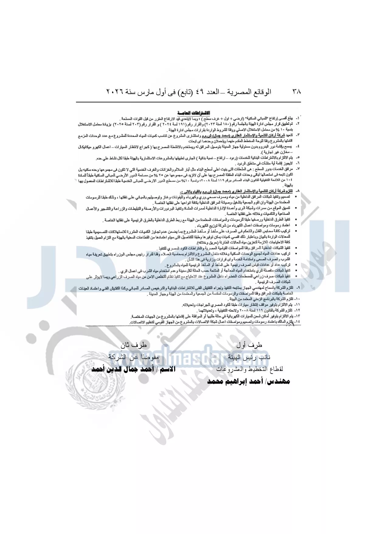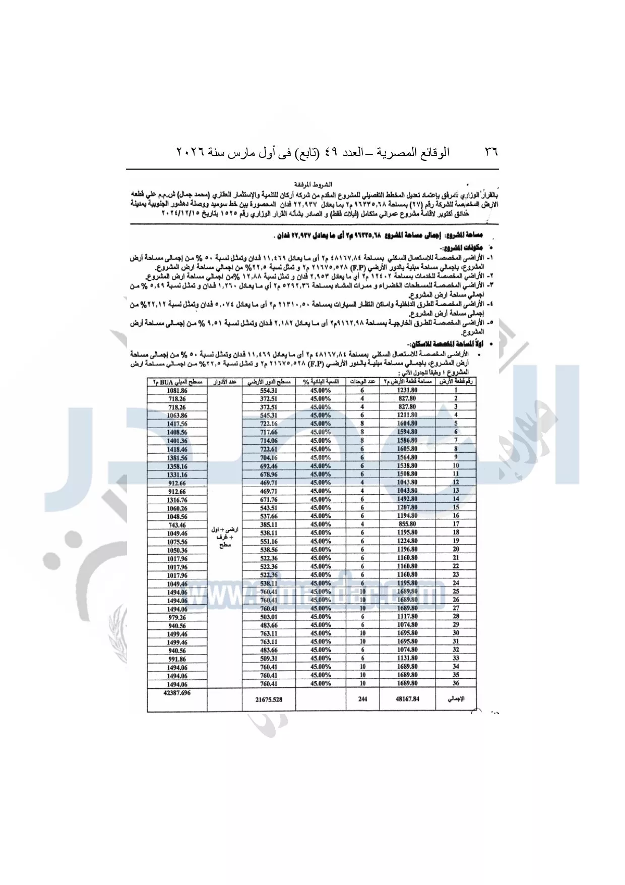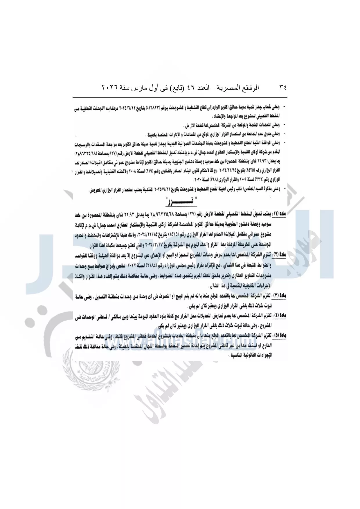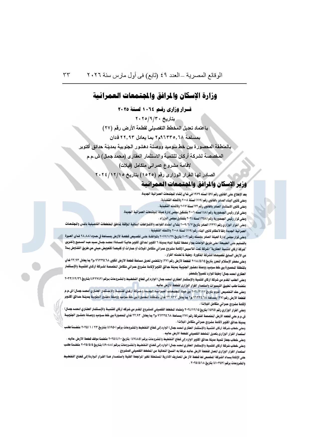نشرت الوقائع المصرية، في العدد 49 "تابع"، الصادر في أول مارس سنة 2026، قرار وزارة الإسكان والمرافق والمجتمعات العمرانية، رقم 1064 لسنة 2025، بتاريخ 30-9-2025، بشأن اعتماد تعديل المخطط التفصيلي لقطعة الأرض رقم "27" بمساحة 96335.68م2 بما يعادل 22.93 فدان بالمنطقة المحصورة بين خط سوميد ووصلة دهشور الجنوبية بمدينة حدائق أكتوبر المخصصة لشركة أركان للتنمية والاستثمار العقارى "محمد جمل" ش.م.م لإقامة مشروع عمراني متكامل "فيلات" الصادر لها القرار الوزارى رقم "1525" بتاريخ 15-12-2024.