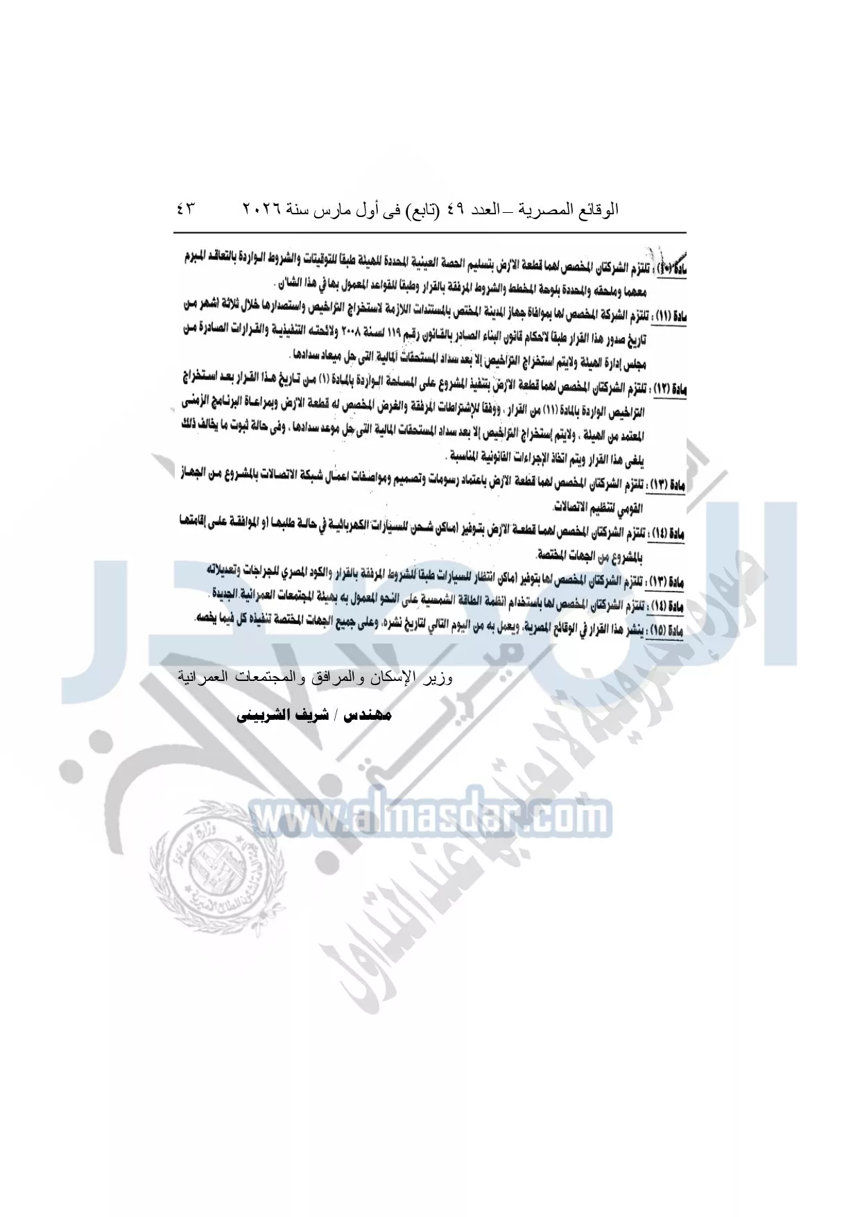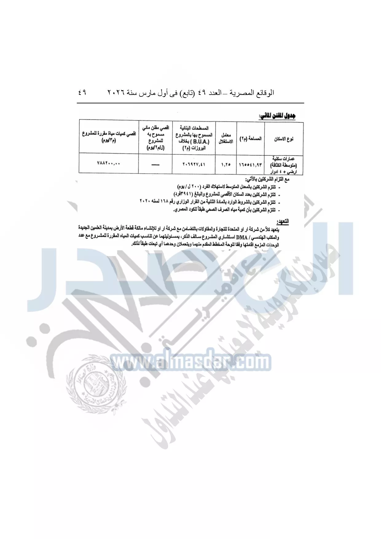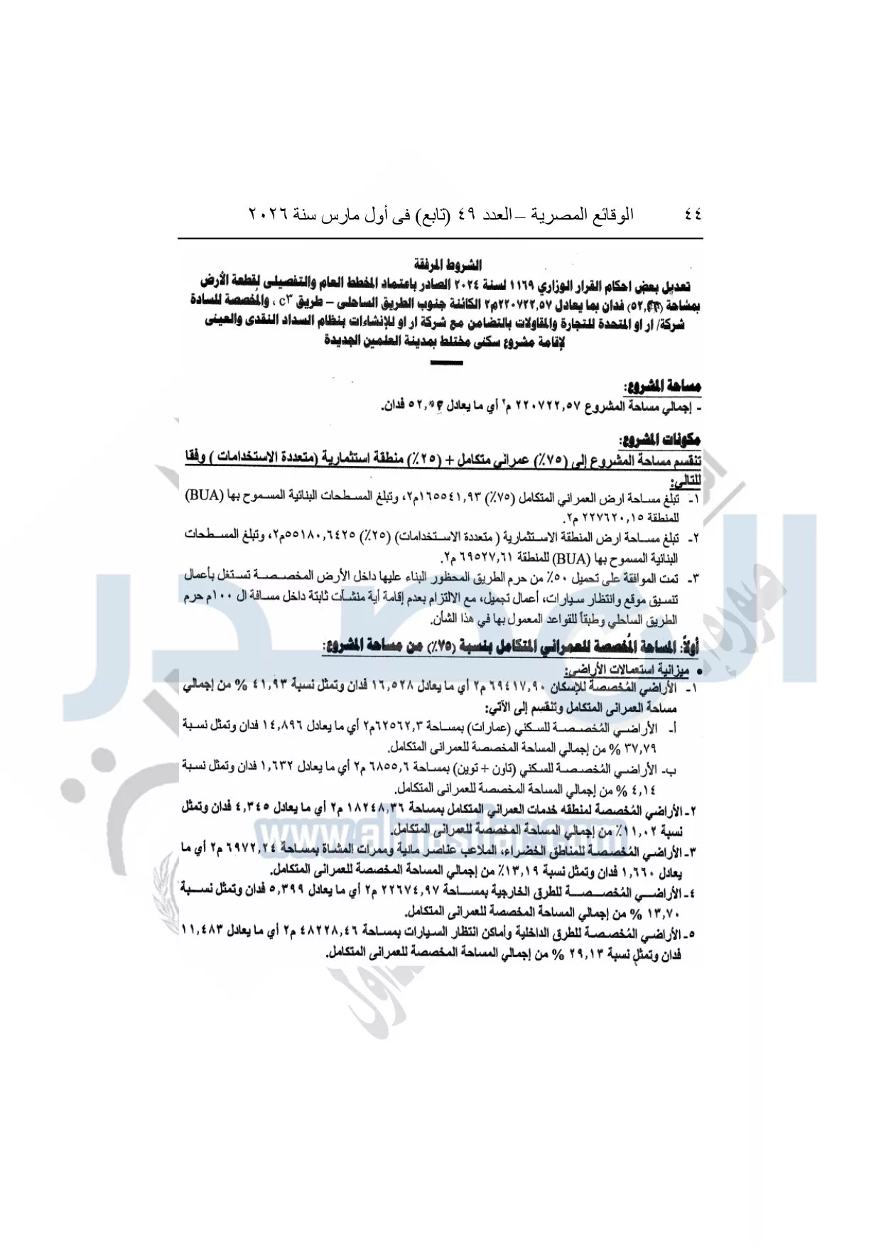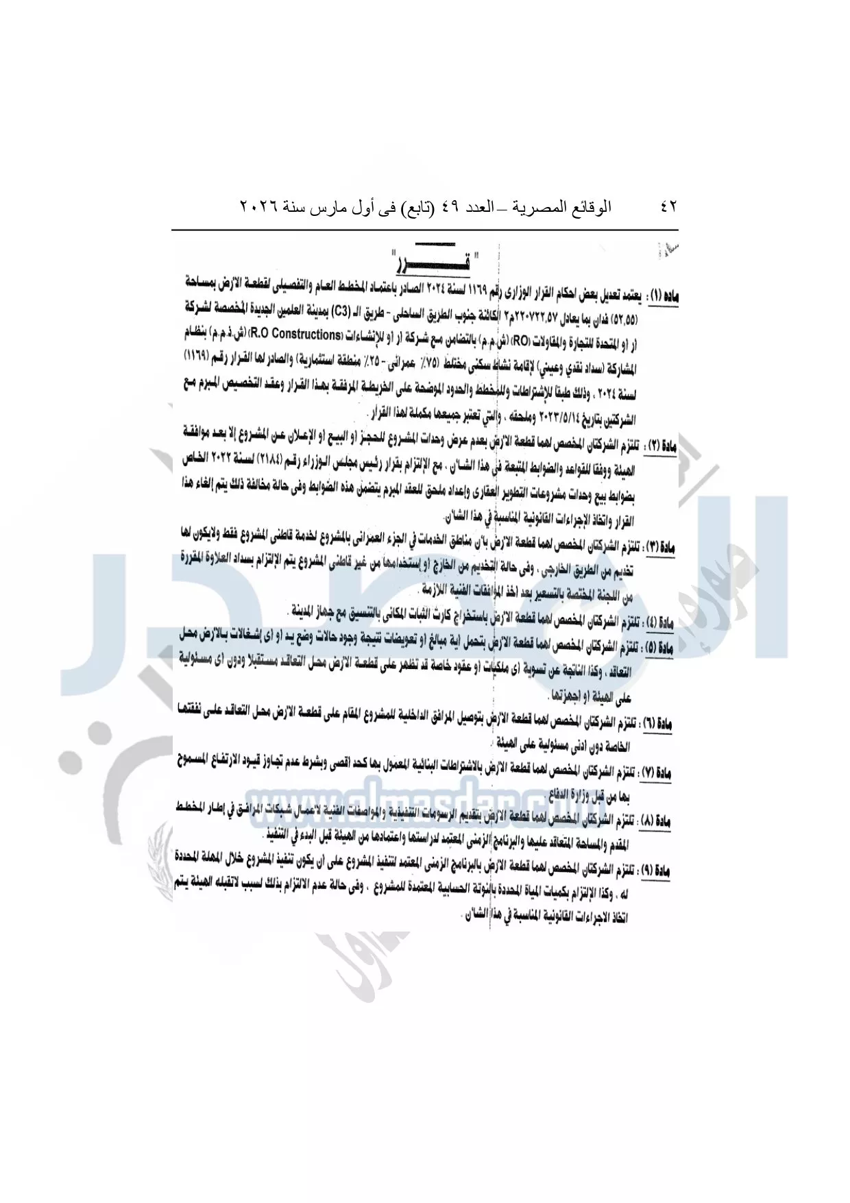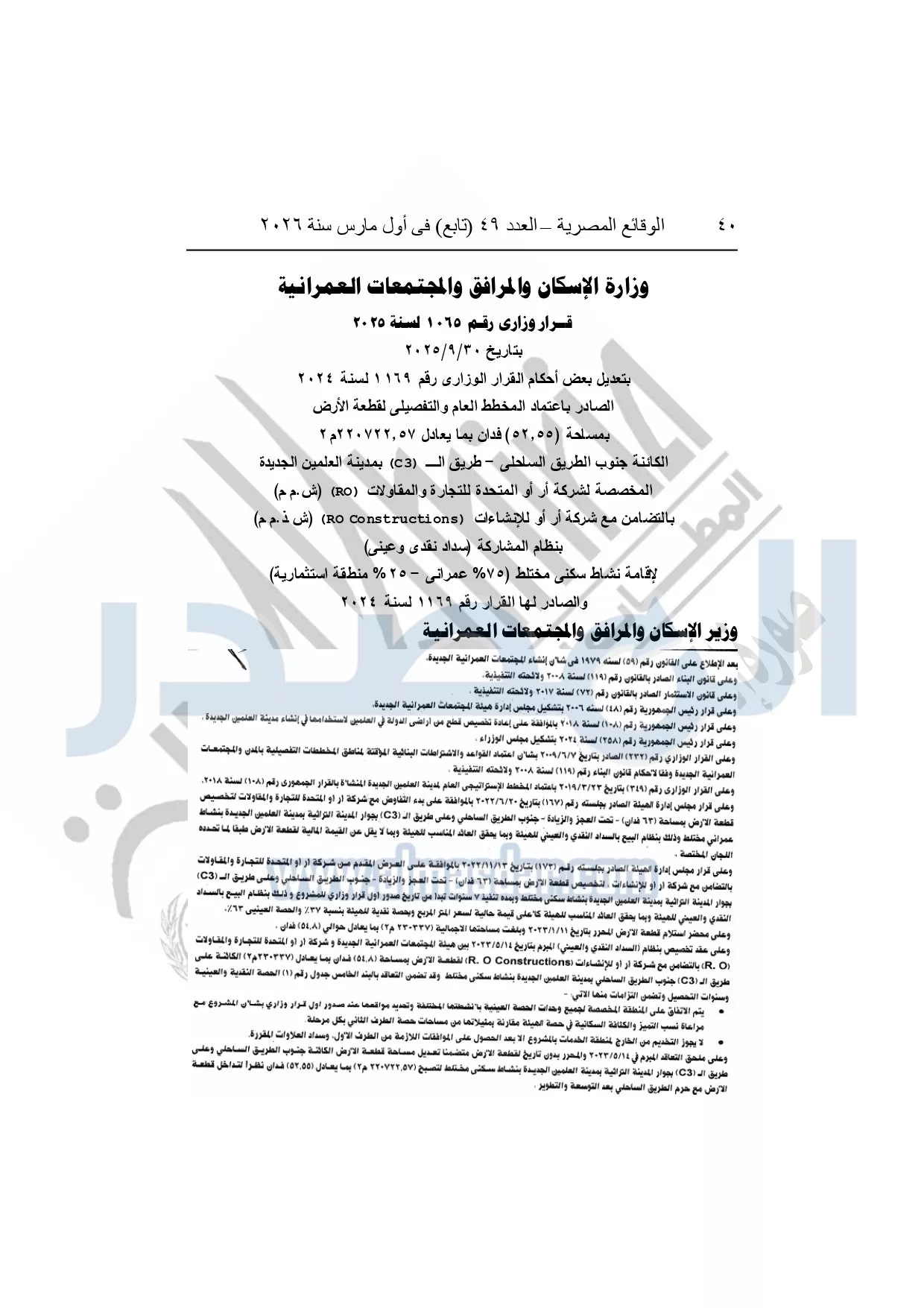 نشرت الوقائع المصرية، في العدد 49 "تابع"، الصادر في أول مارس سنة 2026، قرار وزارة الإسكان والمرافق والمجتمعات العمرانية، رقم 1065 لسنة 2025، بتاريخ 30-9-2025، بشأن تعديل بعض أحكام القرار الوزارى رقم 1169 لسنة 2024، الصادر باعتماد المخطط العام والتفصيلي لقطعة الأرض بمسلحة "52.55" فدان بما يعادل 220722.57م2 الكائنة جنوب الطريق الساحلي - طريق الـ "C3" بمدينة العلمين الجديدة المخصصة لشركة أر أو المتحدة للتجارة والمقاولات "RO" "ش.م.م" بالتضامن مع شركة أر أو للإنشاءات "Ro constructions" "ش.ذ.م.م" بنظام المشاركة "سداد نقدى وعيني" لإقامة نشاط سكنى مختلط "75% عمرانی – 25% منطقة استثمارية" والصادر لها القرار رقم 1169 لسنة 2024.