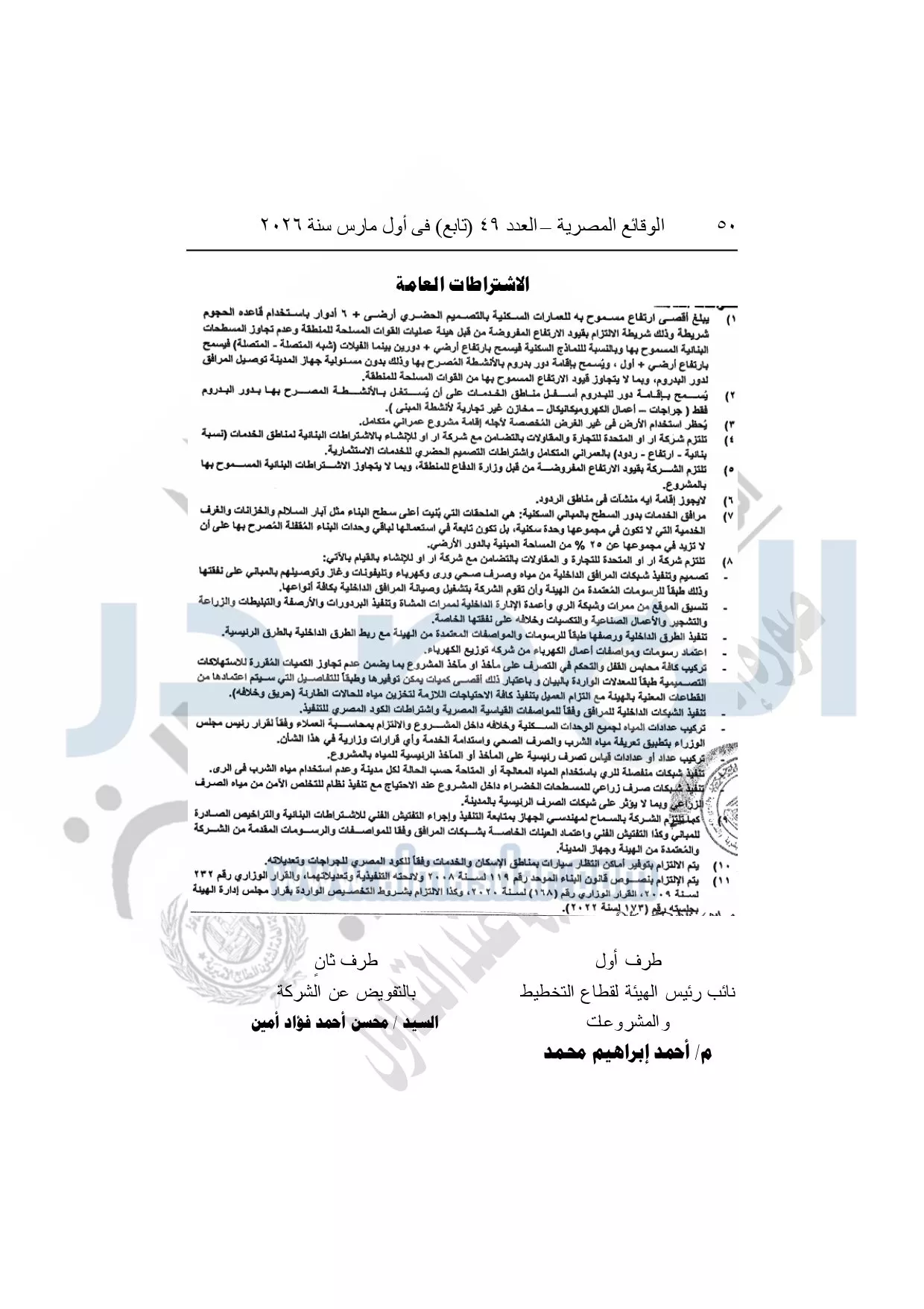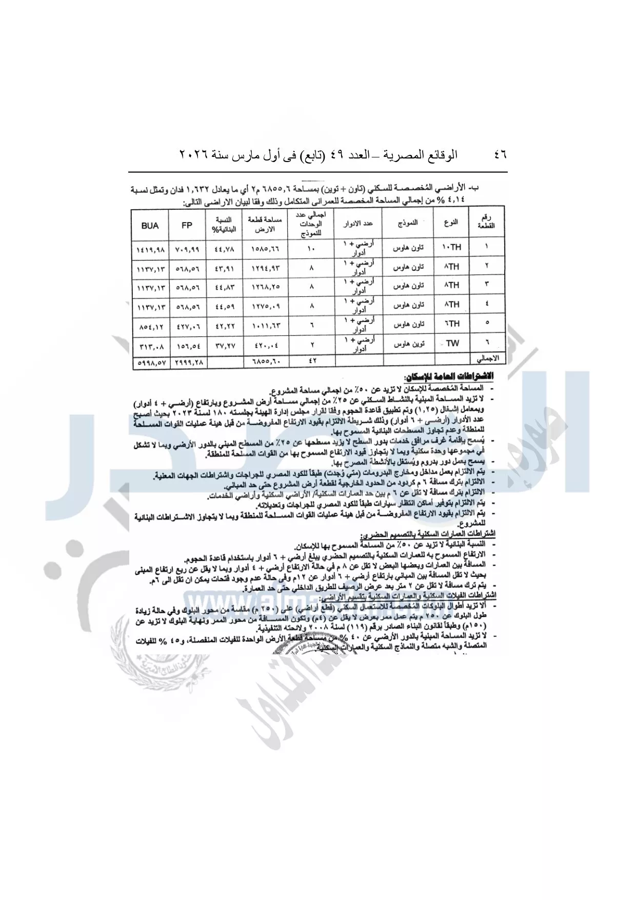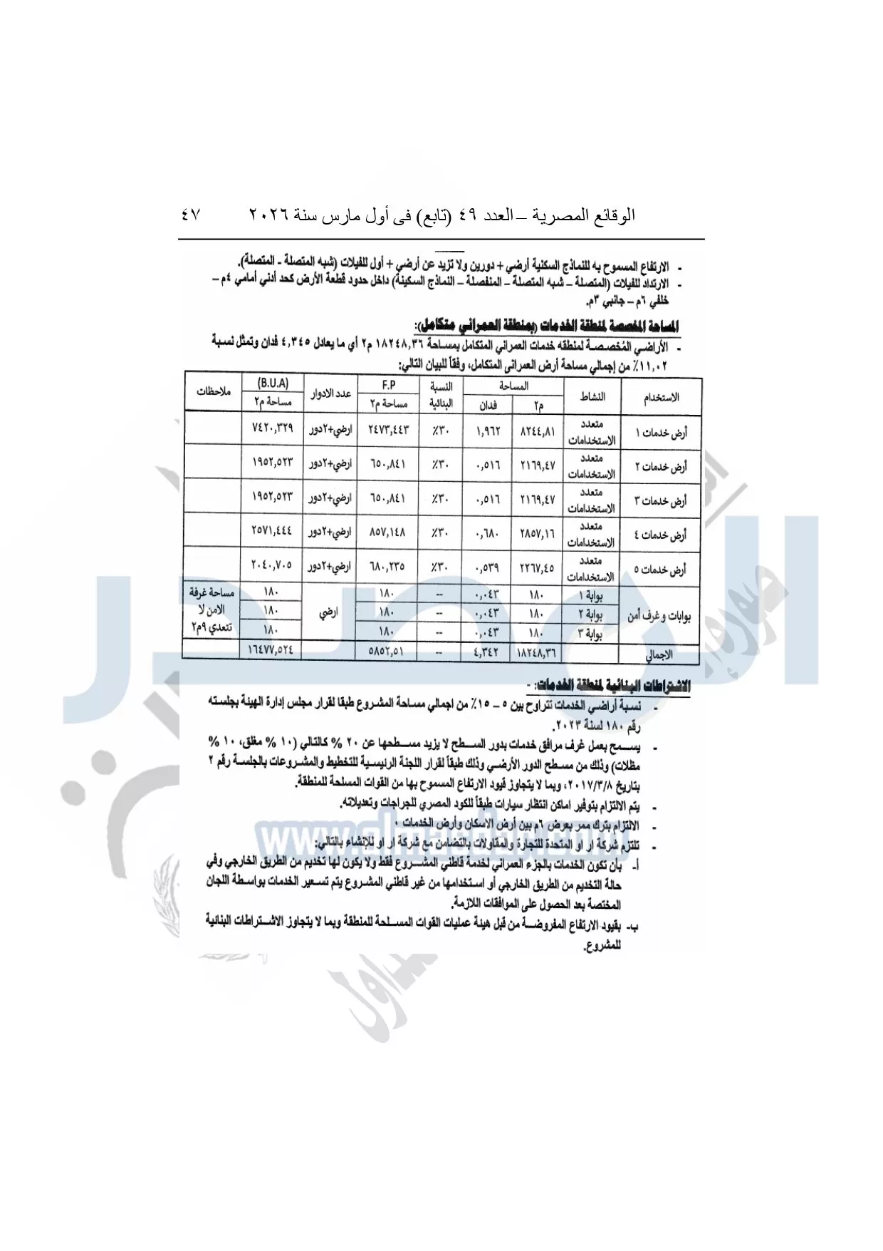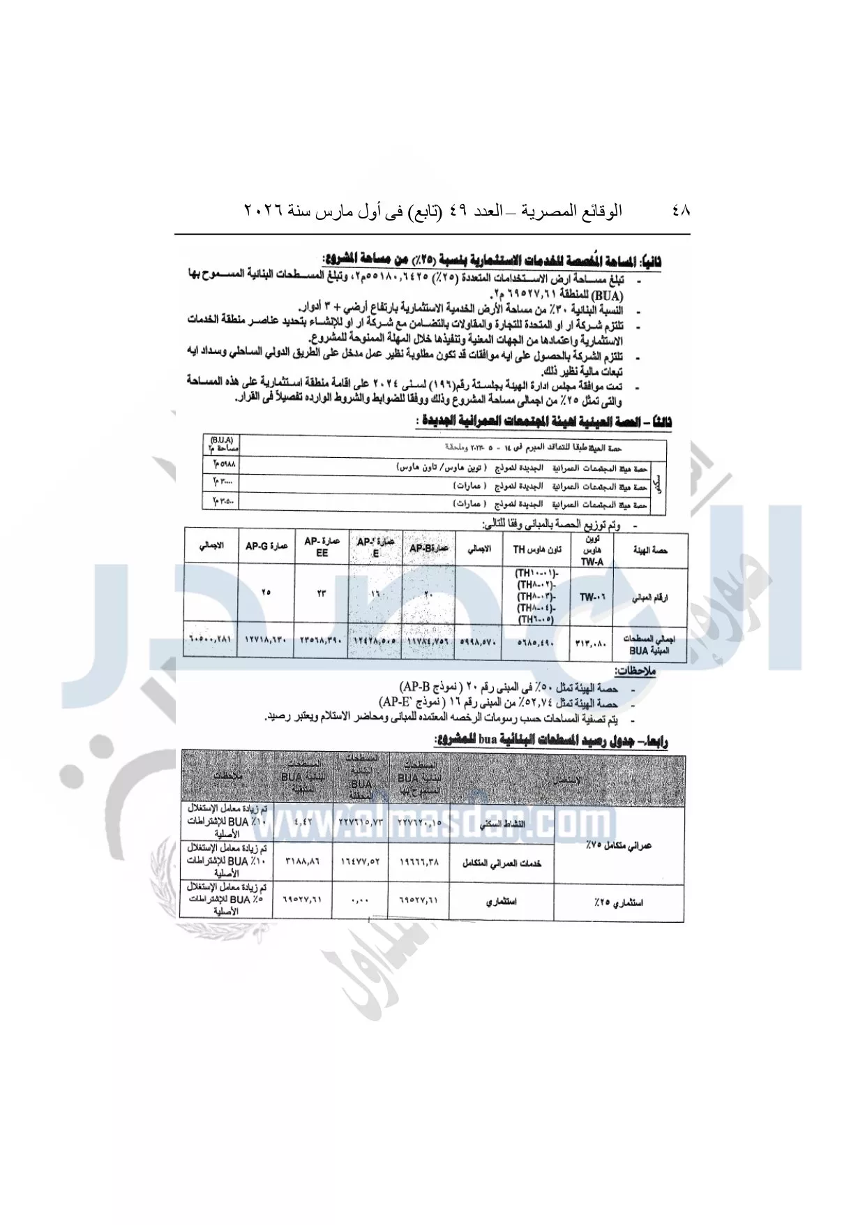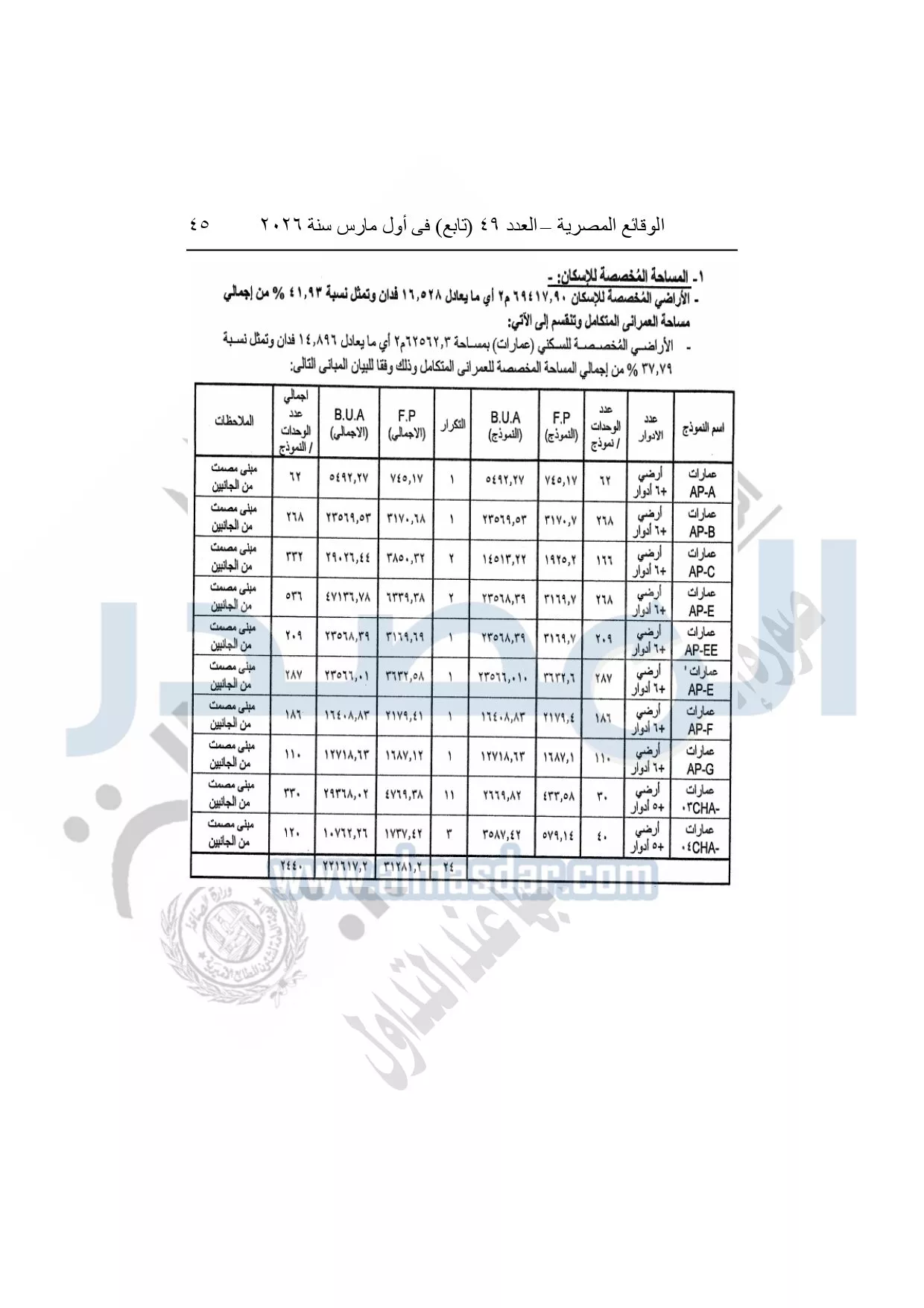 نشرت الوقائع المصرية، في العدد 49 "تابع"، الصادر في أول مارس سنة 2026، قرار وزارة الإسكان والمرافق والمجتمعات العمرانية، رقم 1065 لسنة 2025، بتاريخ 30-9-2025، بشأن تعديل بعض أحكام القرار الوزارى رقم 1169 لسنة 2024، الصادر باعتماد المخطط العام والتفصيلي لقطعة الأرض بمسلحة "52.55" فدان بما يعادل 220722.57م2 الكائنة جنوب الطريق الساحلي - طريق الـ "C3" بمدينة العلمين الجديدة المخصصة لشركة أر أو المتحدة للتجارة والمقاولات "RO" "ش.م.م" بالتضامن مع شركة أر أو للإنشاءات "Ro constructions" "ش.ذ.م.م" بنظام المشاركة "سداد نقدى وعيني" لإقامة نشاط سكنى مختلط "75% عمرانی – 25% منطقة استثمارية" والصادر لها القرار رقم 1169 لسنة 2024.