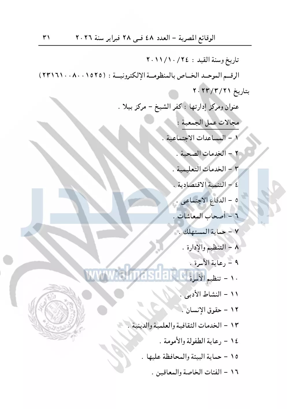 نشرت الوقائع المصرية في العدد 48، بتاريخ 28 فبراير 2026، قرار مديرية التضامن الاجتماعي بكفر الشيخ، بشأن توفيق أوضاع جمعية أنصار السنة المحمدية – فرع بيلا، المقيدة برقم "1602" بتاريخ 24-10-2011.