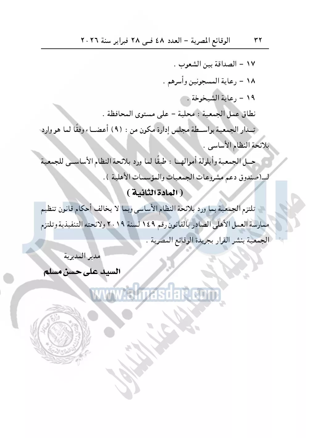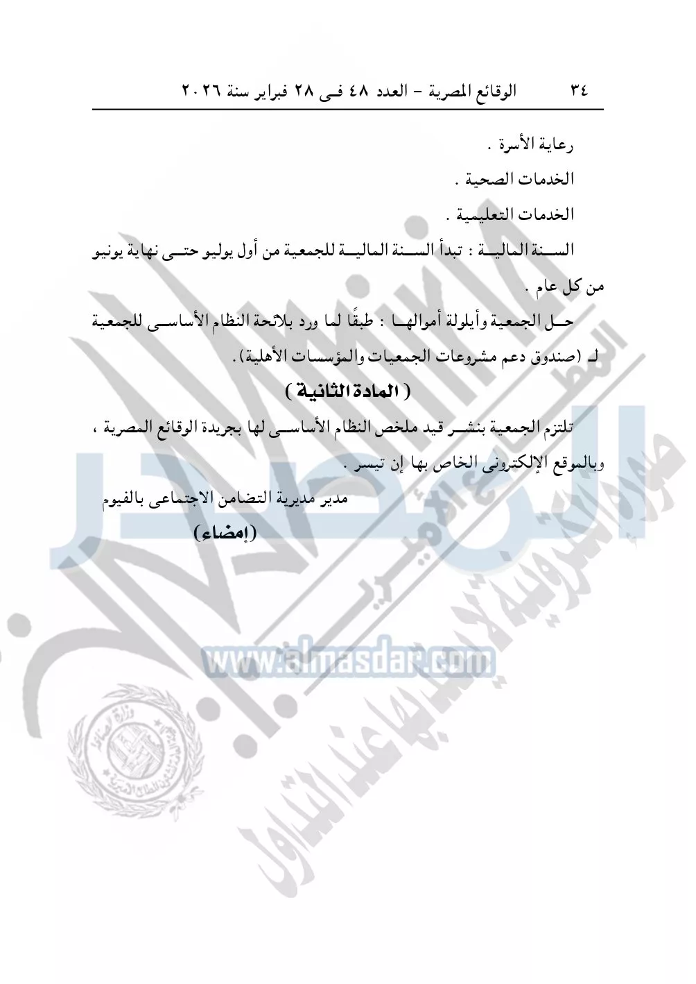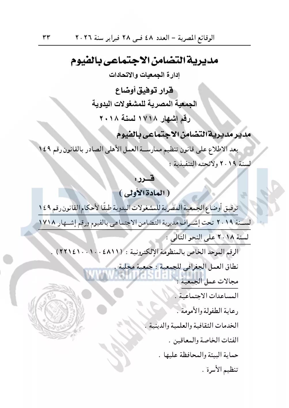 كما نشرت الوقائع المصرية في العدد 48، بتاريخ 28 فبراير 2026، قرار مديرية التضامن الاجتماعي بالفيوم، بشأن توفيق أوضاع الجمعية المصرية للمشغولات اليدوية، المقيدة برقم "1718" لسنة 2018.