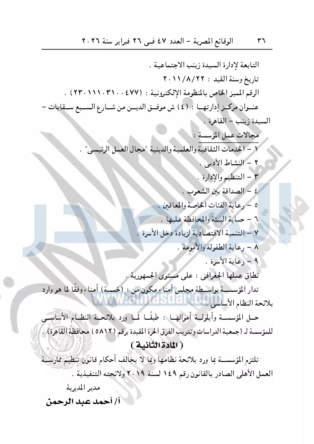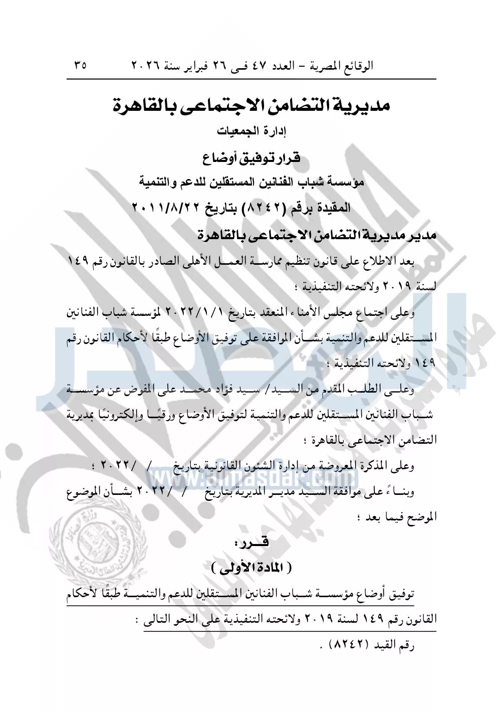 وأيضا نشرت الوقائع المصرية في العدد 47، بتاريخ 26 فبراير 2026، قرار مديرية التضامن الاجتماعي بالقاهرة، بشأن توفيق أوضاع مؤسسة الفنانين المستقلين للدعم والتنمية، المقيدة برقم "8242" بتاريخ 22-8-2011.