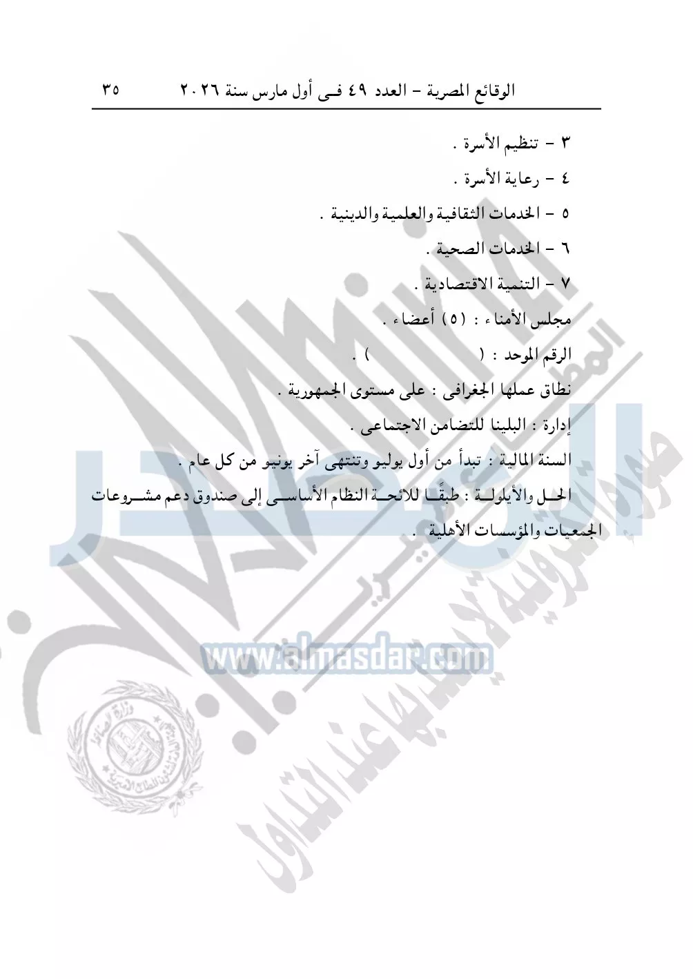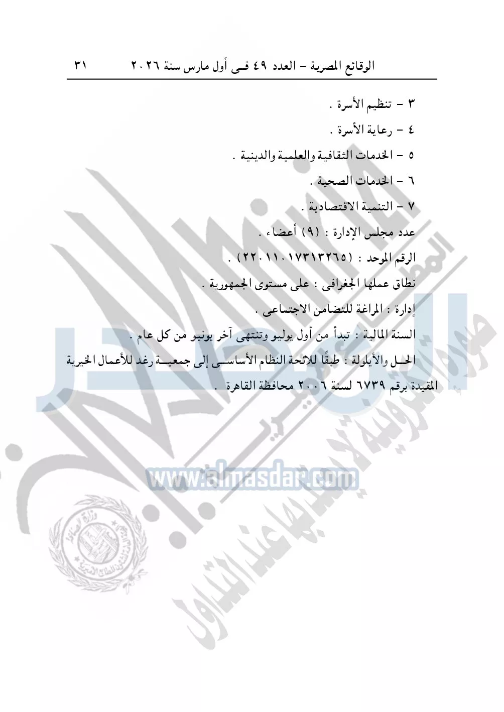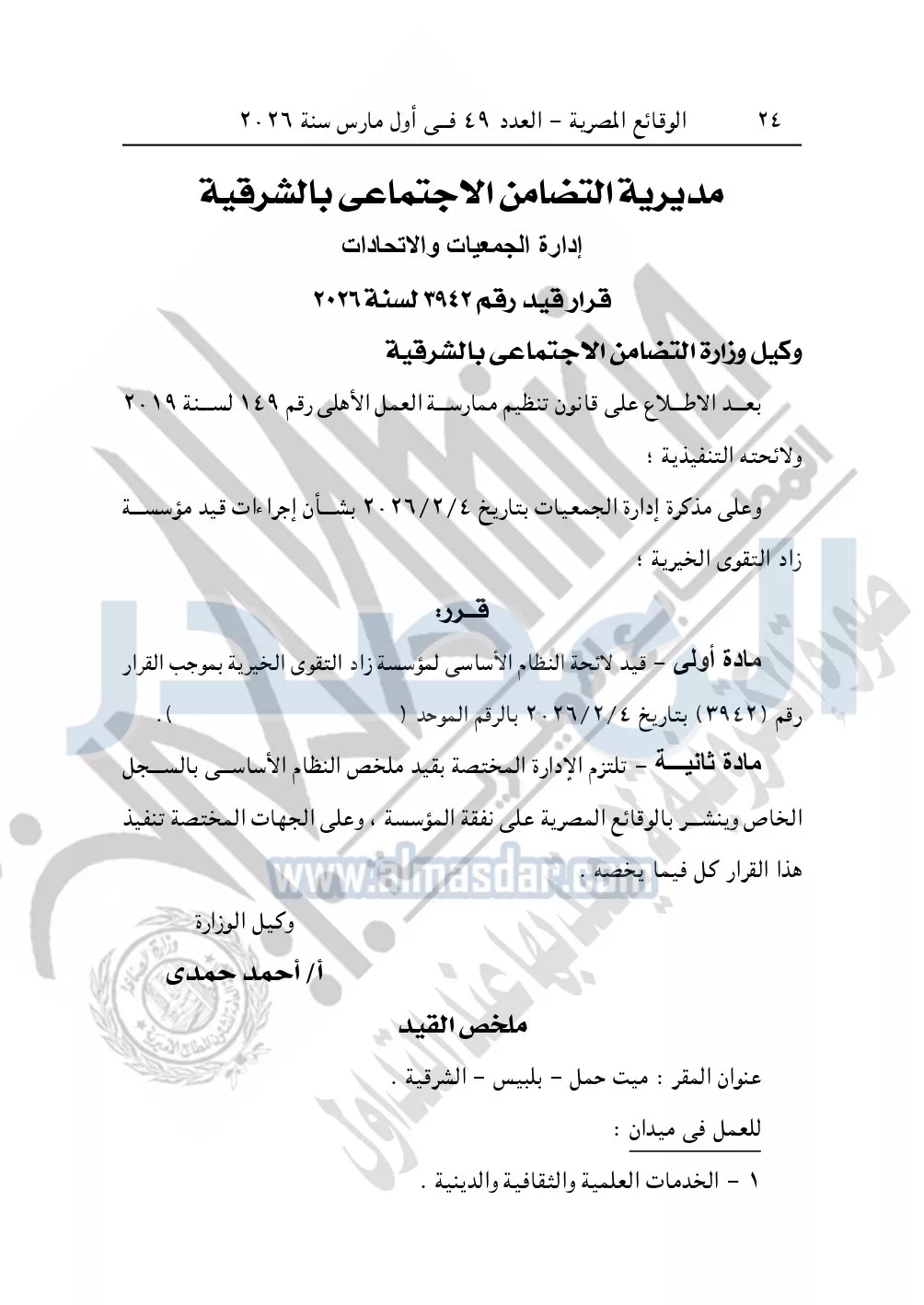 نشرت الوقائع المصرية، في العدد 49، بتاريخ أول مارس 2026، قرار مديرية التضامن الاجتماعي بالشرقية، قيد رقم 3942 لسنة 2026، بشأن قيد مؤسسة زاد التقوى الخيرية.