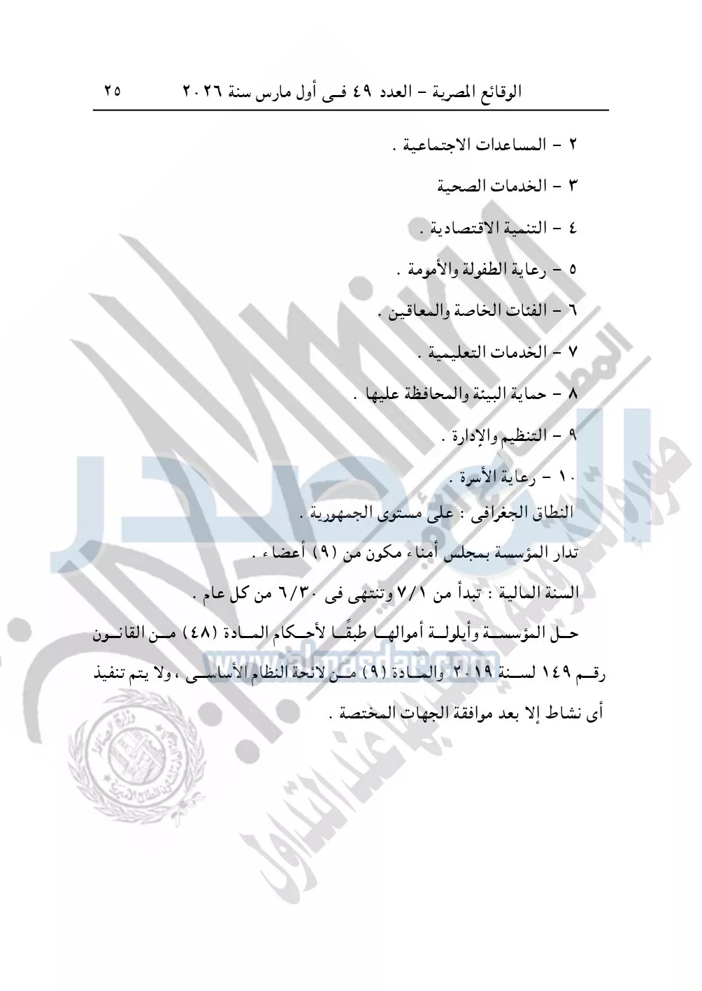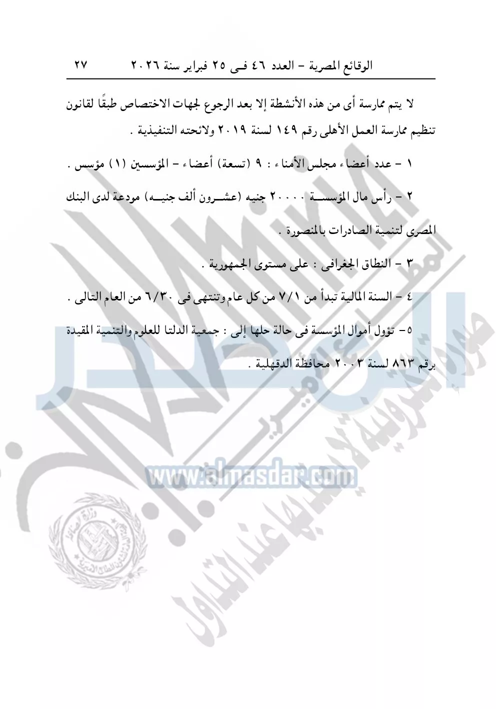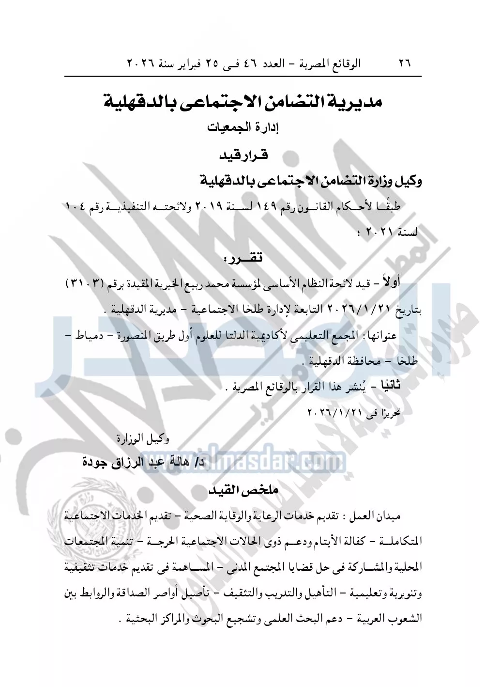 ونشرت الوقائع المصرية، في العدد 46، بتاريخ 25 فبراير 2026، قرار مديرية التضامن الاجتماعي بالدقهلية، قيد رقم 3103 بشأن قيد مؤسسة محمد ربيع الخيرية.
