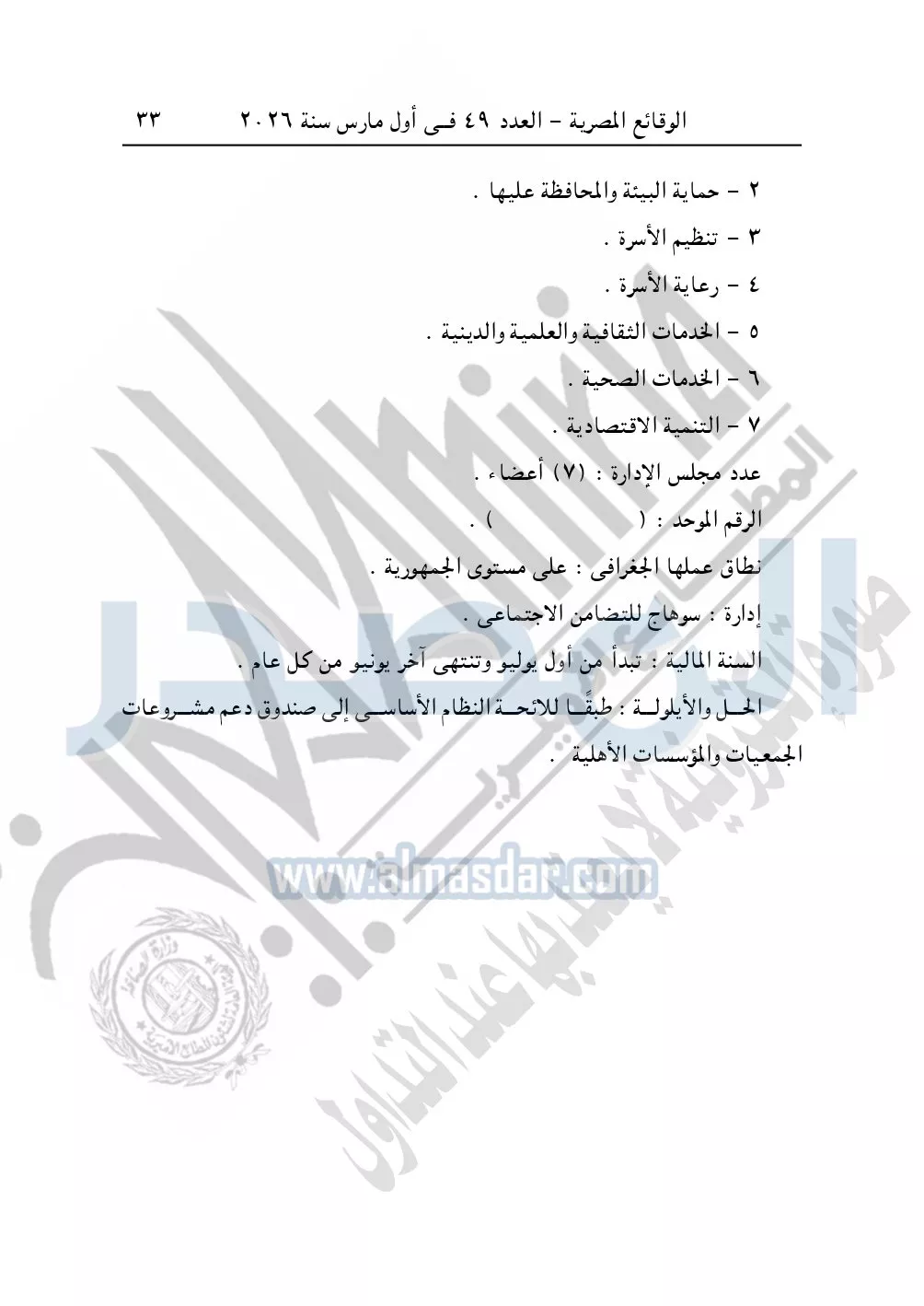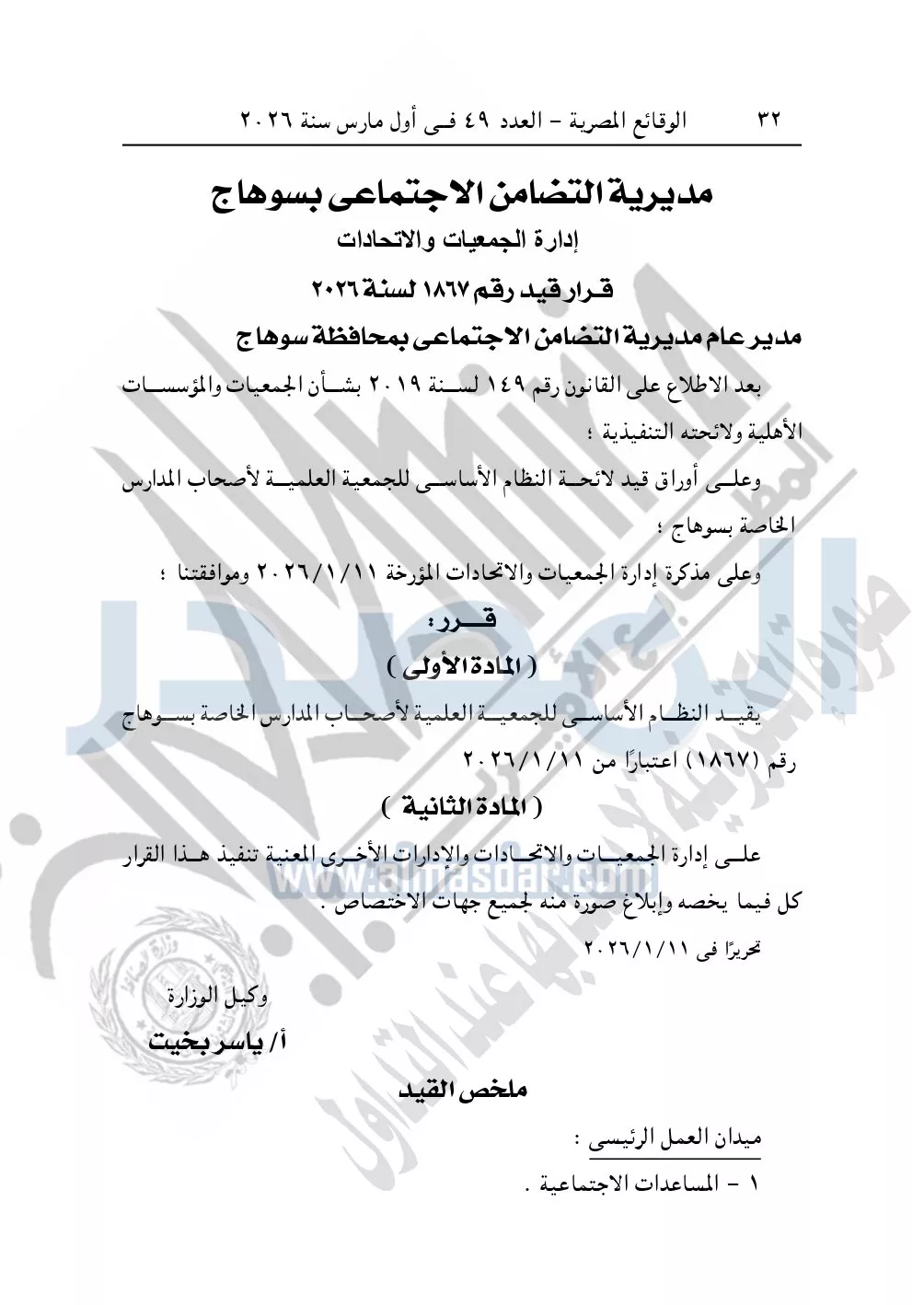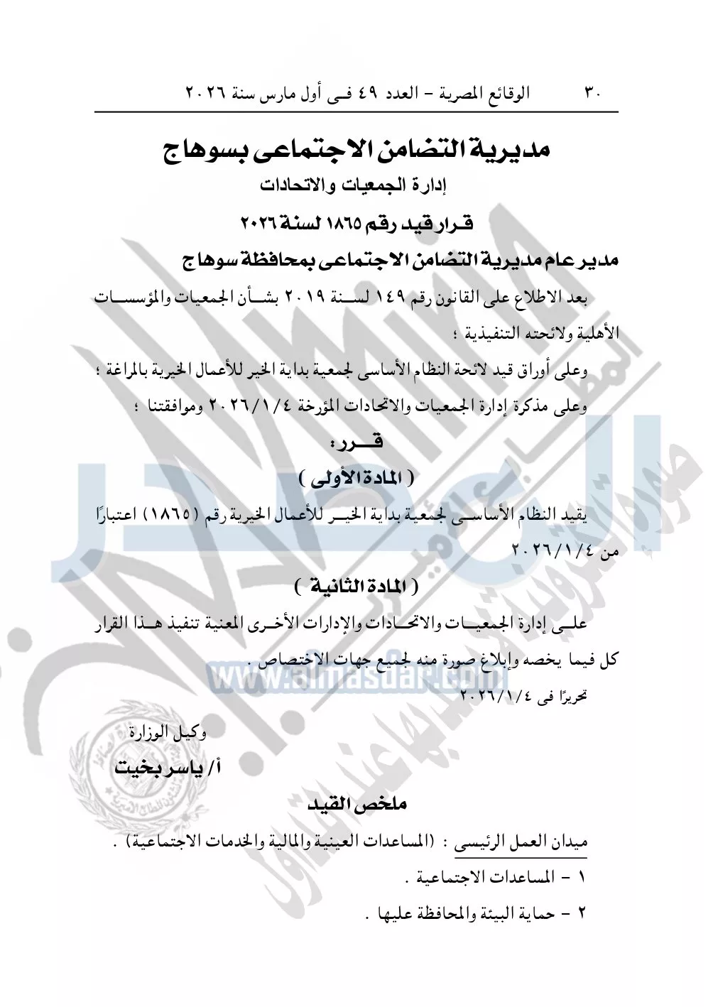 كما نشرت الوقائع المصرية، في العدد 49، بتاريخ أول مارس 2026، قرار مديرية التضامن الاجتماعي بسوهاج، قيد رقم 1865 لسنة 2026، بشأن قيد جمعية بداية الخير للأعمال الخيرية.