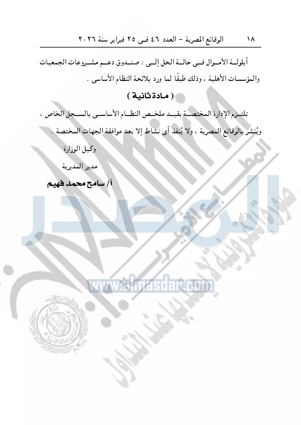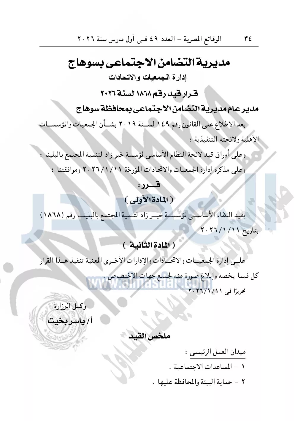 ونشرت الوقائع المصرية، في العدد 49، بتاريخ أول مارس 2026، قرار مديرية التضامن الاجتماعي بسوهاج، قيد رقم 1868 لسنة 2026، بشأن قيد مؤسسة خير زاد لتنمية المجتمع بالبلينا.
