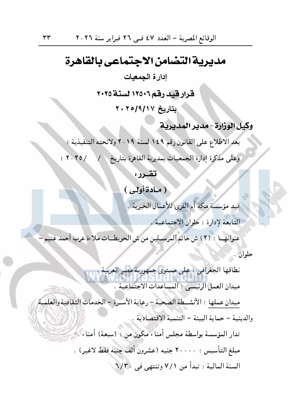 كما نشرت الوقائع المصرية، في العدد 47، بتاريخ 26 فبراير 2026، قرار مديرية التضامن الاجتماعي بالقاهرة، قيد رقم 12506 لسنة 2026، بتاريخ 17-9-2025، بشأن قيد مؤسسة مكة أم القرى للأعمال الخيرية.