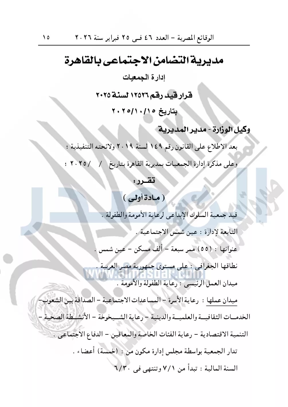 وأيضا نشرت الوقائع المصرية، في العدد 46، بتاريخ 25 فبراير 2026، قرار مديرية التضامن الاجتماعي بالقاهرة، قيد رقم 12526 لسنة 2025، بتاريخ 15-10-2025، بشأن قيد جمعية السلوك الإبداعي لرعاية الأمومة والطفولة.