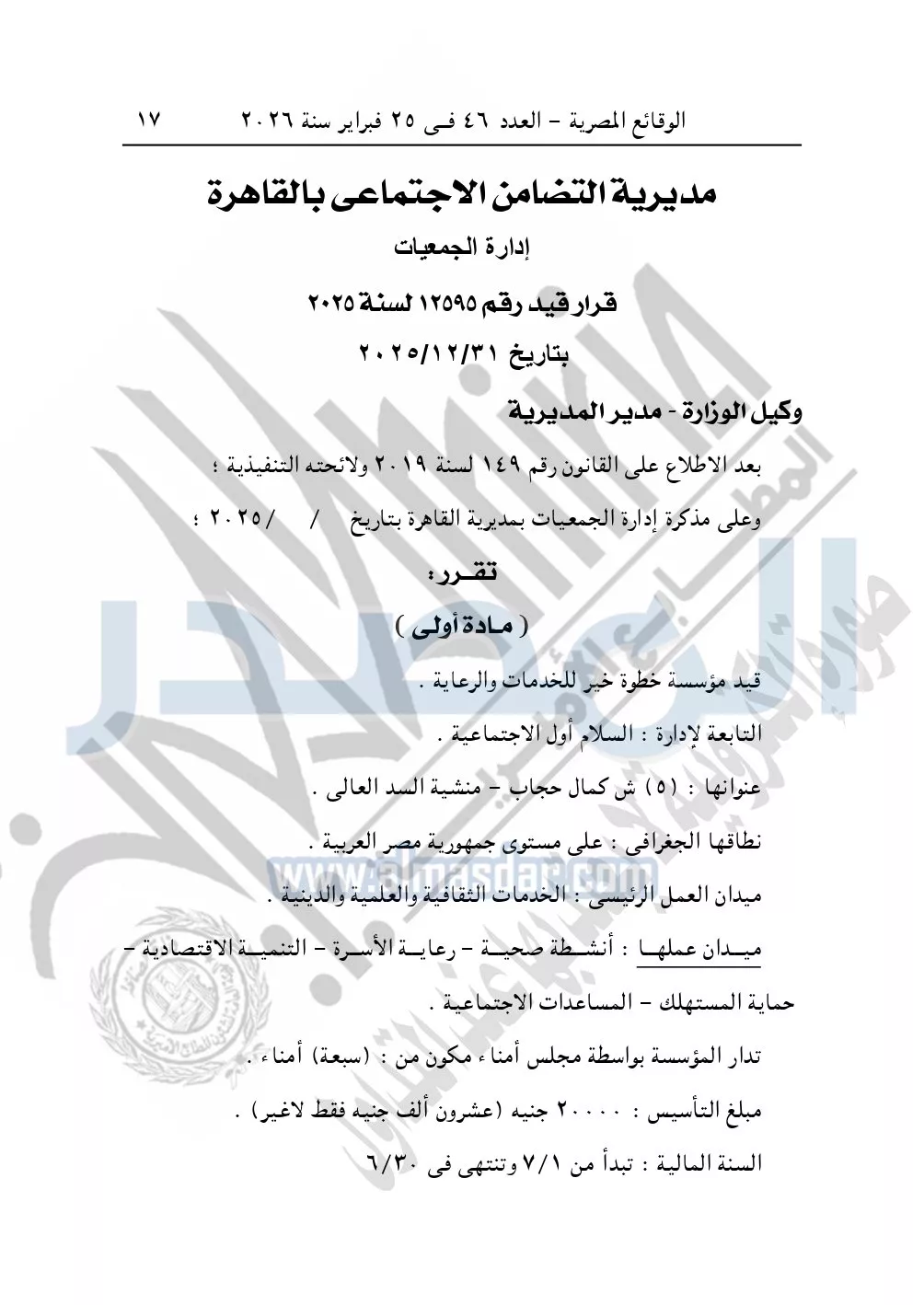 كما نشرت الوقائع المصرية، في العدد 46، بتاريخ 25 فبراير 2026، قرار مديرية التضامن الاجتماعي بالقاهرة، قيد رقم 12595 لسنة 2025، بتاريخ 31-12-2025، بشأن قيد مؤسسة خطوة خير للخدمات والرعاية.