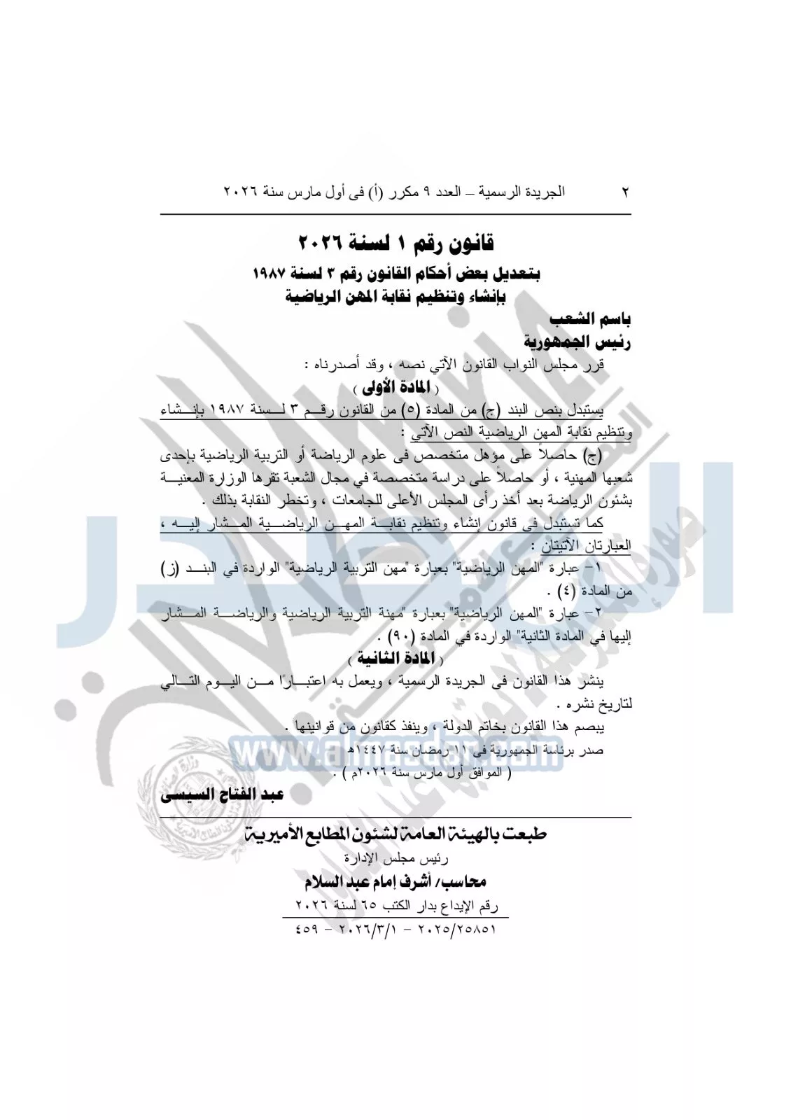 نشرت الجريدة الرسمية، في العدد 9 مكرر "أ"، الصادر فى أول مارس سنة 2026، قرار رئيس الجمهورية، رقم 1 لسنة 2026، بتعديل بعض أحكام القانون رقم 3 لسنة 1987، بشأن إنشاء وتنظيم نقابة المهن الرياضية.